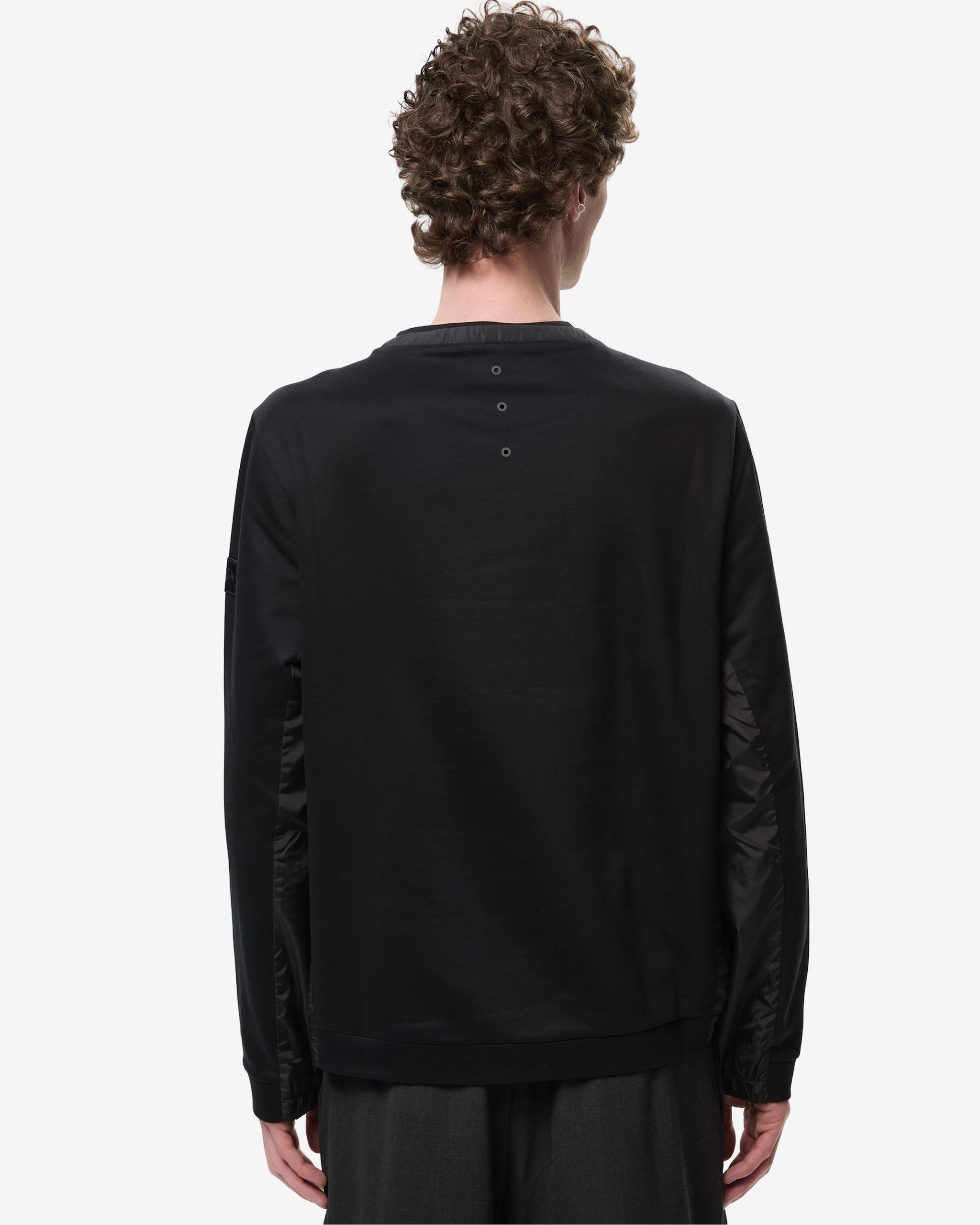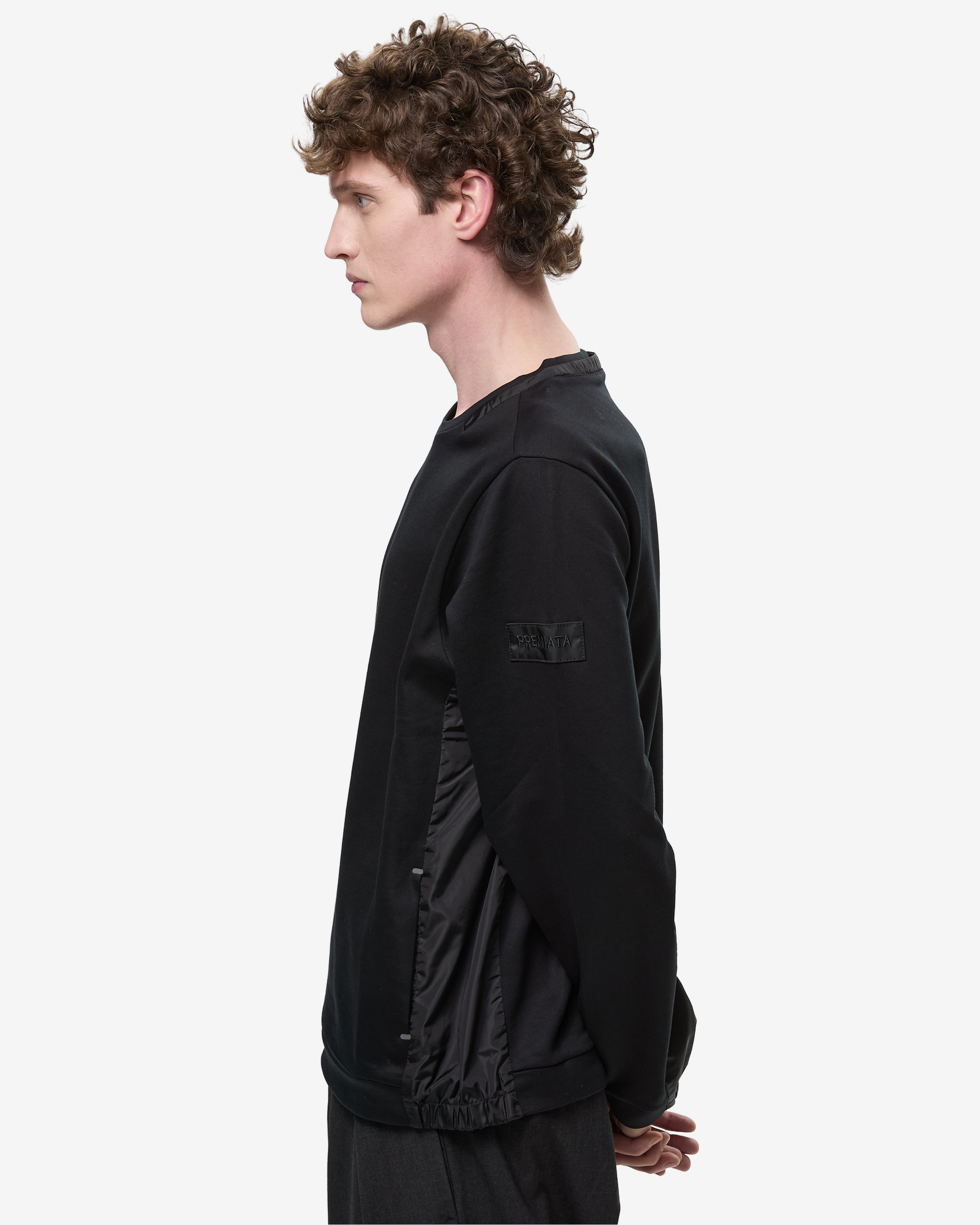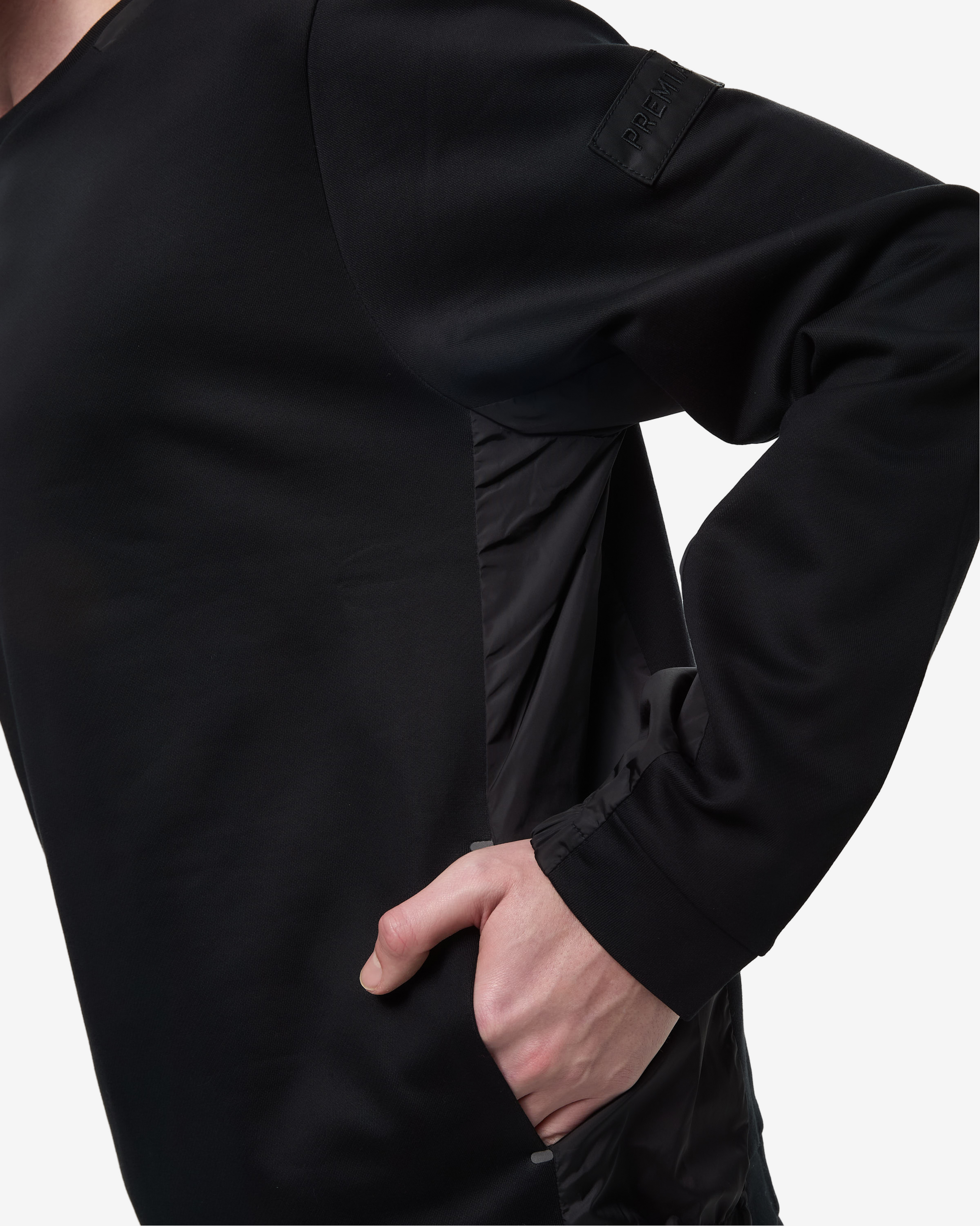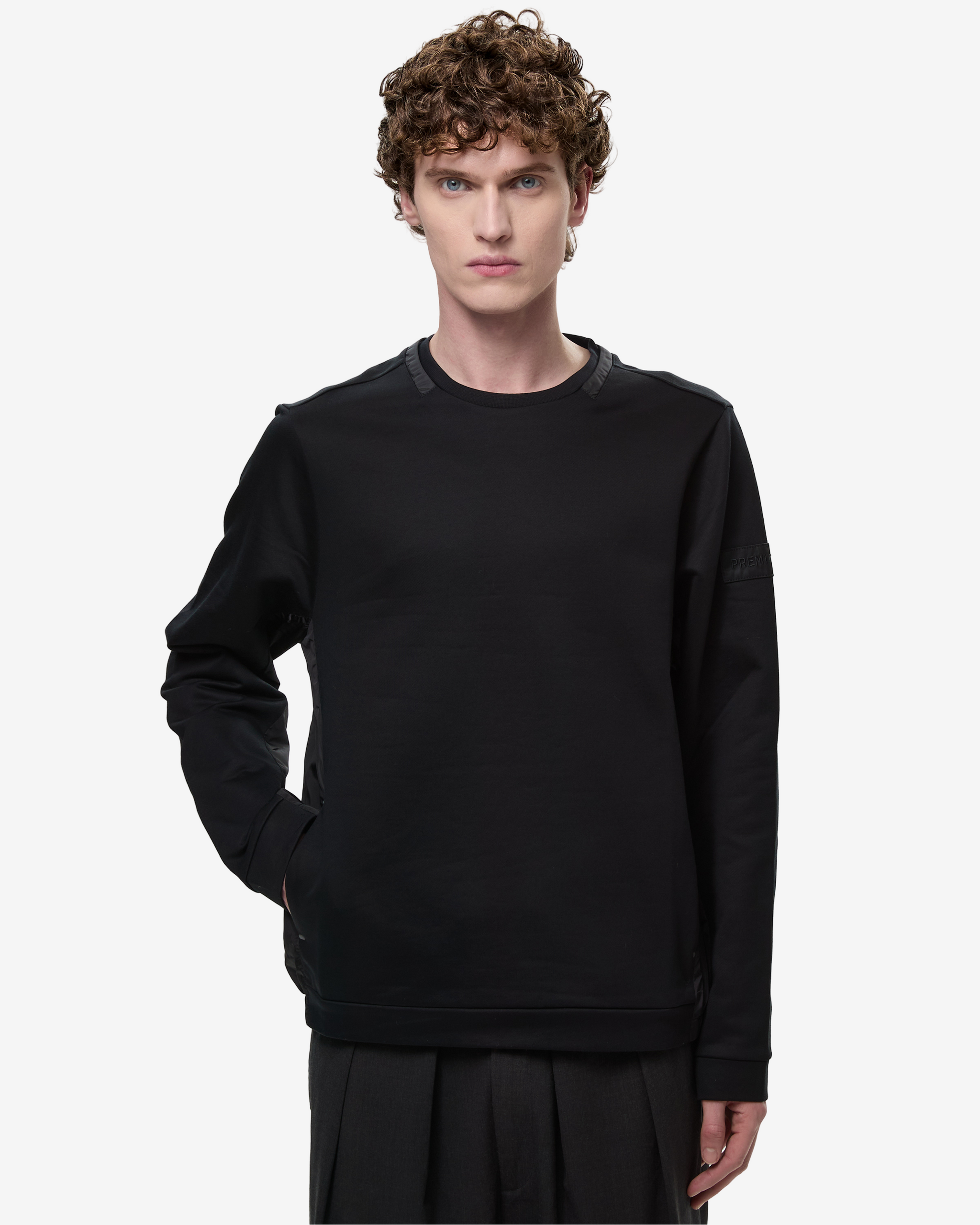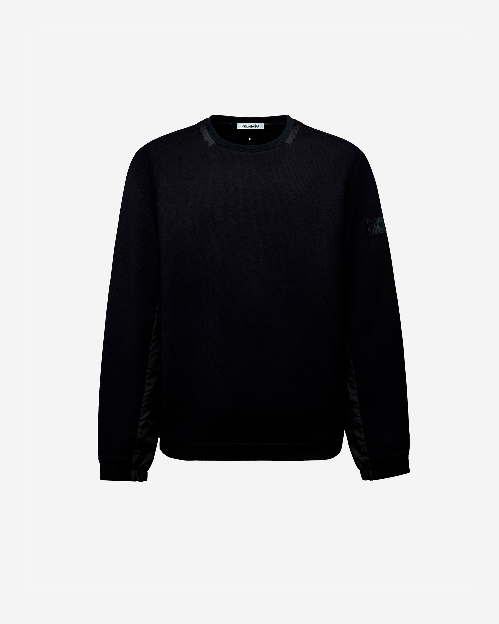 Felpa girocollo in cotone con dettaglio "paneled" nel nostro nylon leggero: pannelli in nylon leggero lungo i fianchi e nel sotto manica. Altro dettaglio in nylon è un sottile doppio collo lungo il bordo di cucitura. Le estremità delle tasche aperte in cucitura tra tessuto felpa e nylon sono segnate da travette transfer in Pu a caldo. Il nostro segno distintivo a 3 fori su centro dietro realizzato a laser e fissato con transfer a caldo in PU, la scritta PREMIATA è ricamata su patch.