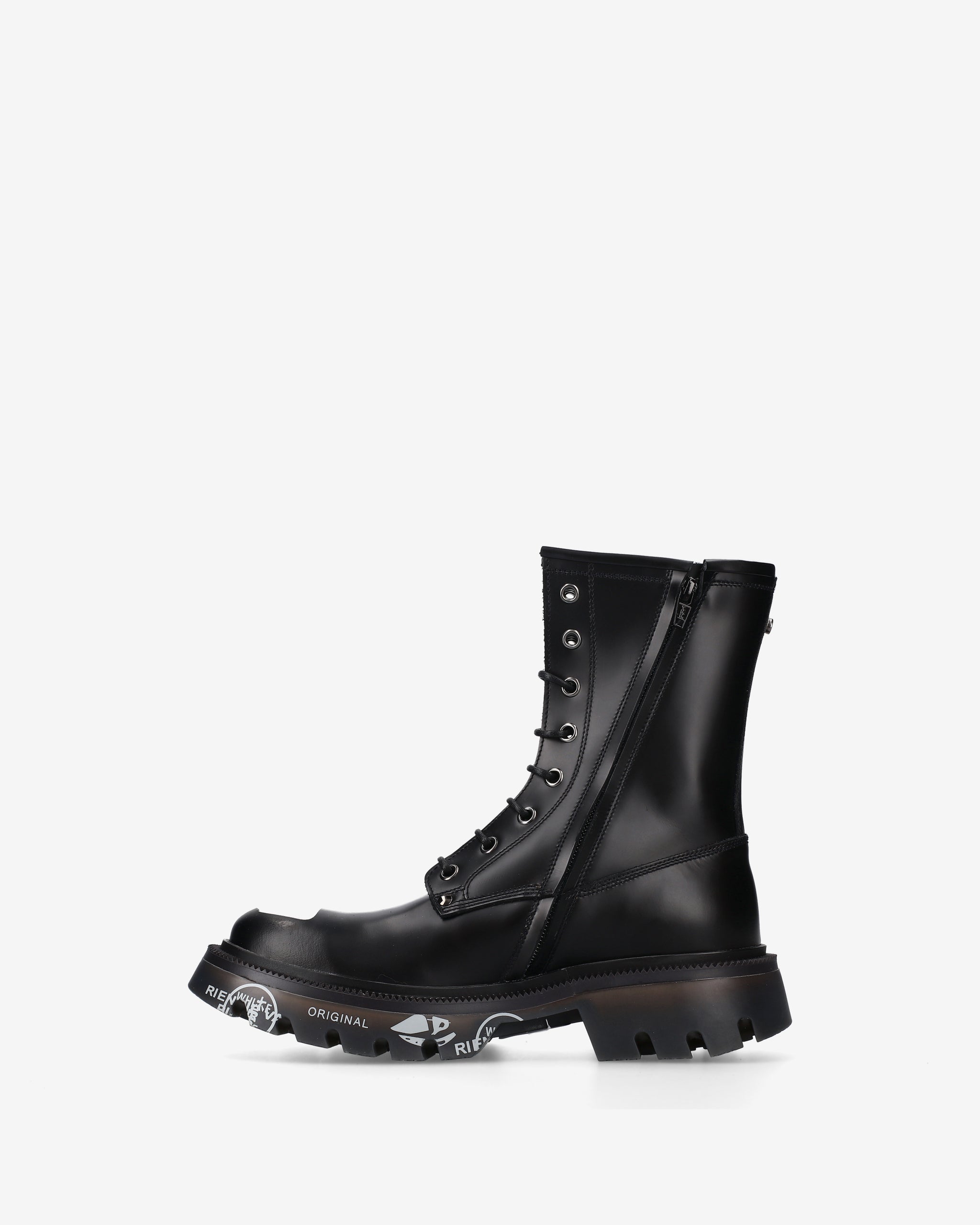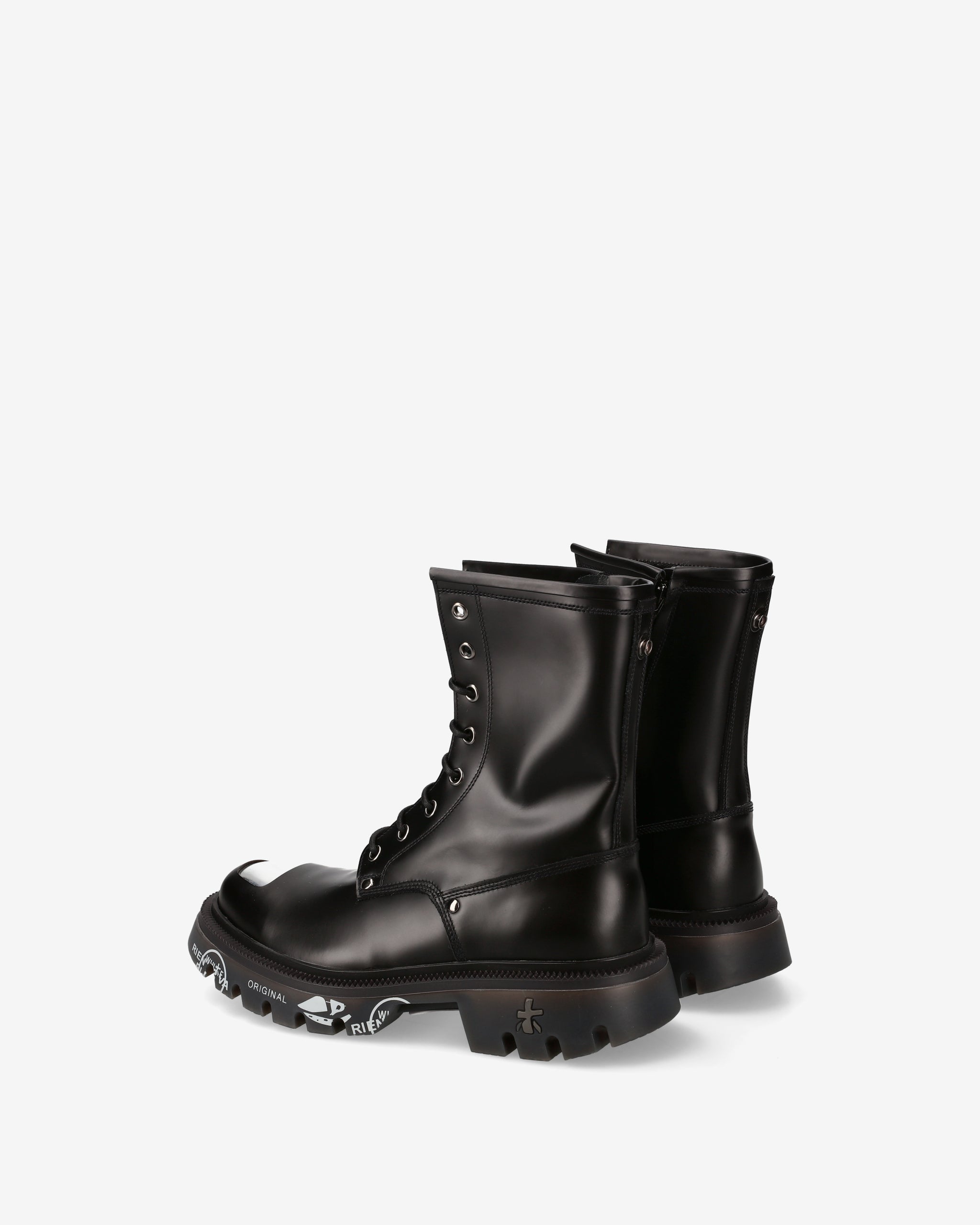 Anfibio in vitello spazzolato nero con puntale e accessori cromati nickel. Un mix di eleganza lucida e dettagli metallici per un look deciso, ispirato all’estetica underground londinese.