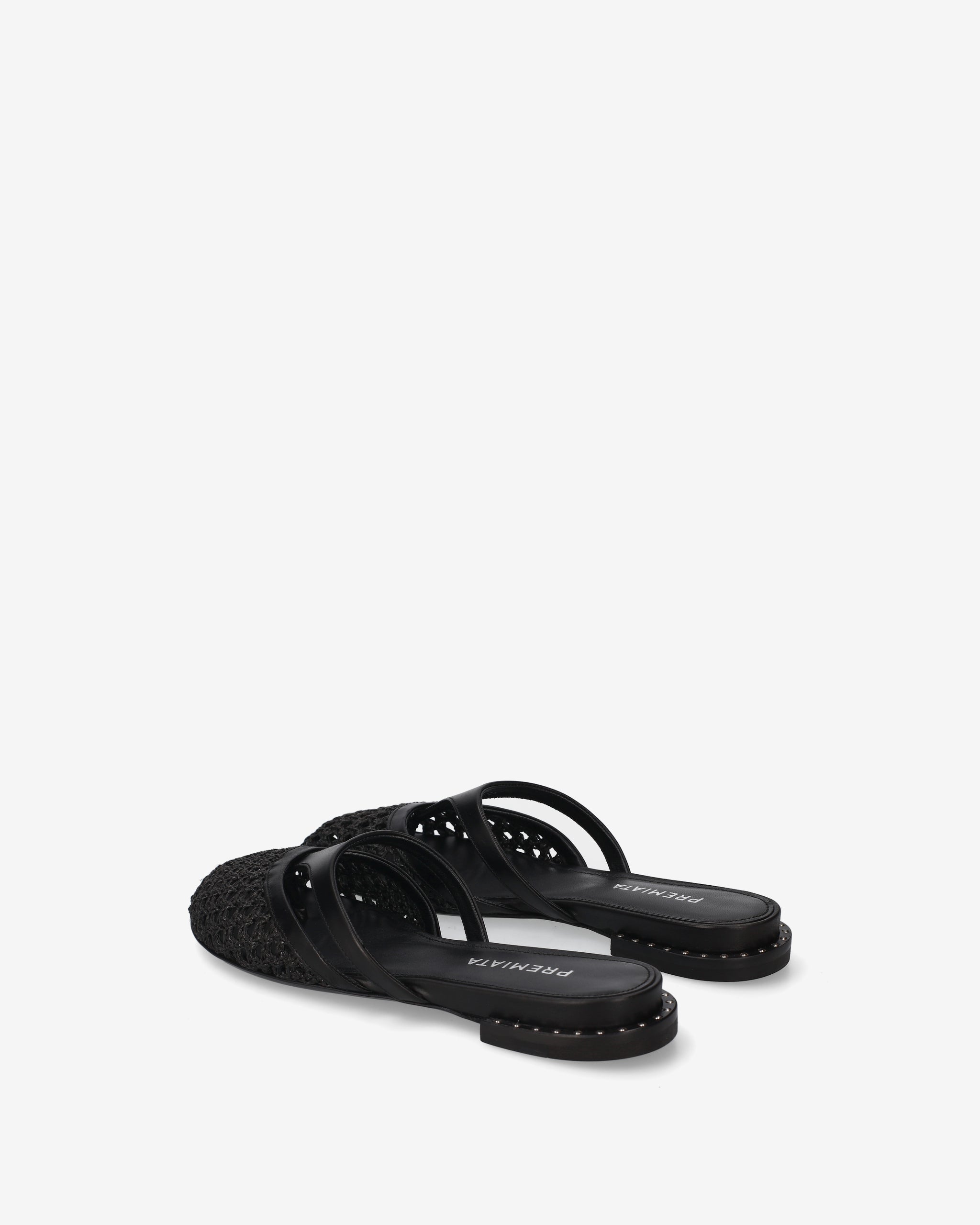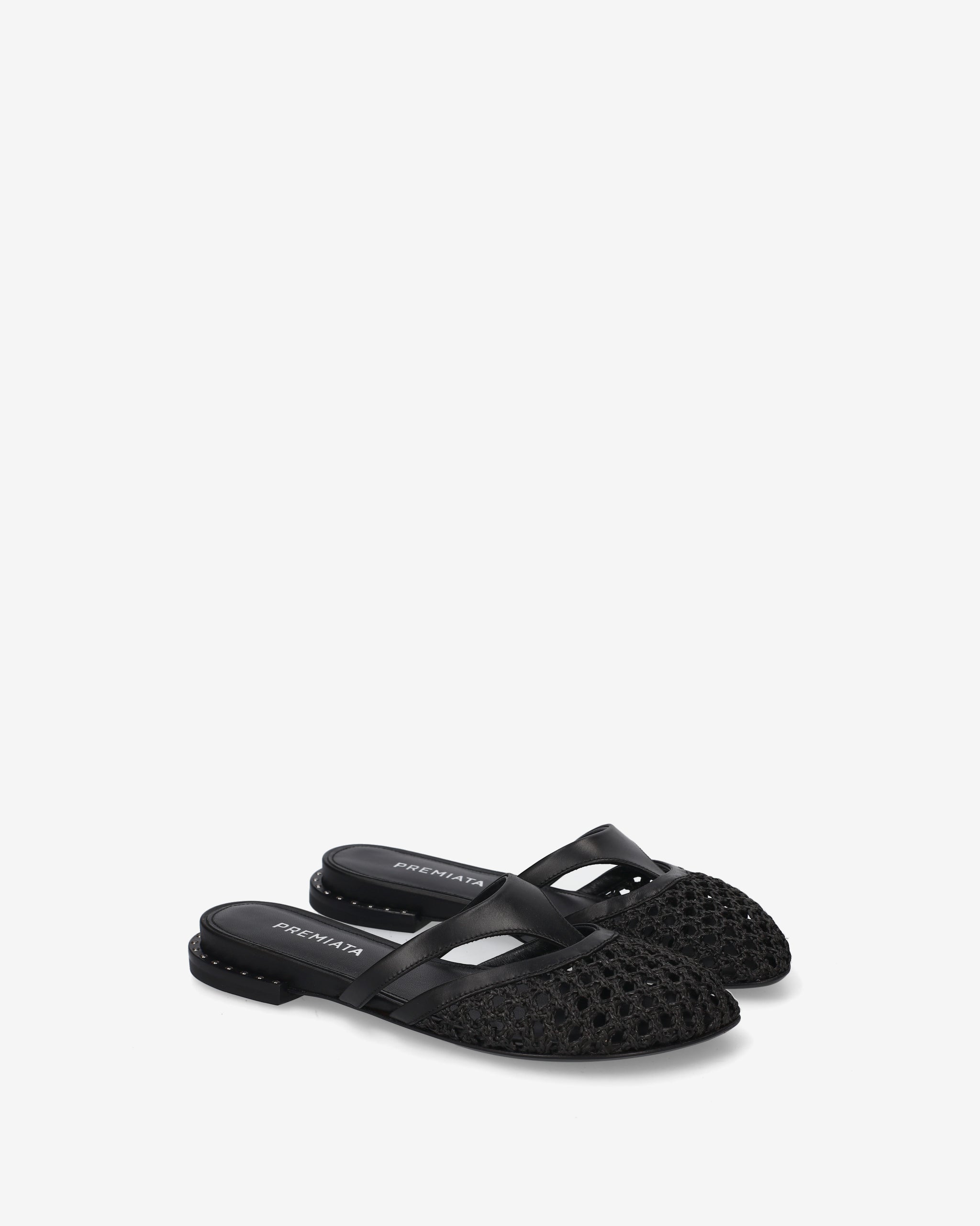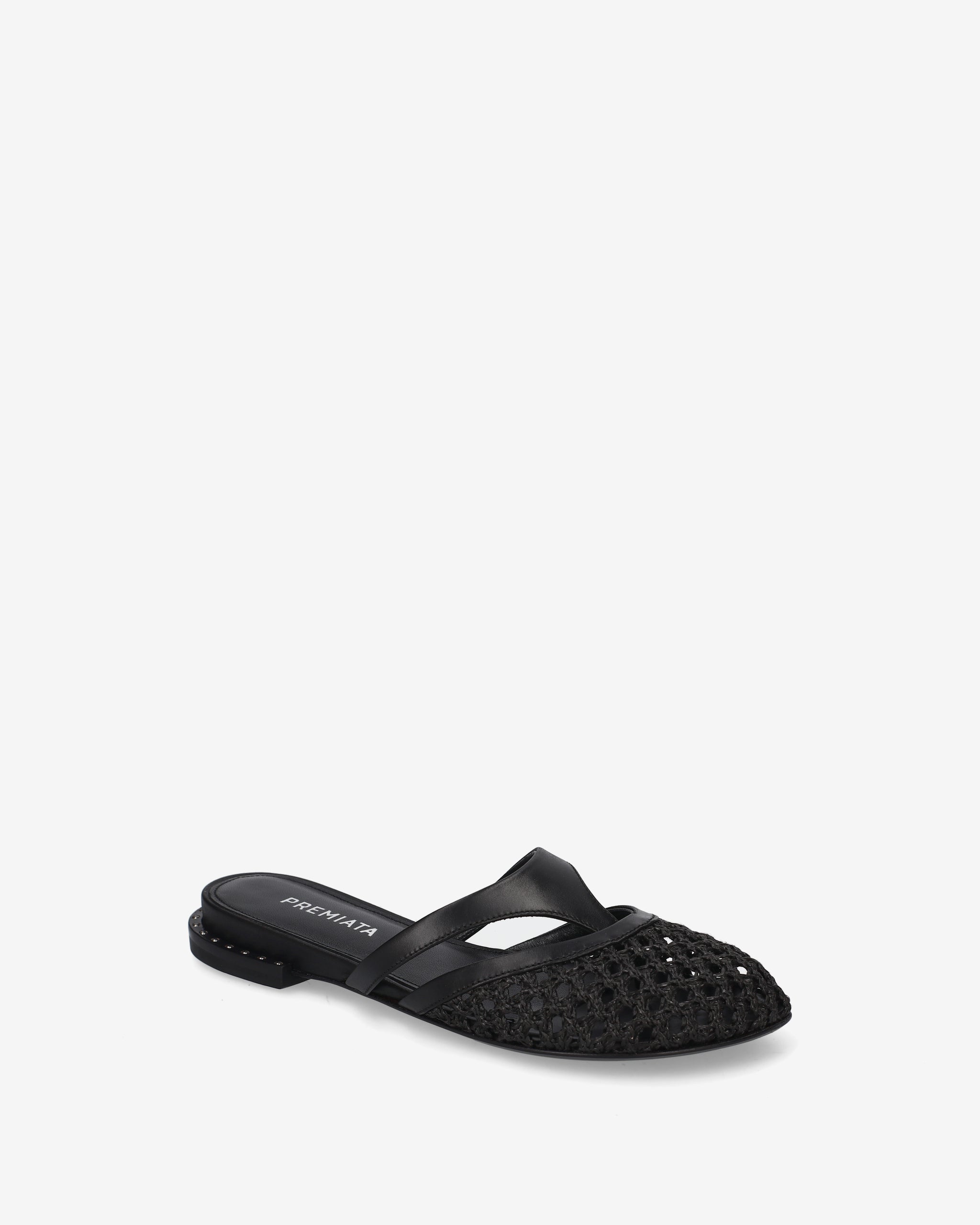 Questo sabot flat combina l'eleganza materica dell'intreccio con un design geometrico a listini. Una calzatura leggera e sofisticata, perfetta per arricchire outfit con un tocco di artigianalità contemporanea.