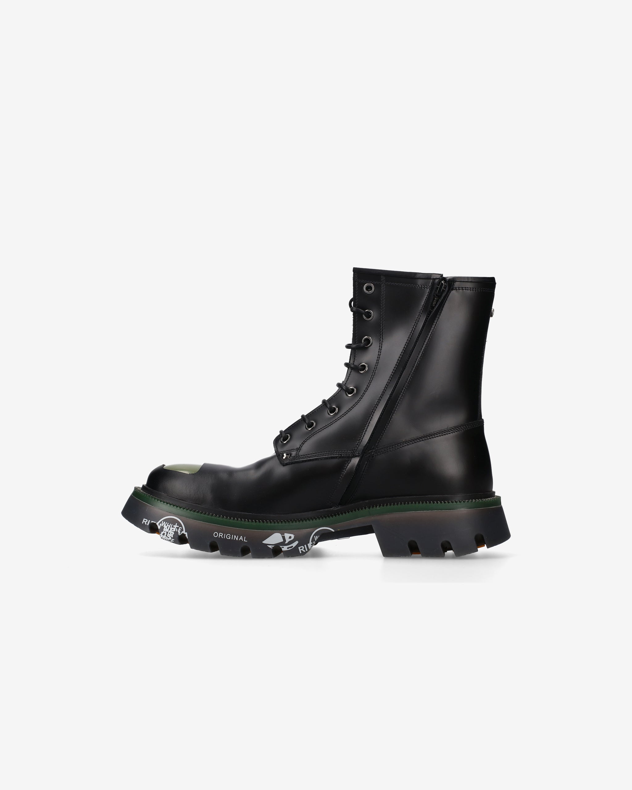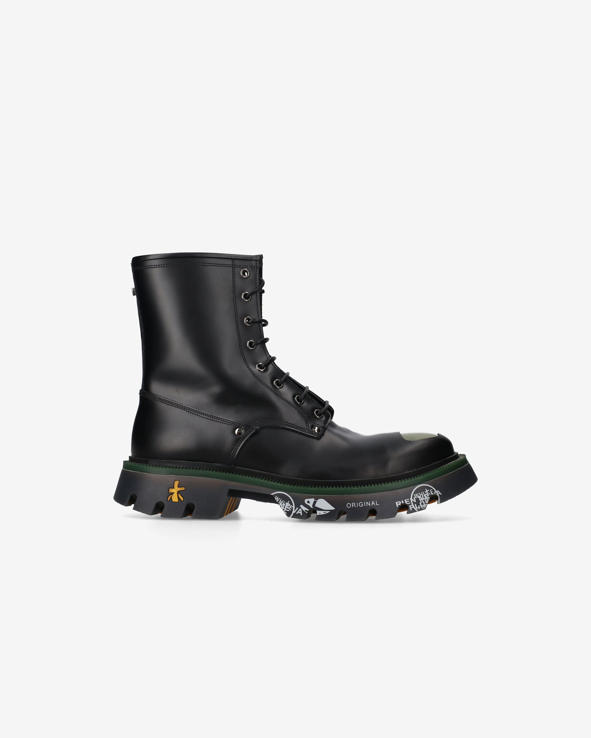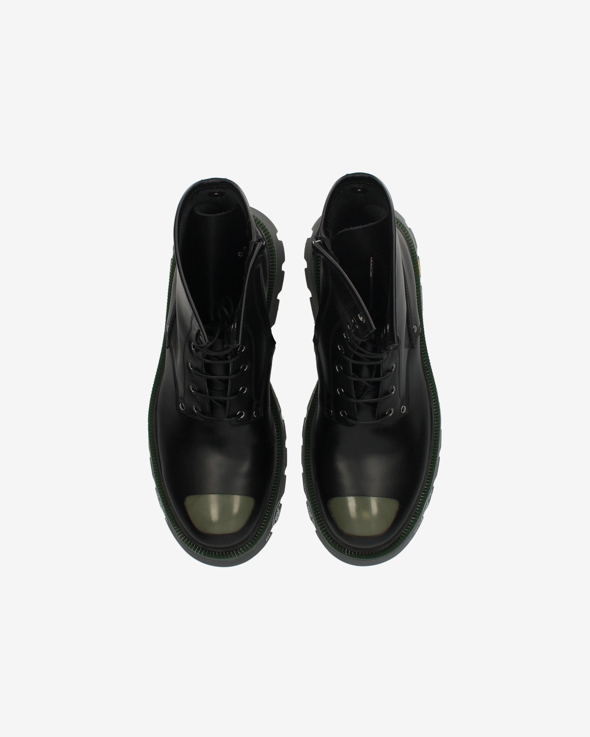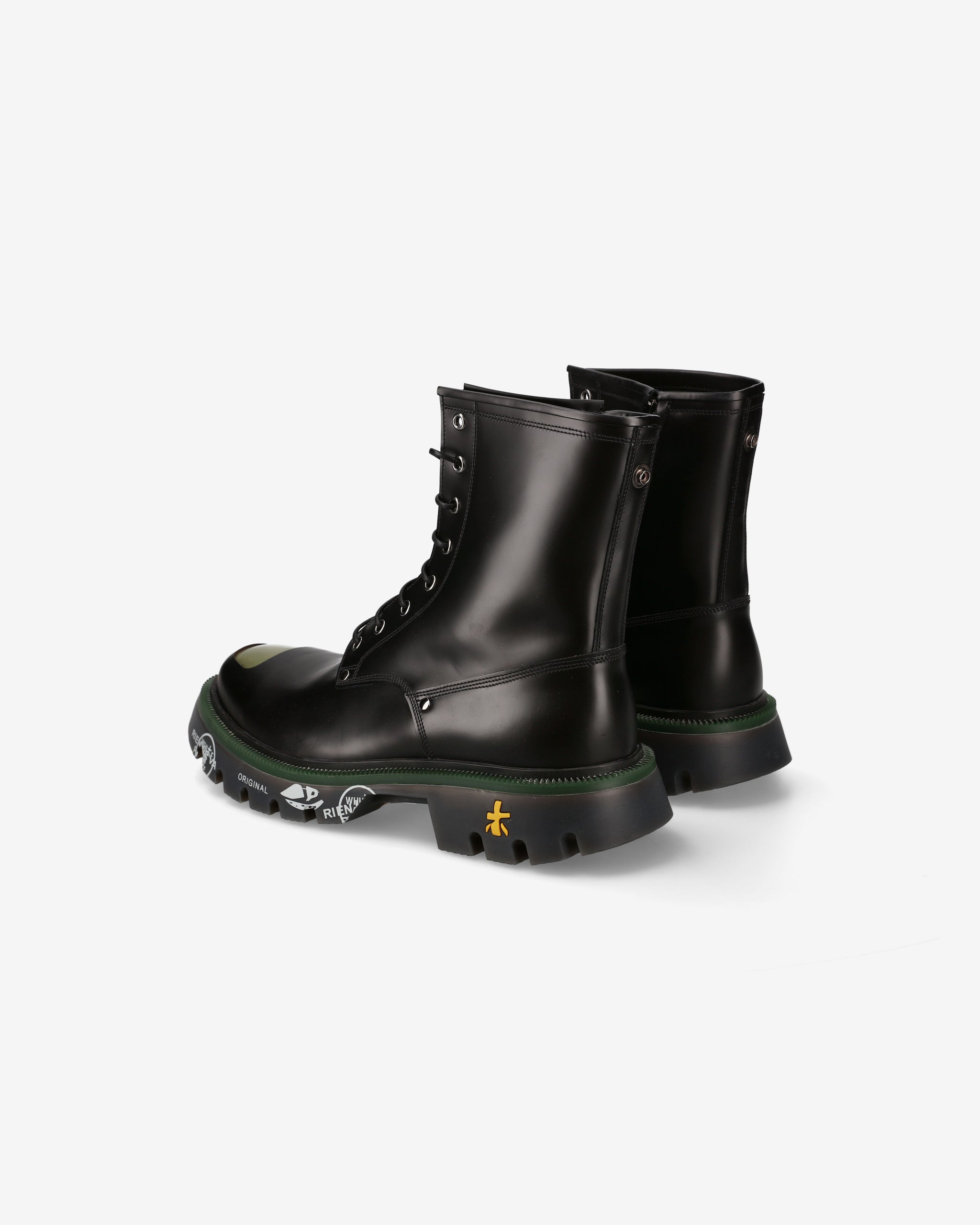 Anfibio in vitello spazzolato nero con puntale in ABS e guardolo verde militare abbinato a fondo nero. Un mix di eleganza e carattere, ispirato al mondo underground londinese.
