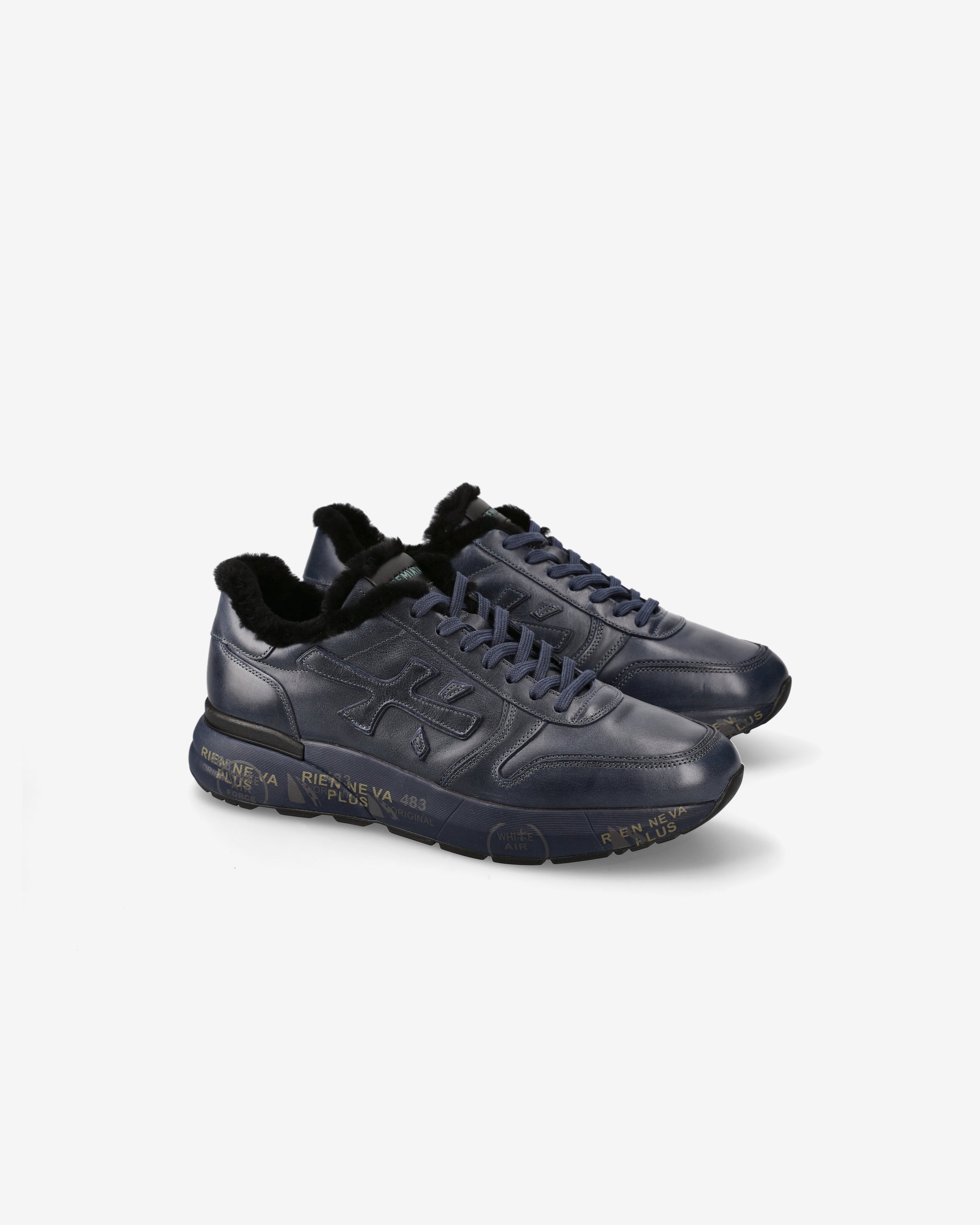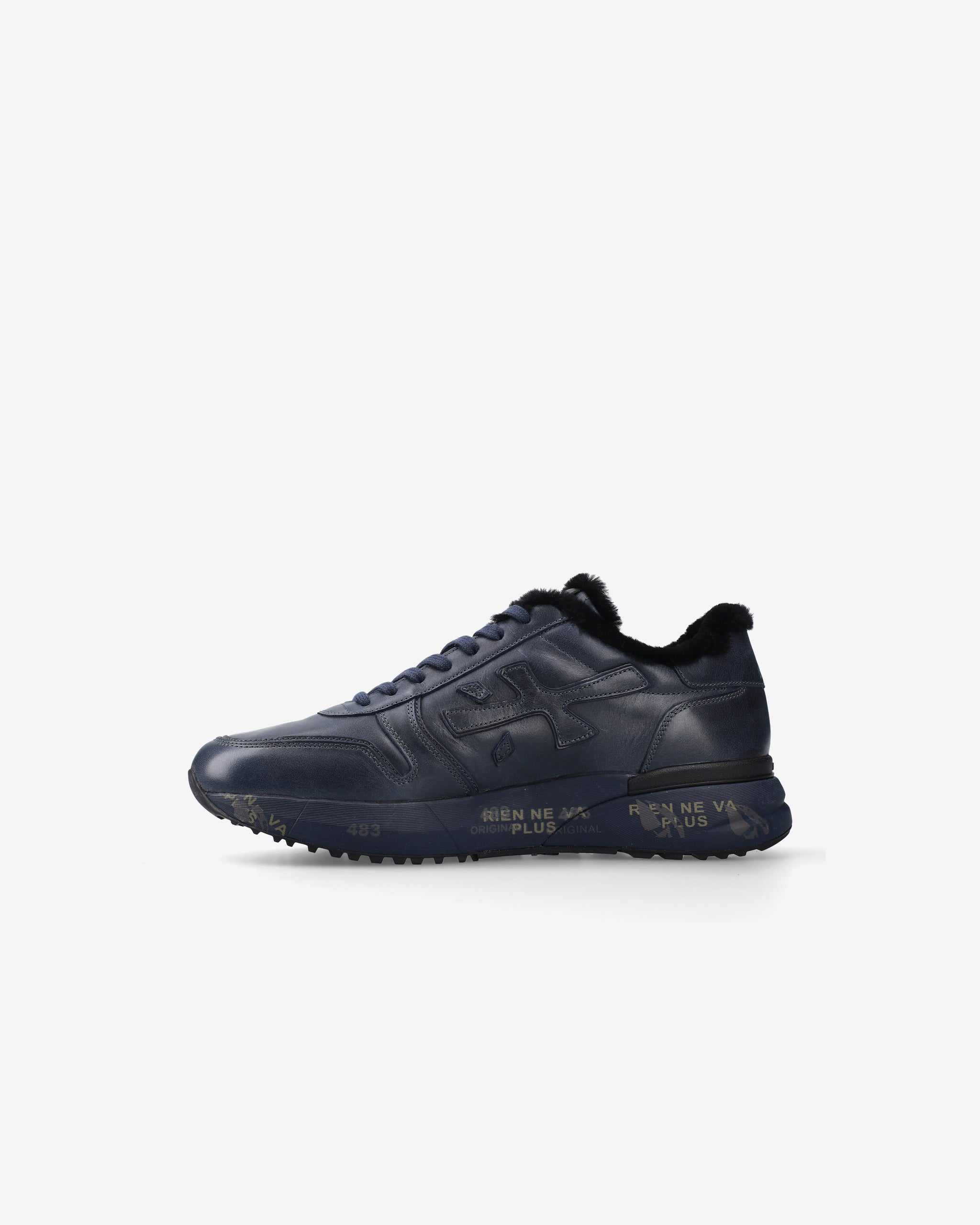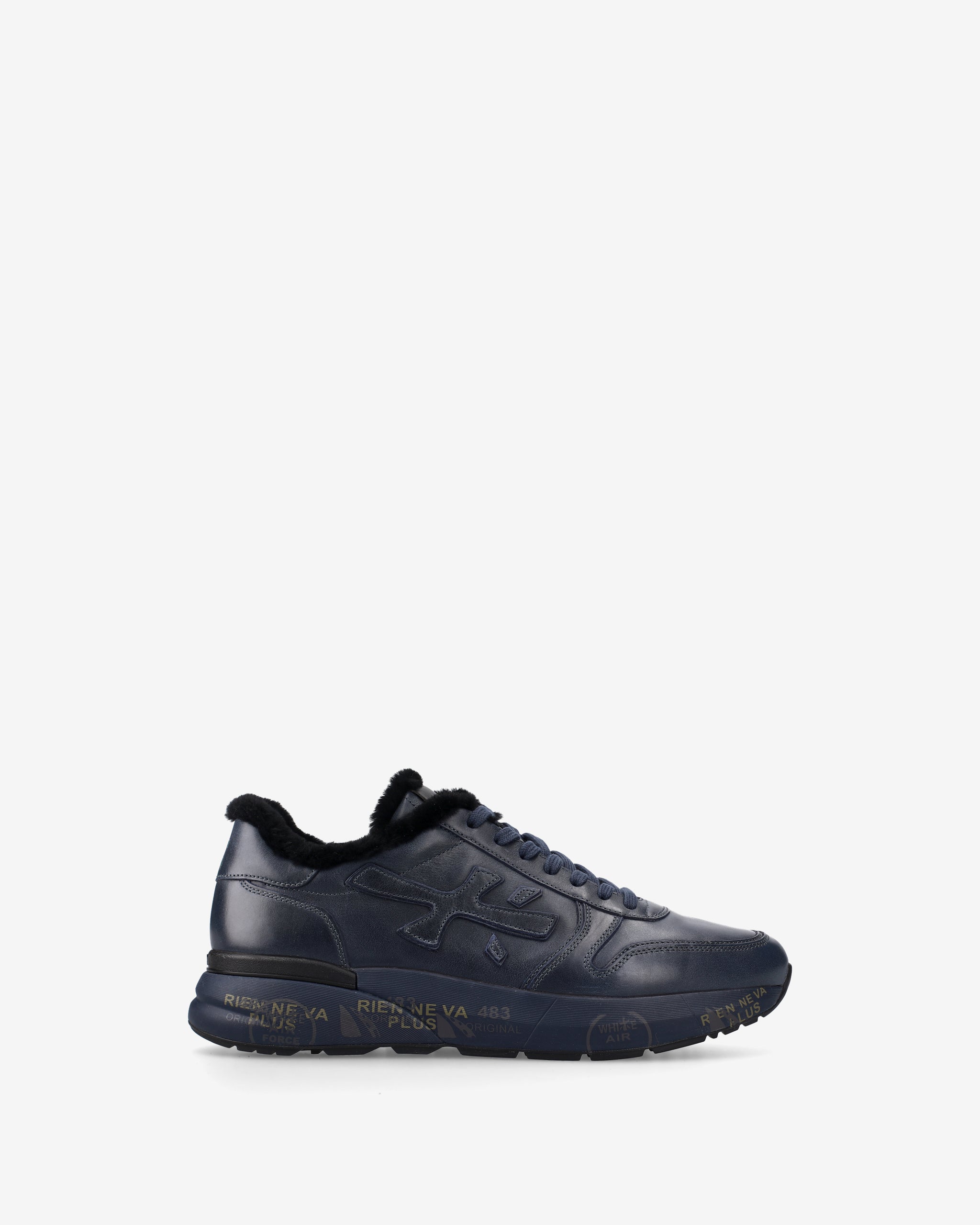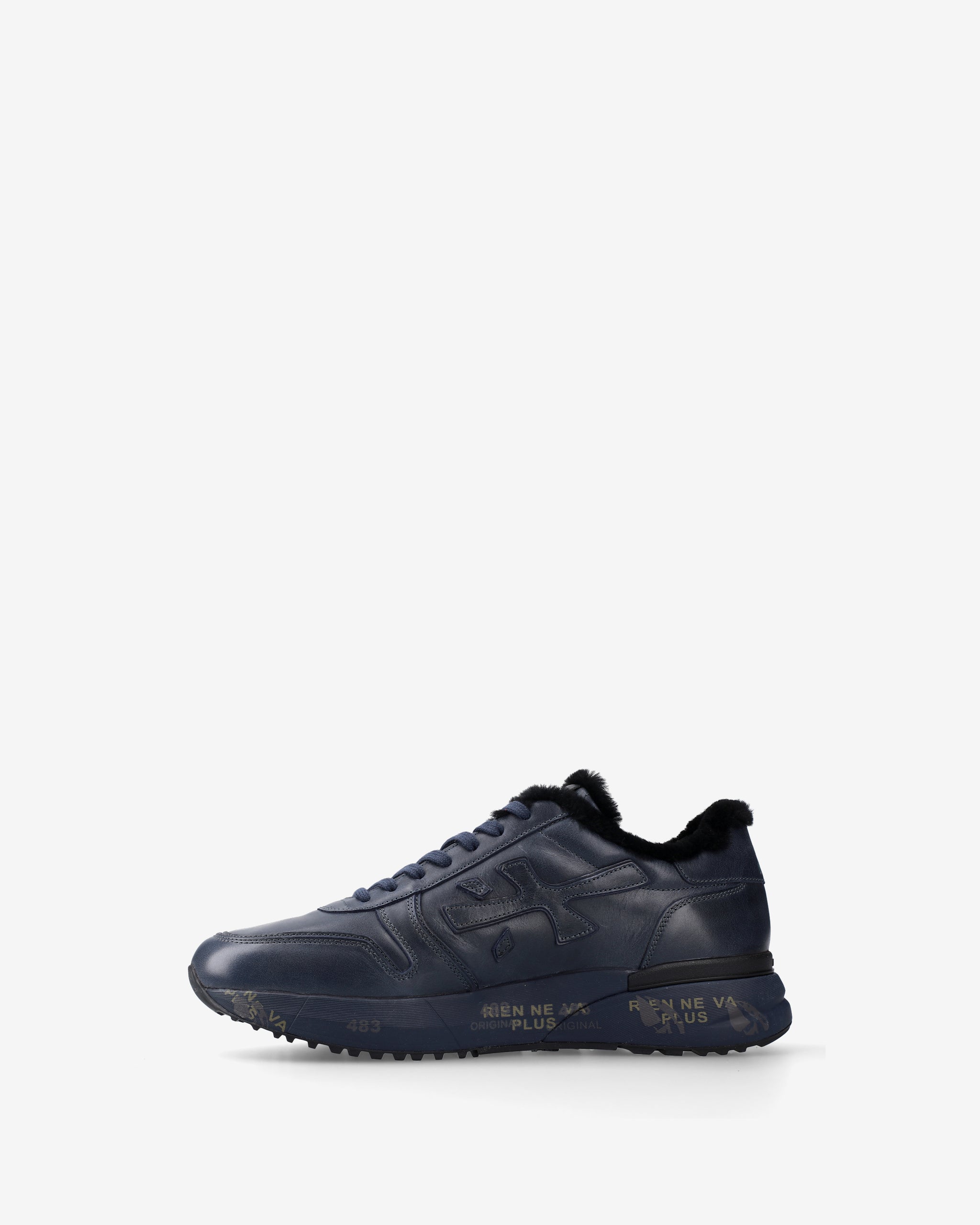 Sneakers Mick in mix di materiali e pellami di qualità. La scarpa è realizzata nella tonalità del blu con l'interno foderato in montone per uno stile casual. L'iconica silhouette è arricchita dal logo Premiata.