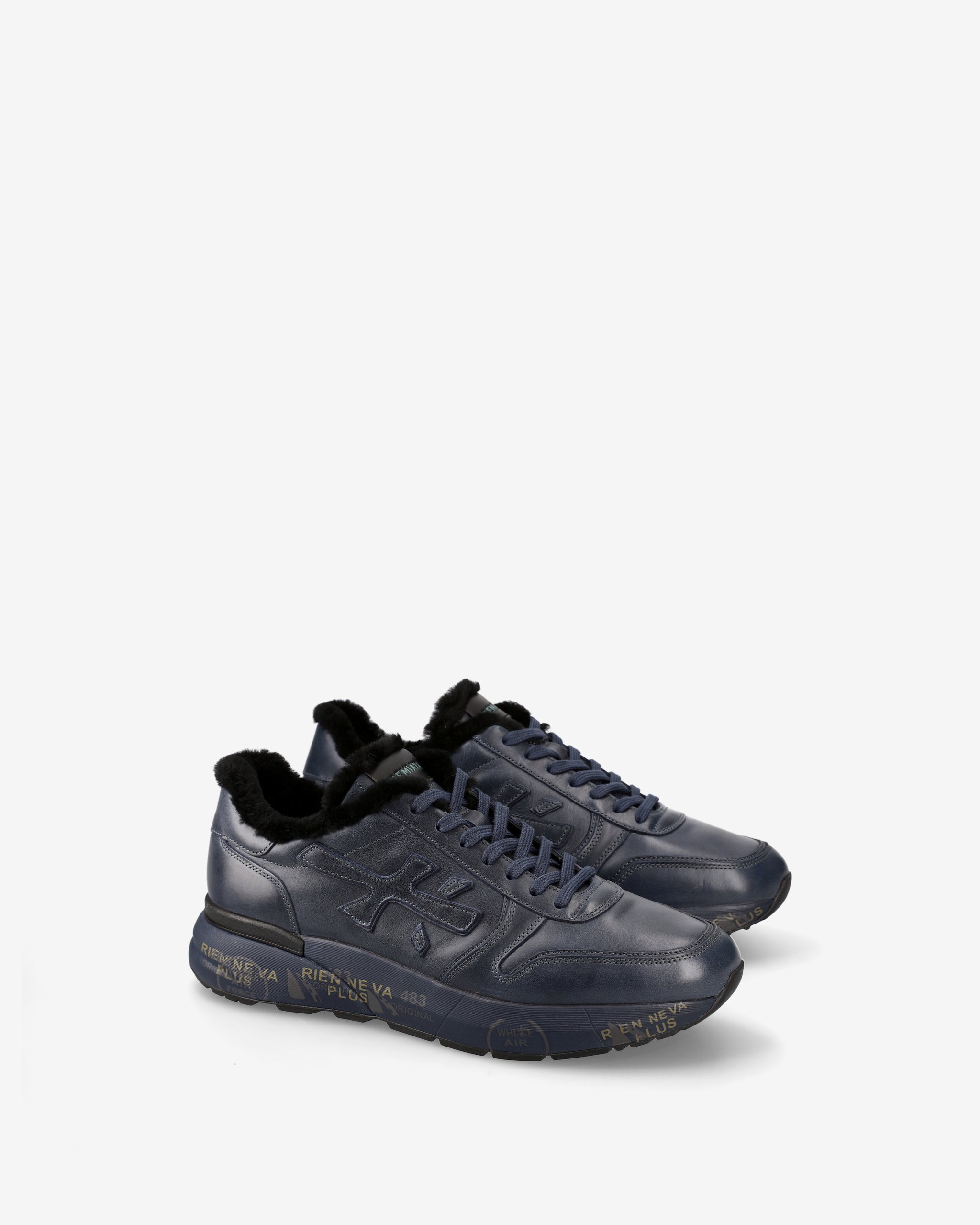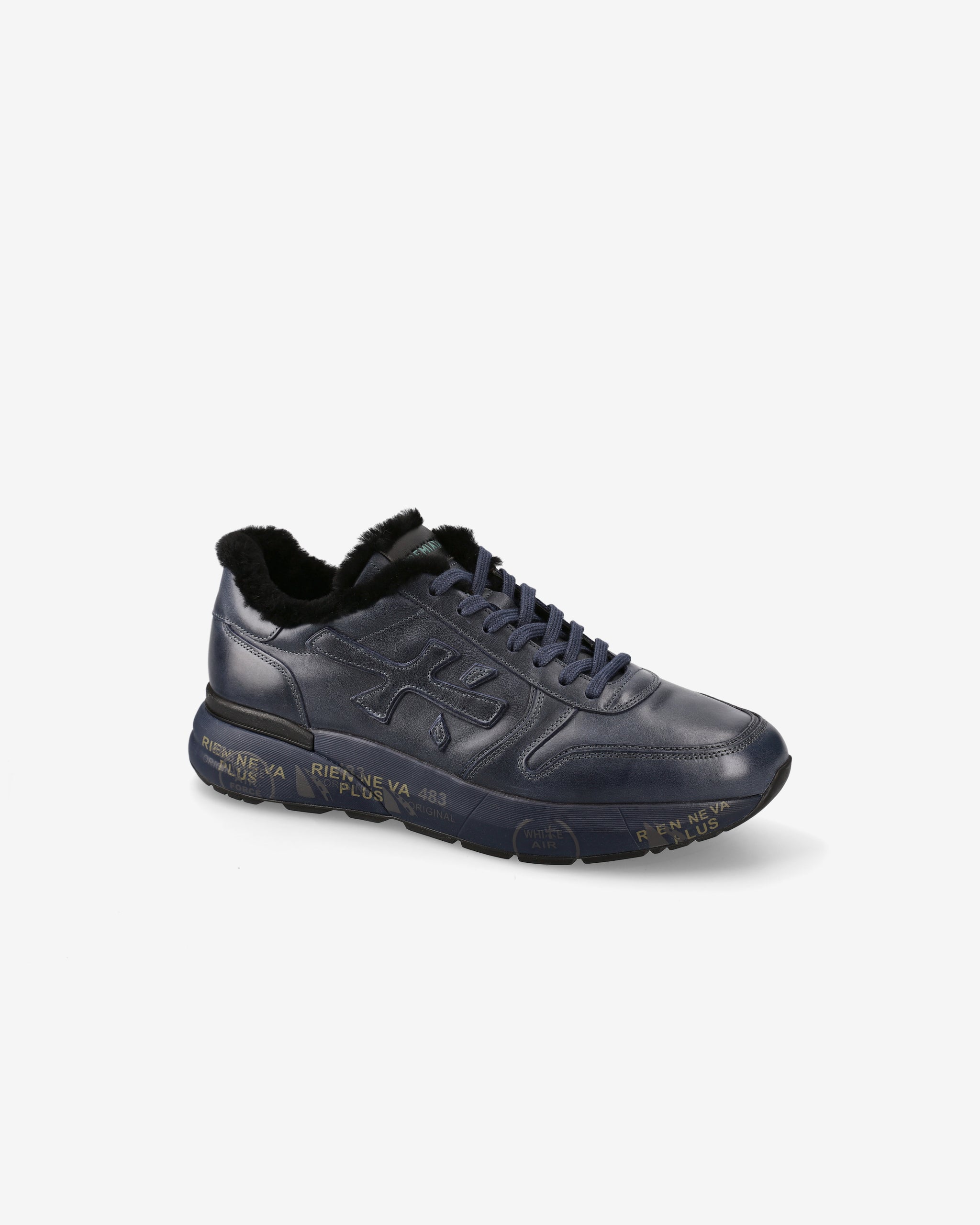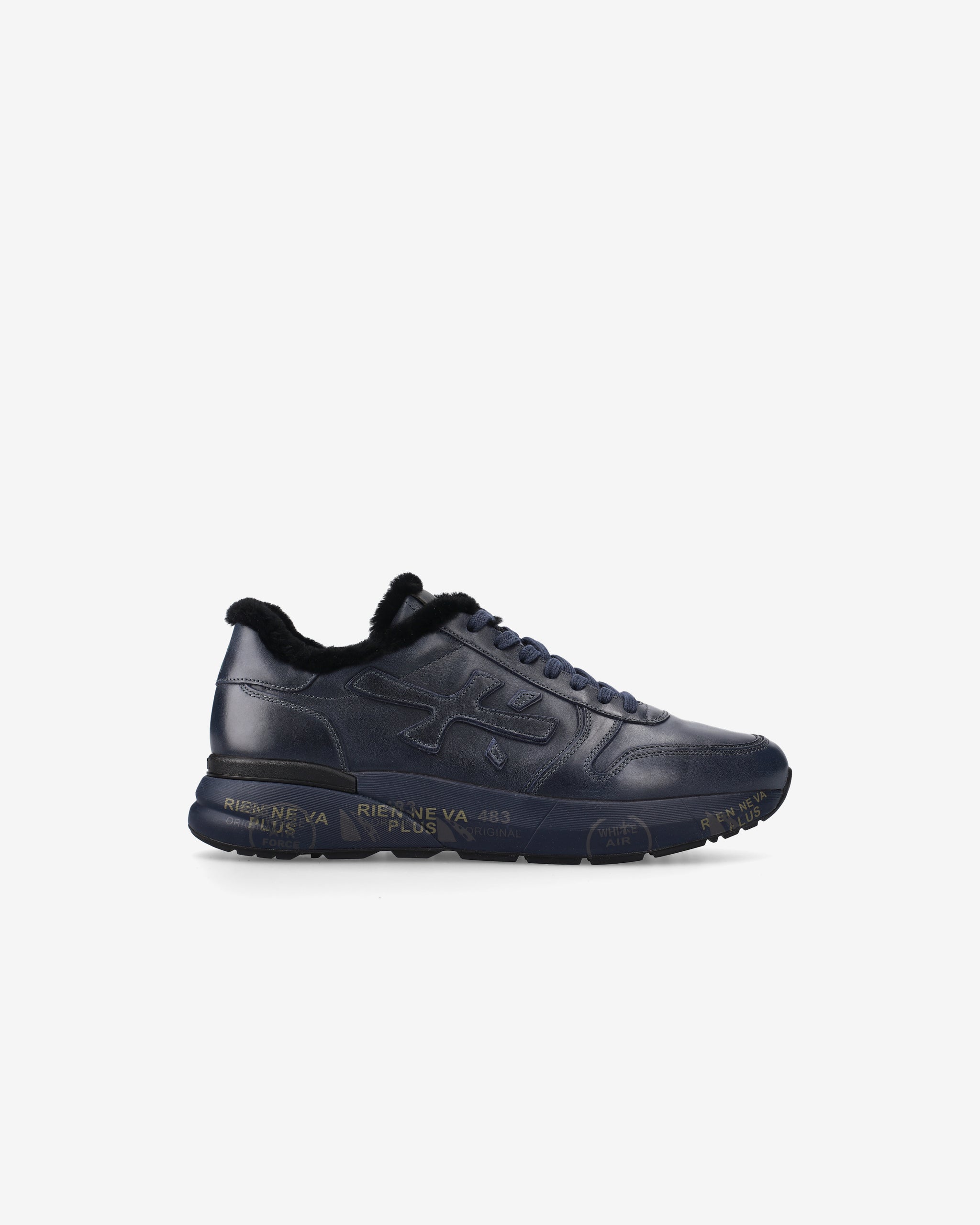Sneakers Mick in mix di materiali e pellami di qualità. La scarpa è realizzata nella tonalità del blu con l'interno foderato in montone per uno stile casual. L'iconica silhouette è arricchita dal logo Premiata.