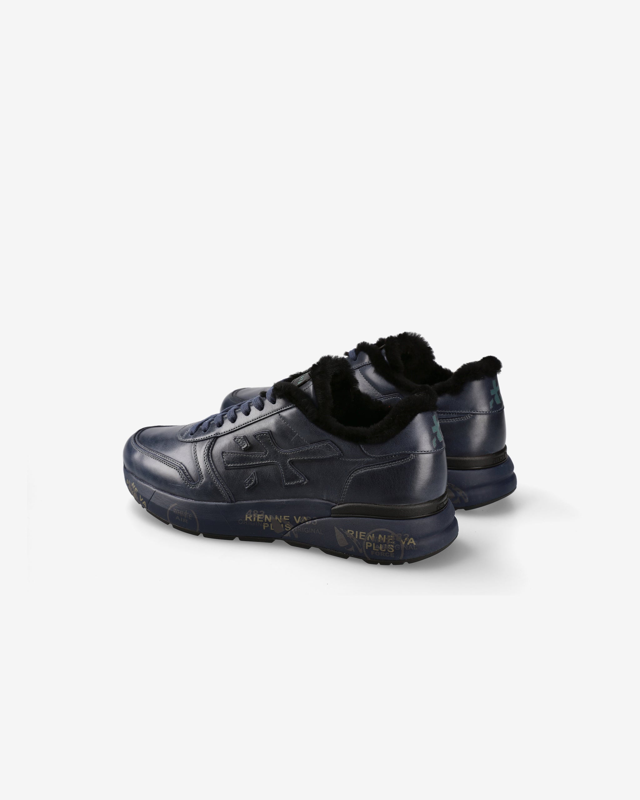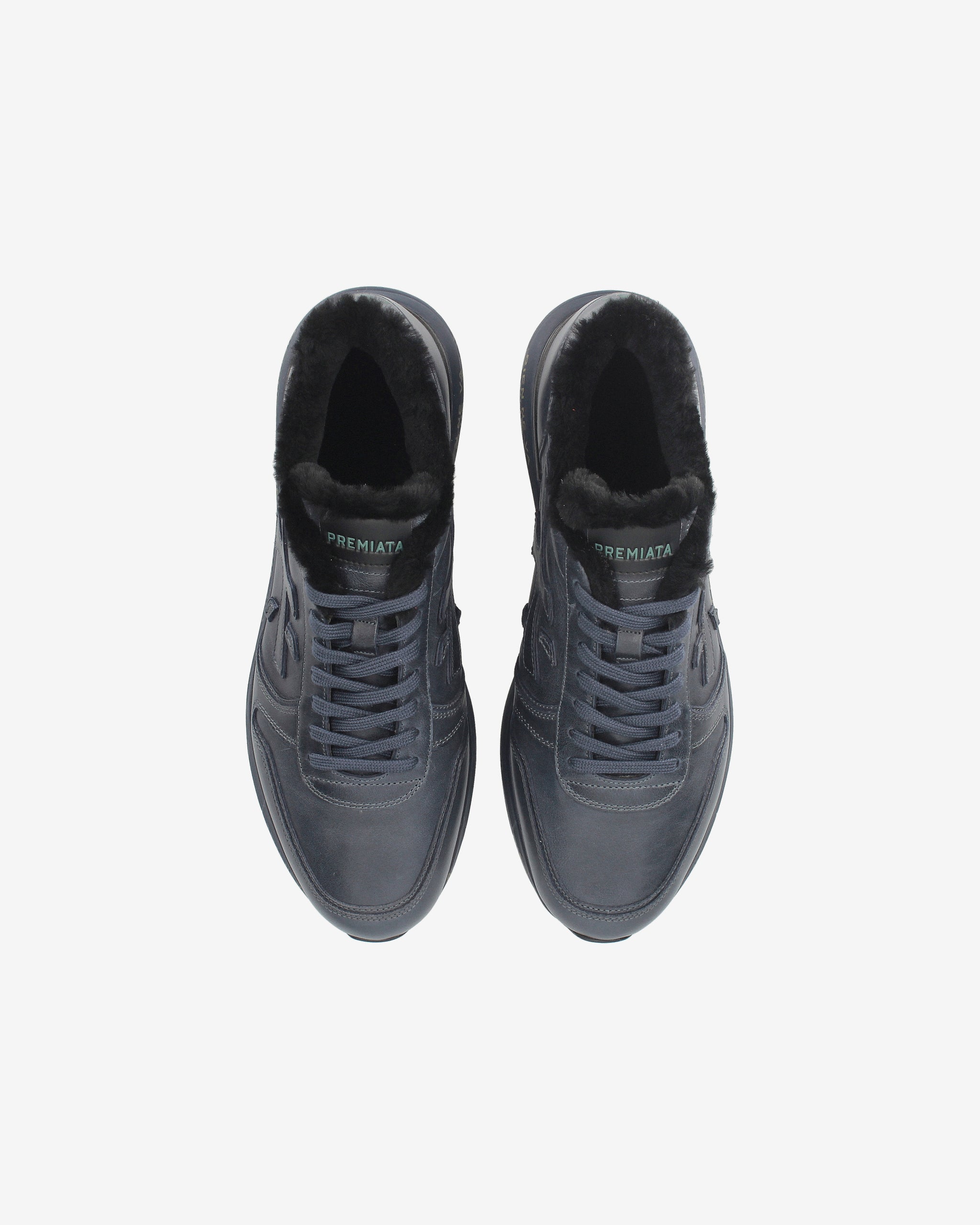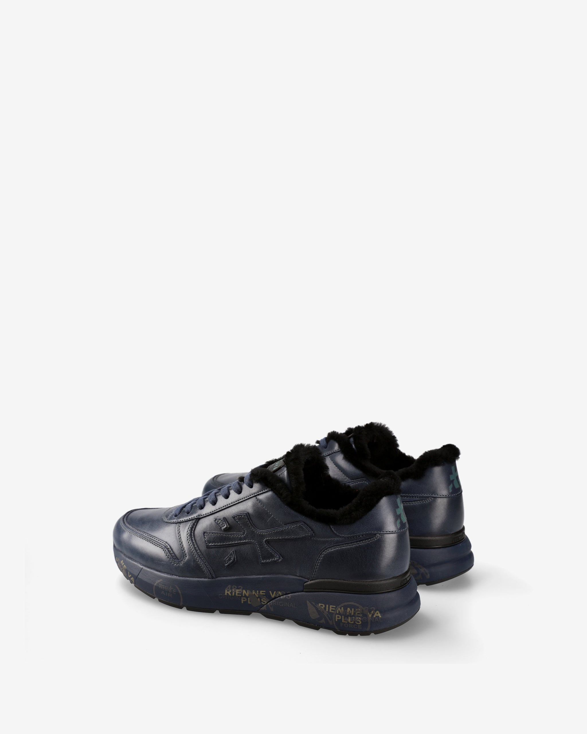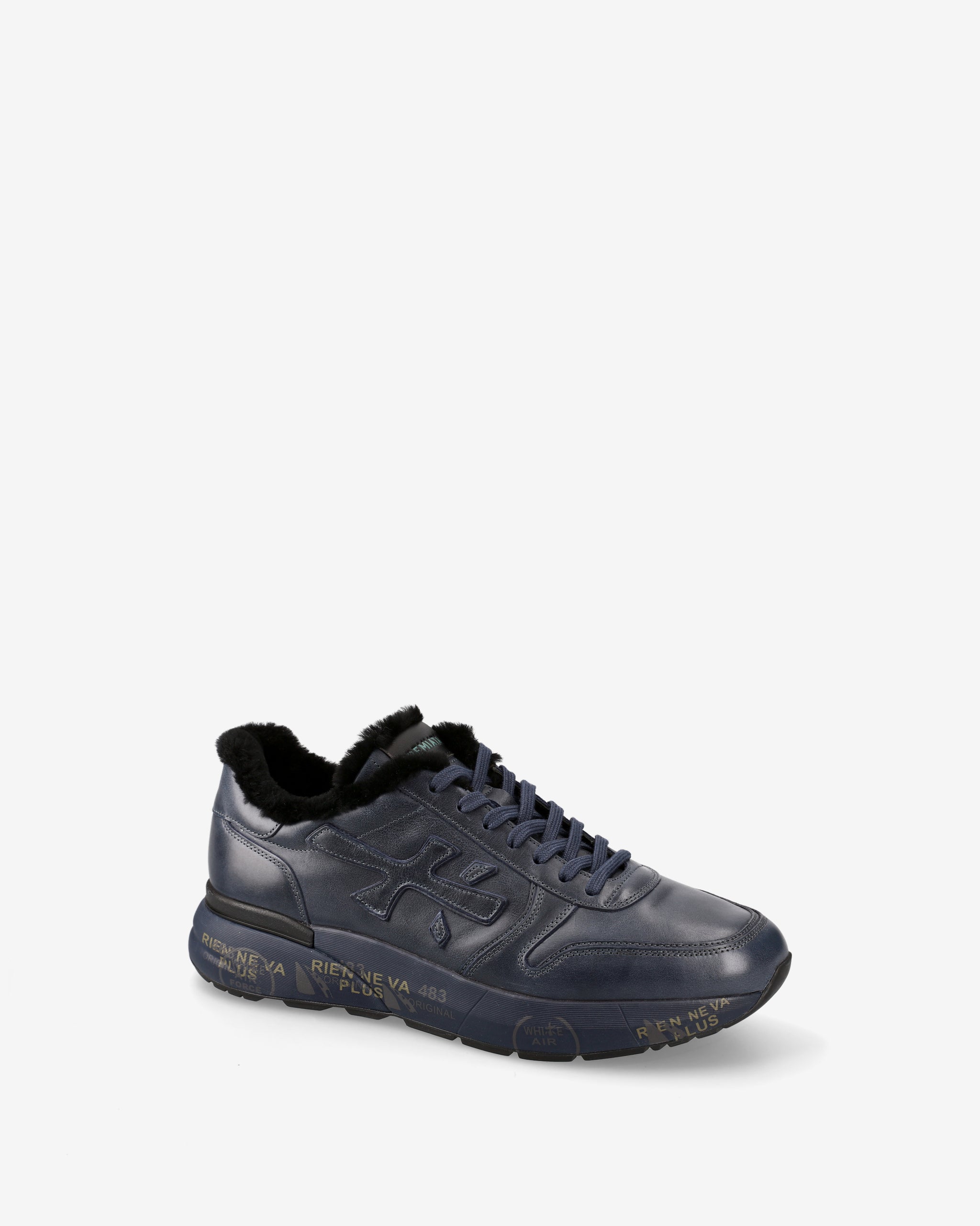 Sneakers Mick in mix di materiali e pellami di qualità. La scarpa è realizzata nella tonalità del blu con l'interno foderato in montone per uno stile casual. L'iconica silhouette è arricchita dal logo Premiata.