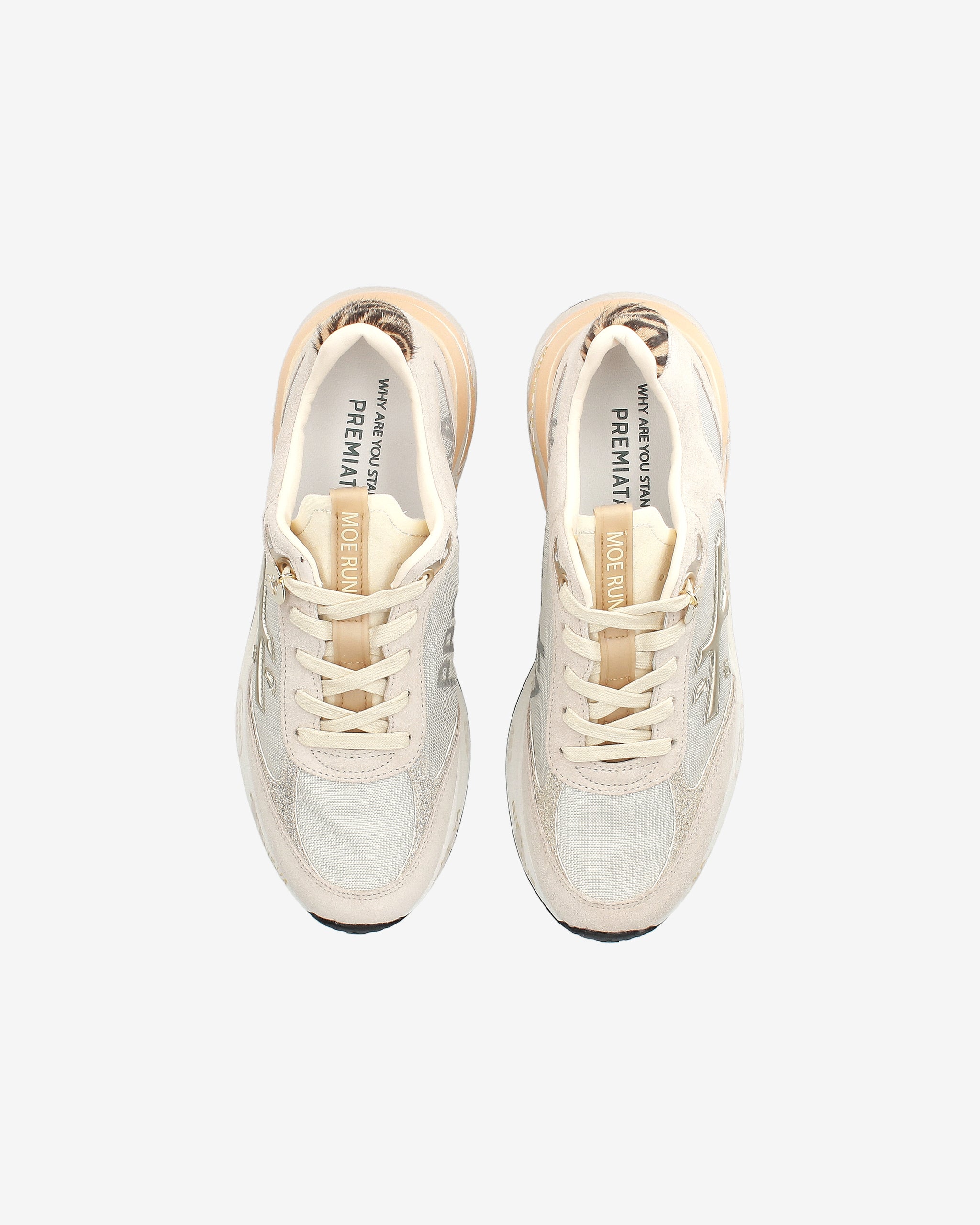Ideate per stupire. La Moerun si basa sulla leggerezza del movimento, la stabilità e la sensazione ammortizzante data dall'innovazione del fondo. La nuova silhouette è ricca di dettagli: logo sul laterale esterno, scritta PREMIATA sul laterale interno e nome del modello sull'etichetta.