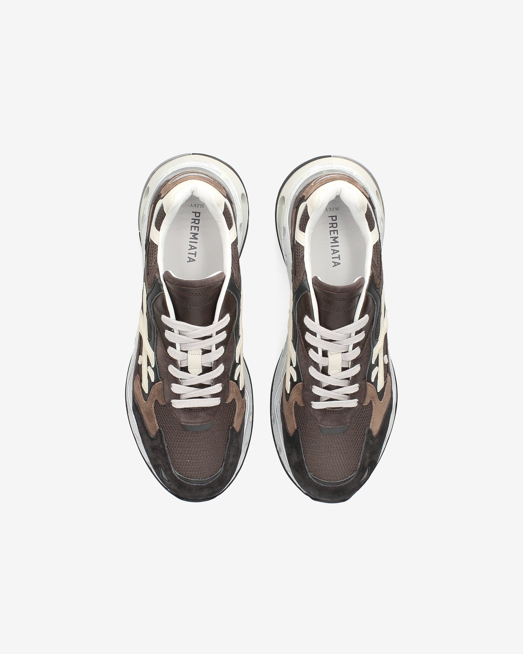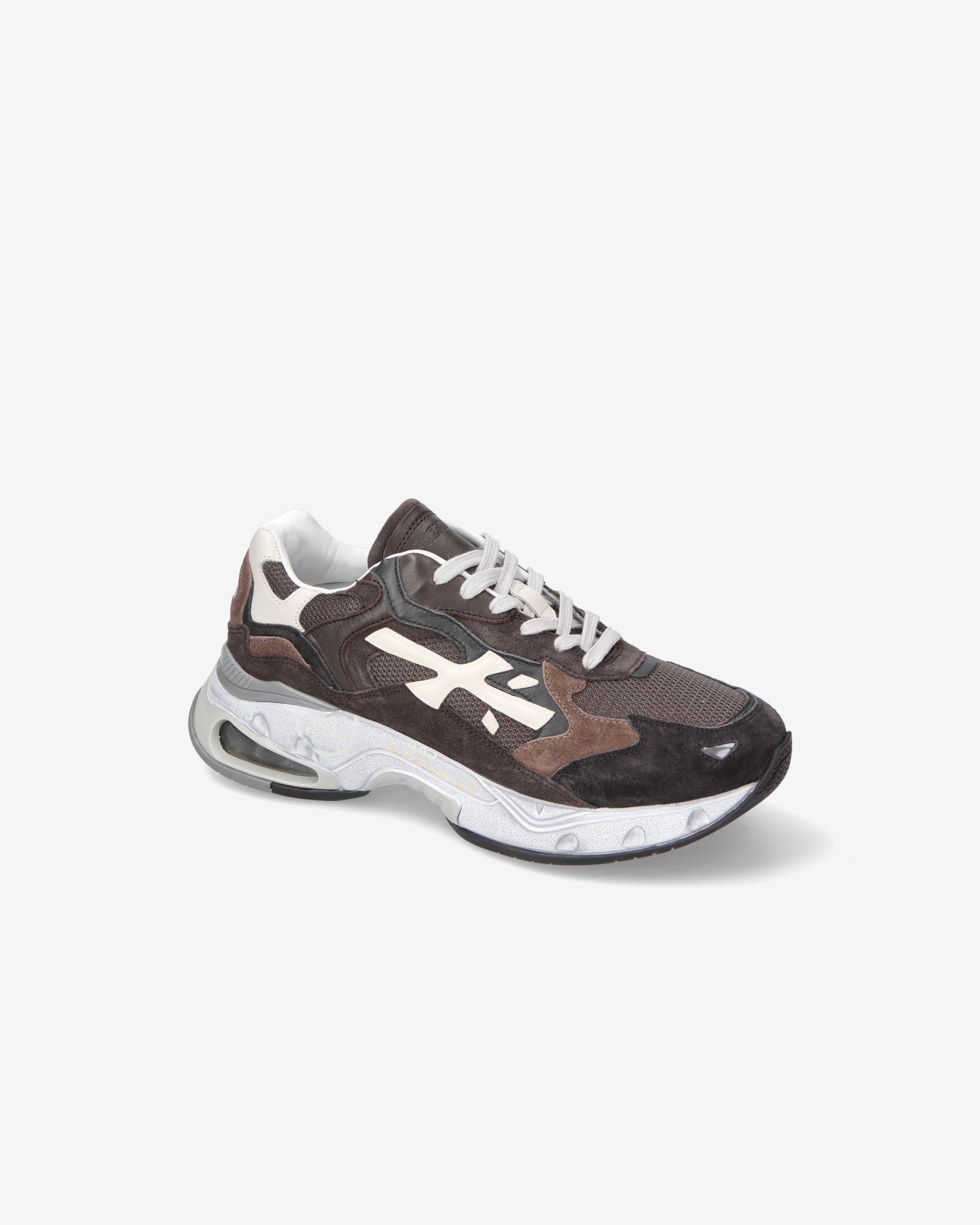 Sneaker Sharky realizzata in materiali innovativi e cromatismi ricercati. I colori e le linee sinuose ricordano le colline coltivate e i campi in fiore del paesaggio rurale delle Marche, la regione che ospita l’headquarter di Premiata. La complessità del fondo di questa sneaker la rende sofisticata e particolare.
