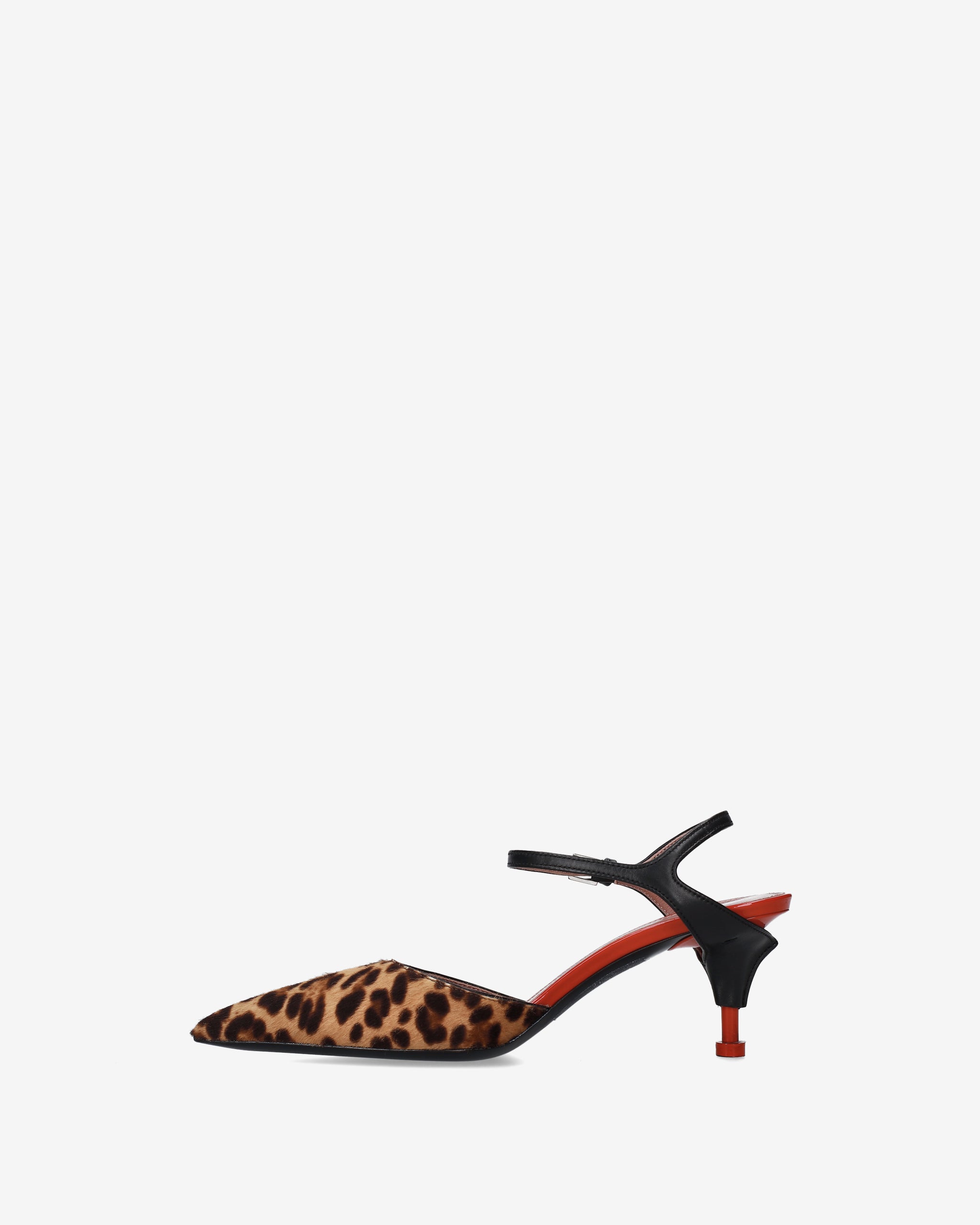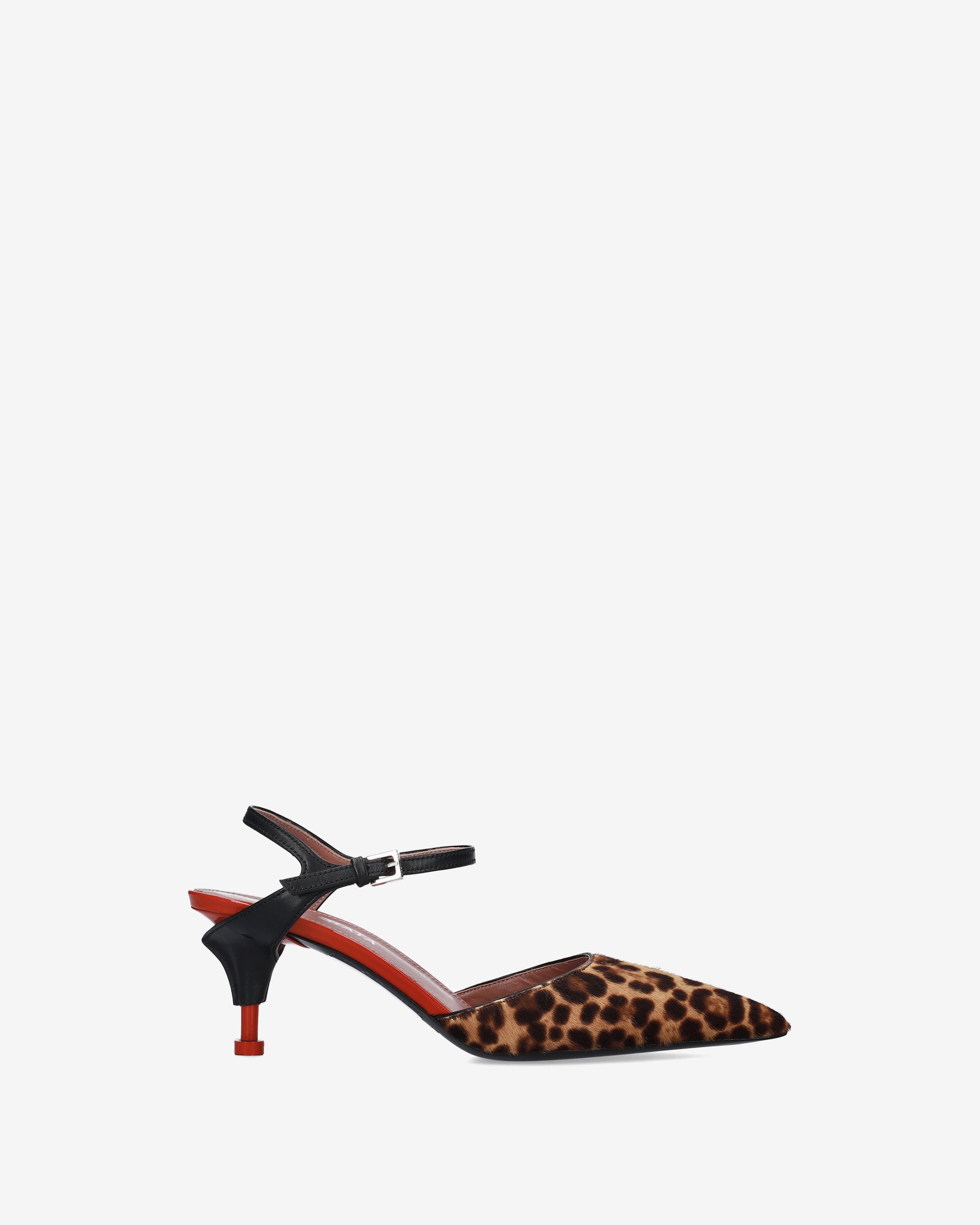 Eleganti mules con tomaia Animalier in cavallino maculato, che conferisce un tocco audace e sofisticato al design. Il cinturino in vitello nero ingloba parzialmente il tacco, seguendo la caratteristica della scarpa per un effetto fluido e armonioso.