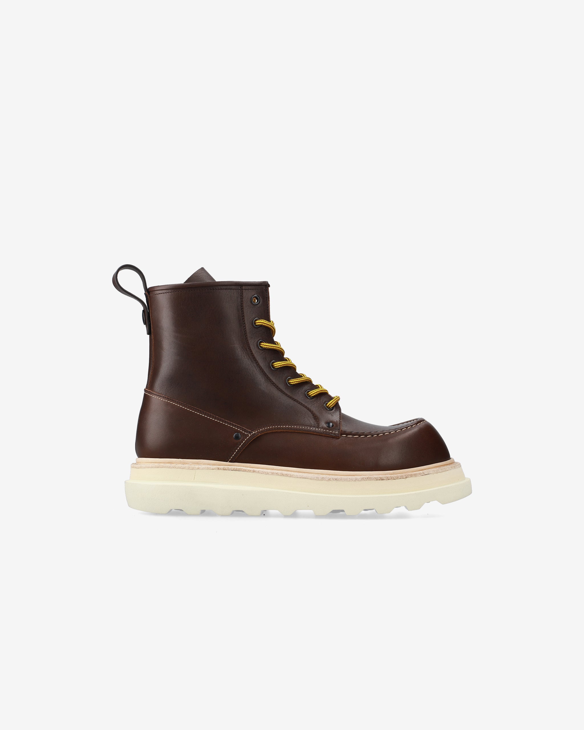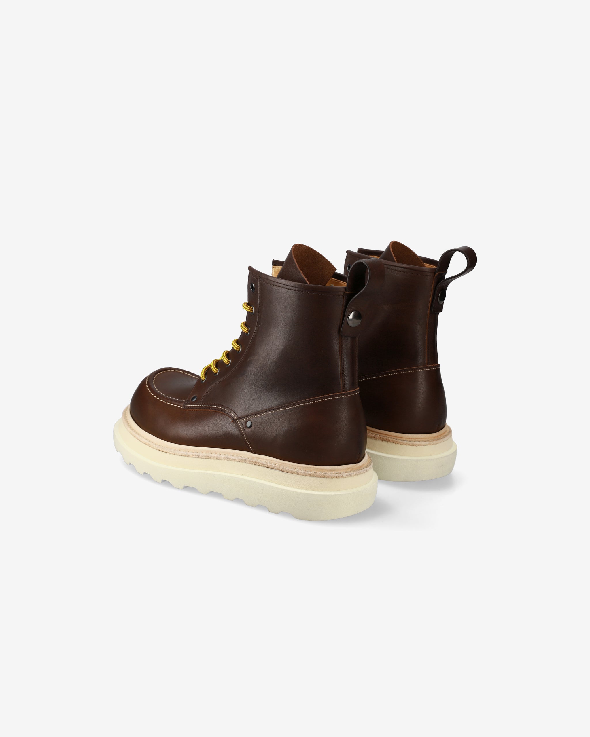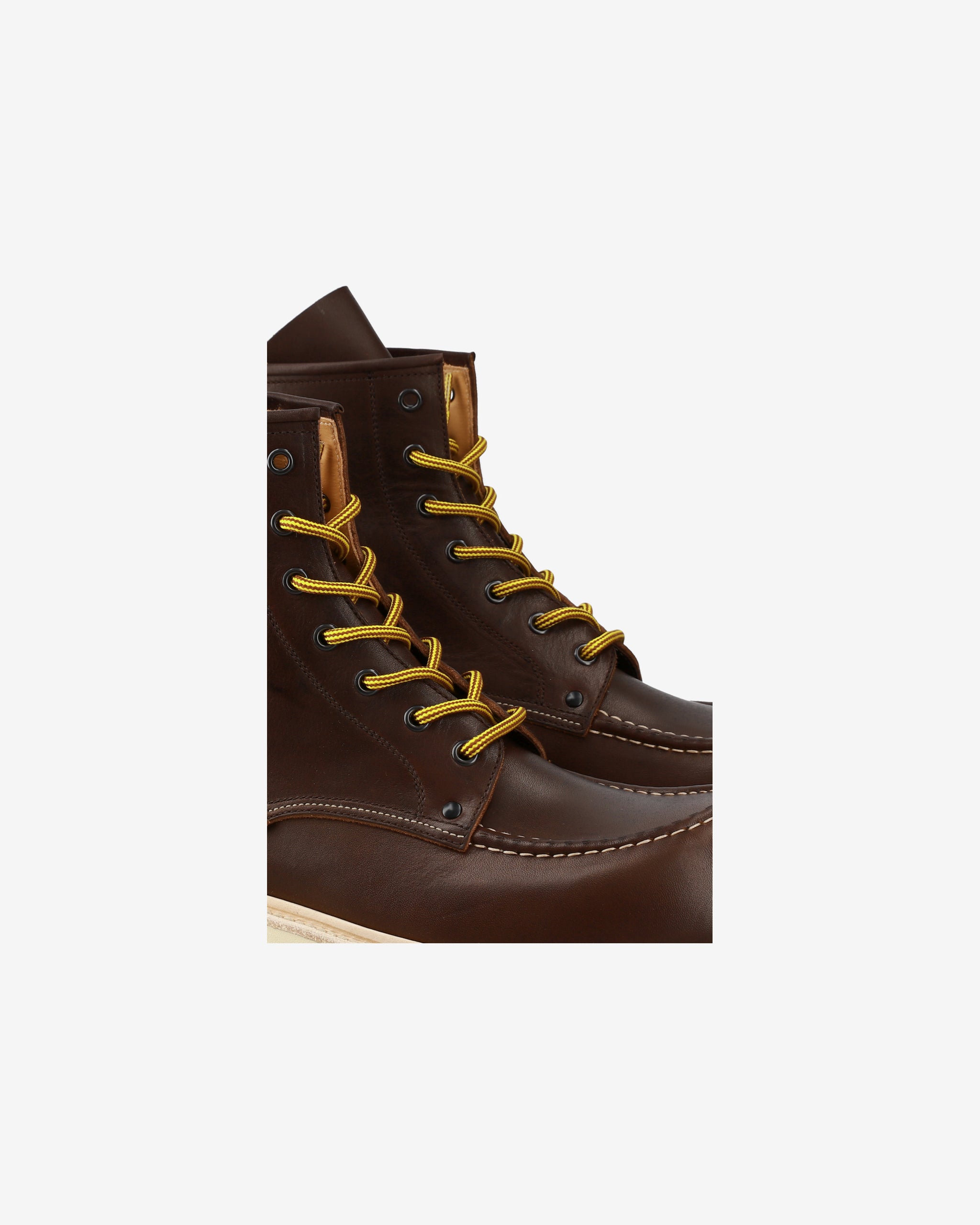 Our interpretation of the legendary Red Wing boot stands out for its craftsmanship and balance between tradition and innovation. Offered in dark brown calfskin leather, it features a rugged Goodyear Welted construction paired with a cream-colored Wearlight EVA sole with a tone-on-tone micro midsole. Comfort is provided by the latex rubber fusbet, while metal eyelets reinforce the rugged aesthetic.