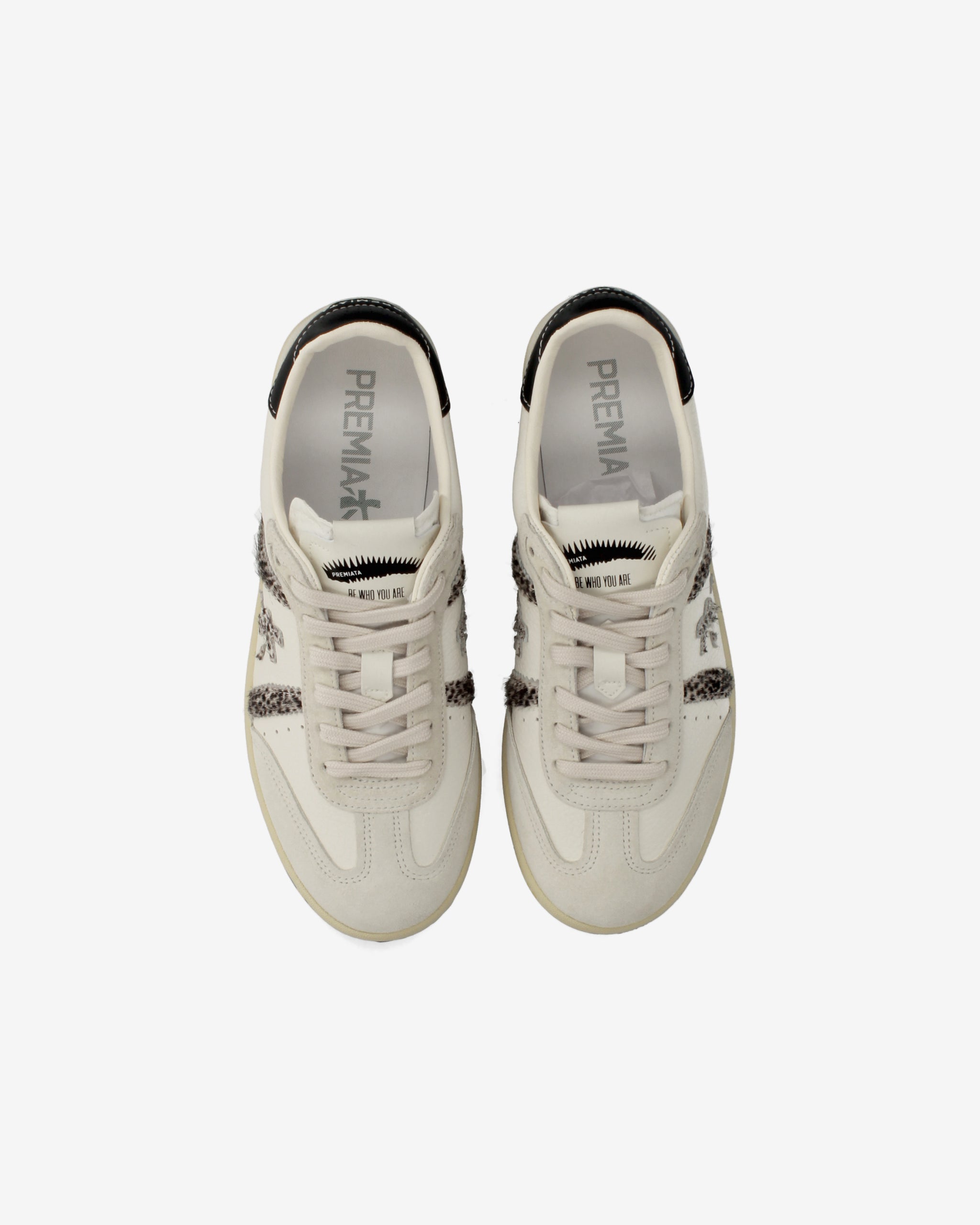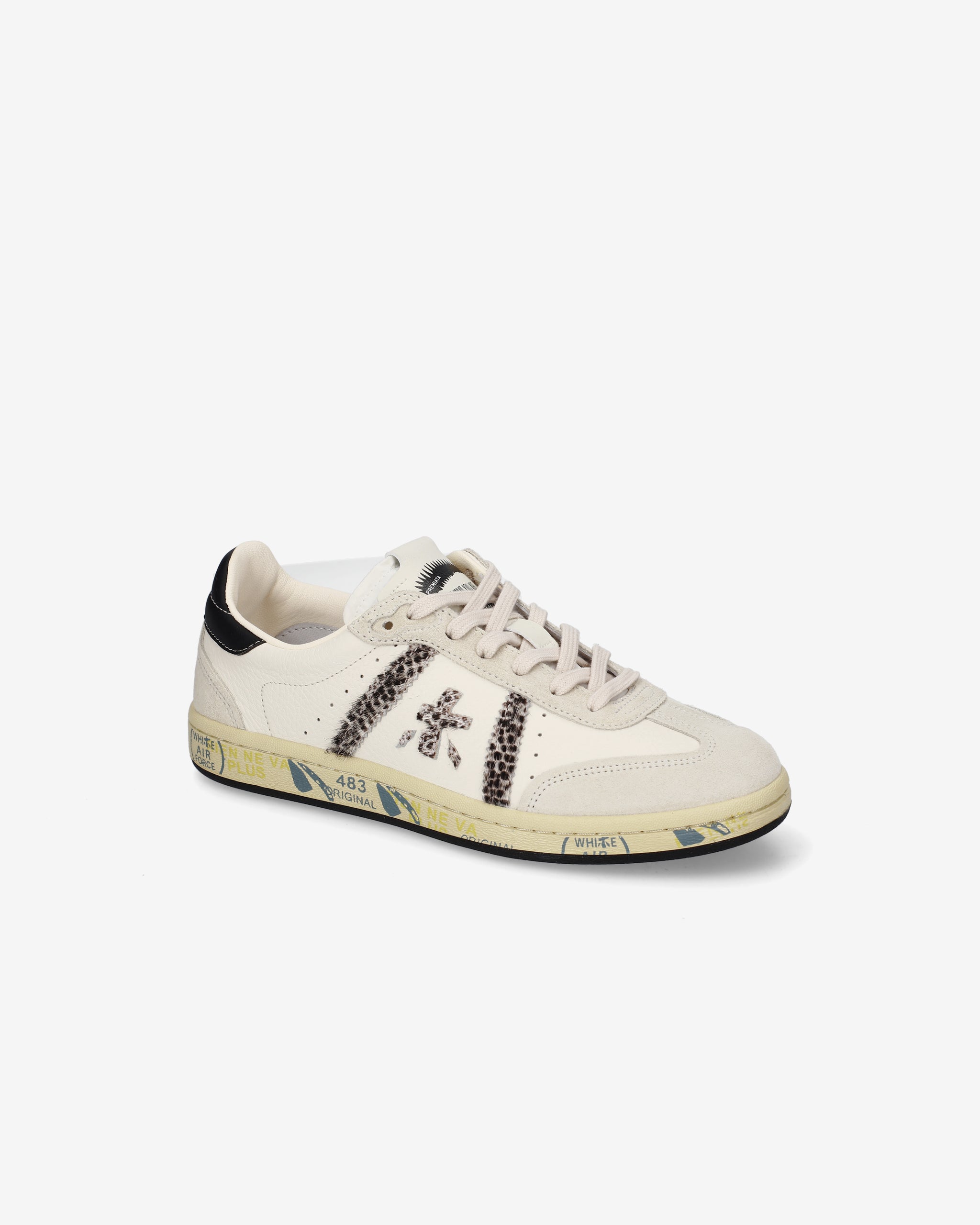 This sneaker with a clean, contemporary look features a beige upper with black accents, suede toe and contrasting heel. The side polka dot pattern and sole decorated with distinctive stamps add an original touch, perfect for an urban and versatile style.