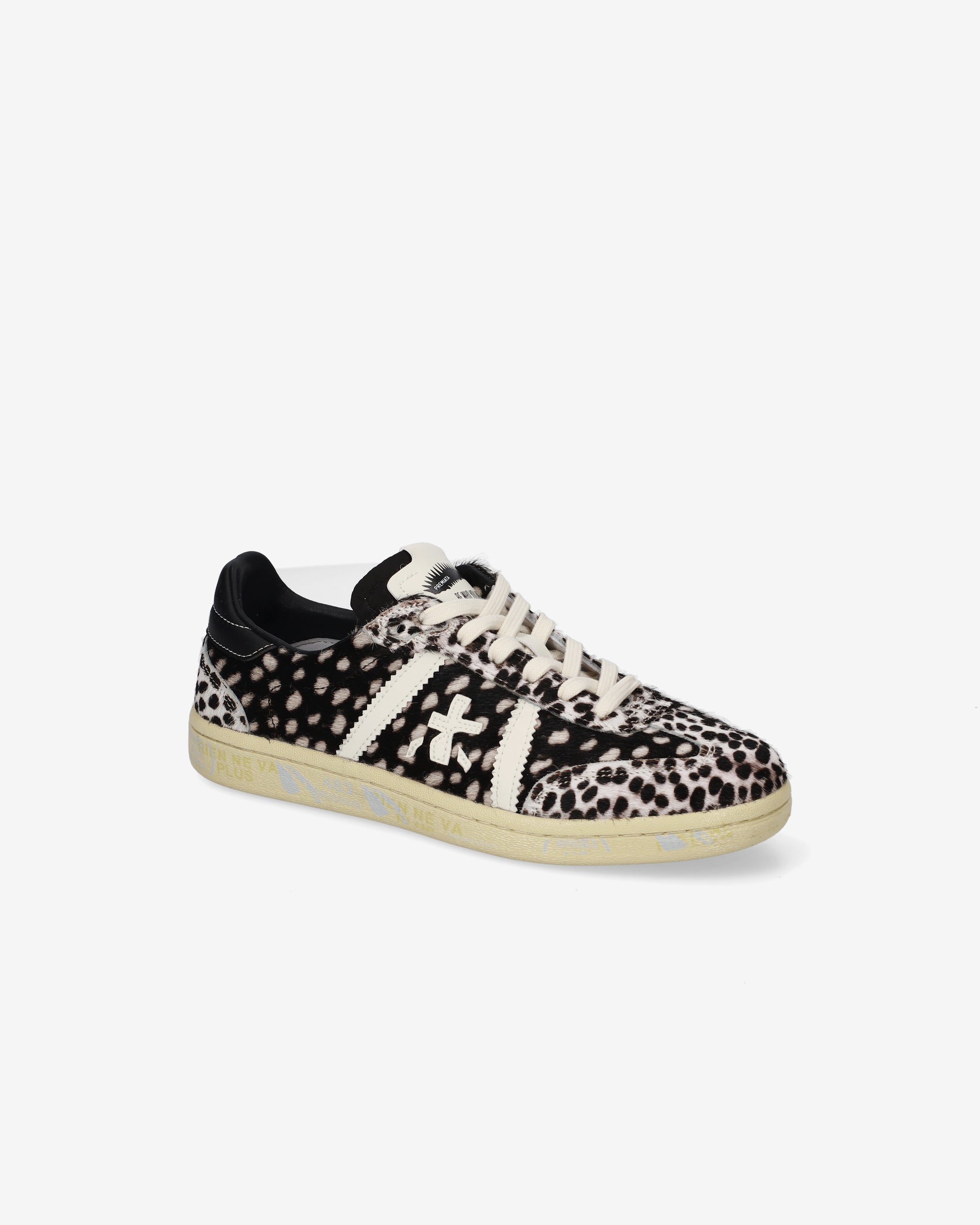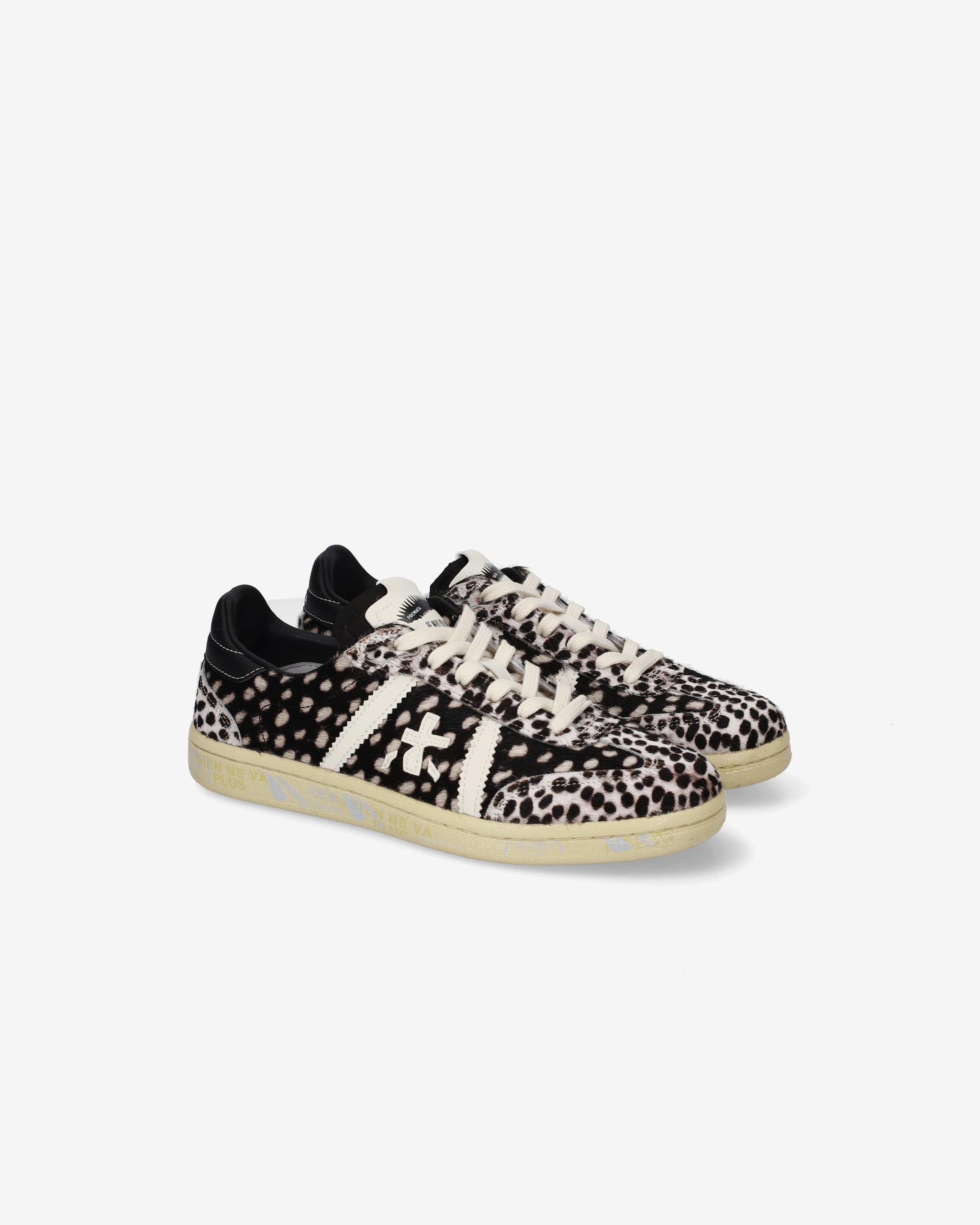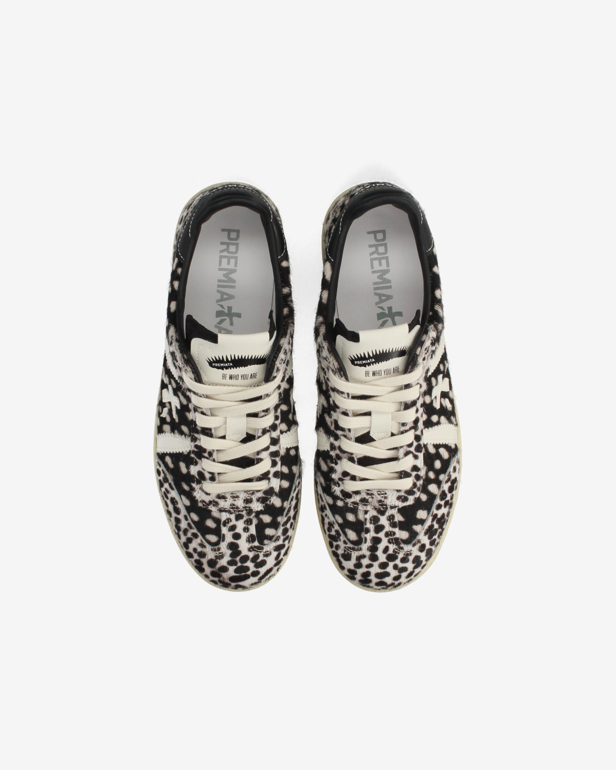 Strong character sneaker with beige and black spotted upper. The sole, with a worn effect and decorative stamps, completes a distinctive urban look.