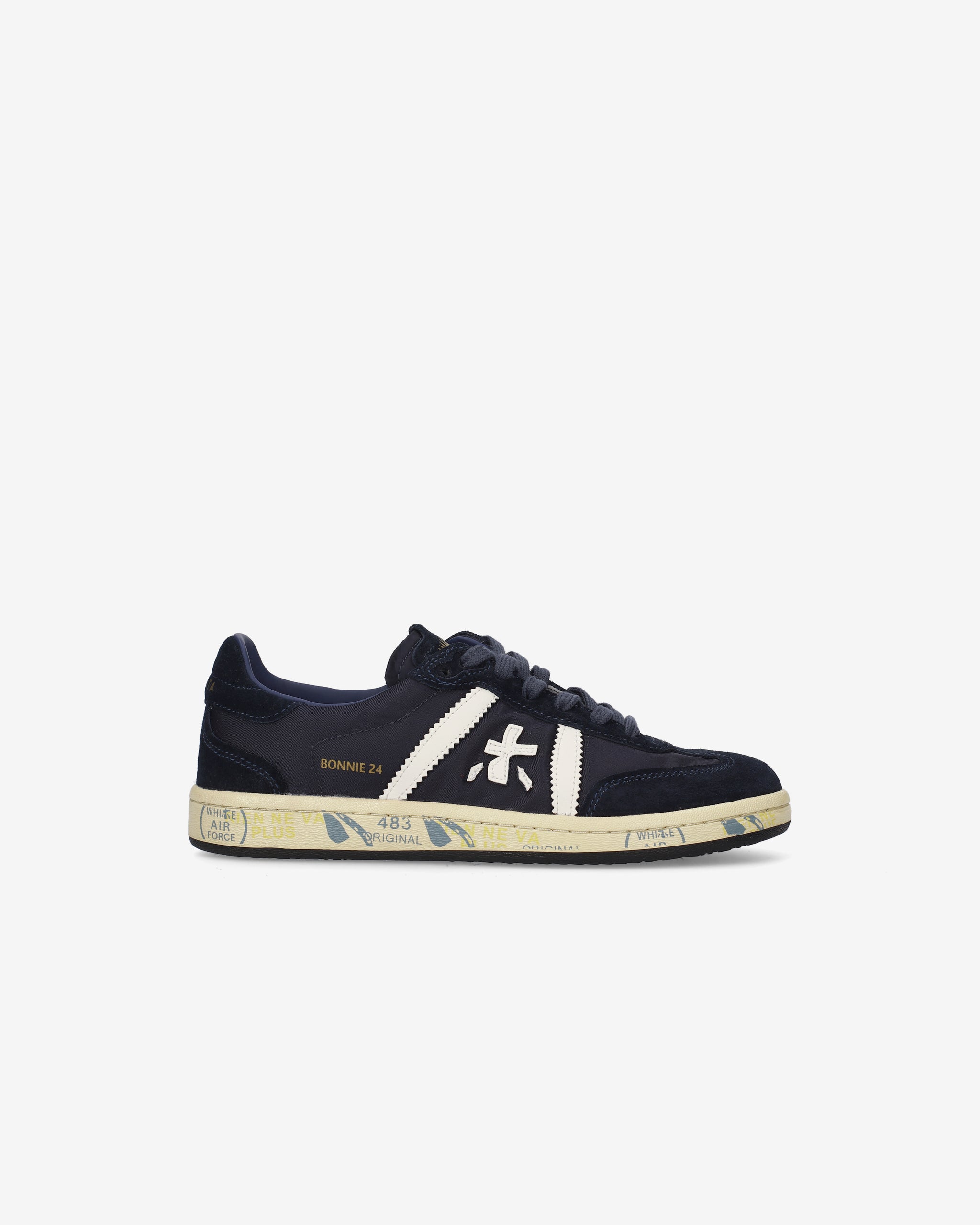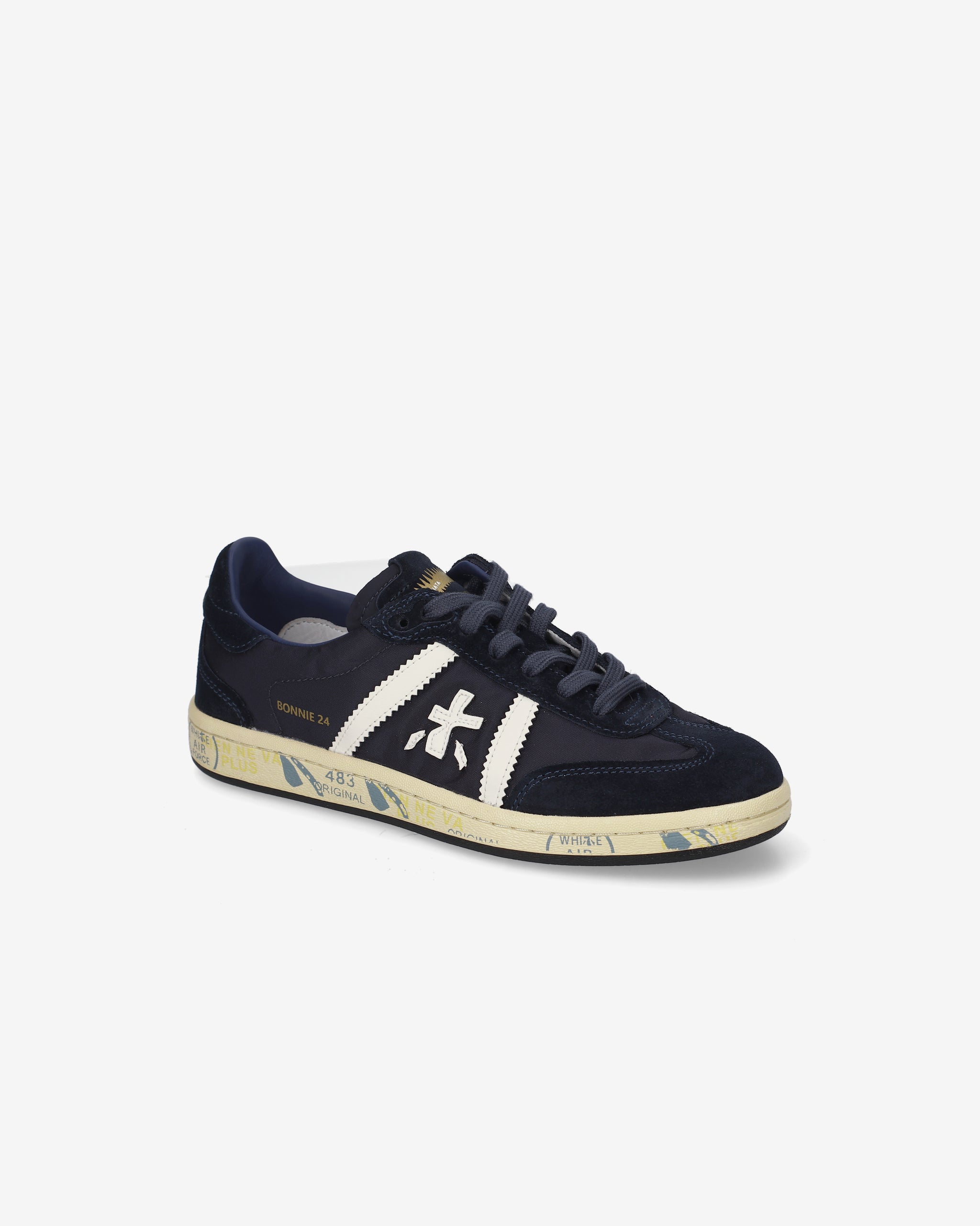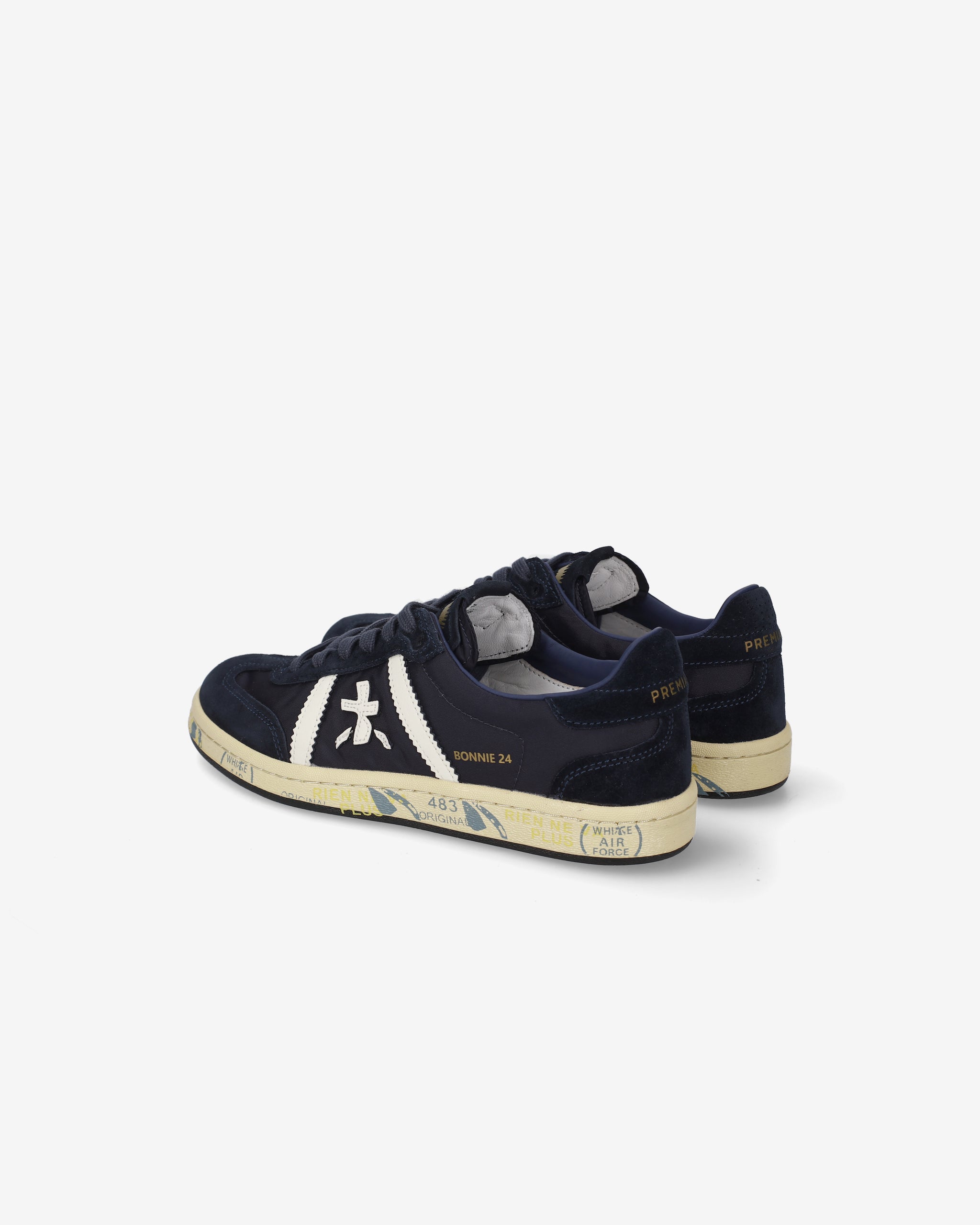 This sneaker with a sporty, contemporary look features a dark blue upper with white details and "BONNIE 24" lettering on the side. The sole, decorated with Premiata's distinctive stamps in vibrant hues, adds an original and dynamic touch.