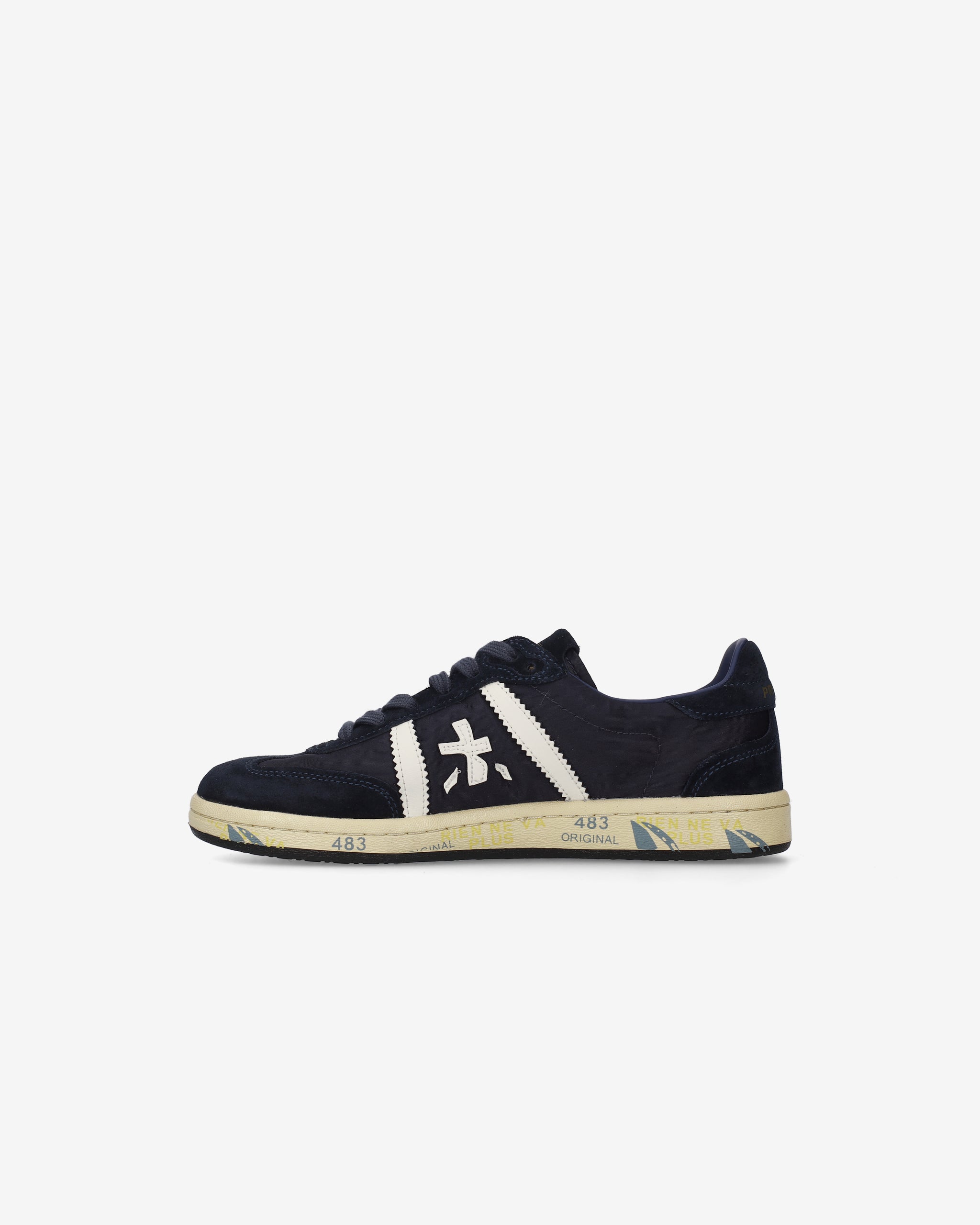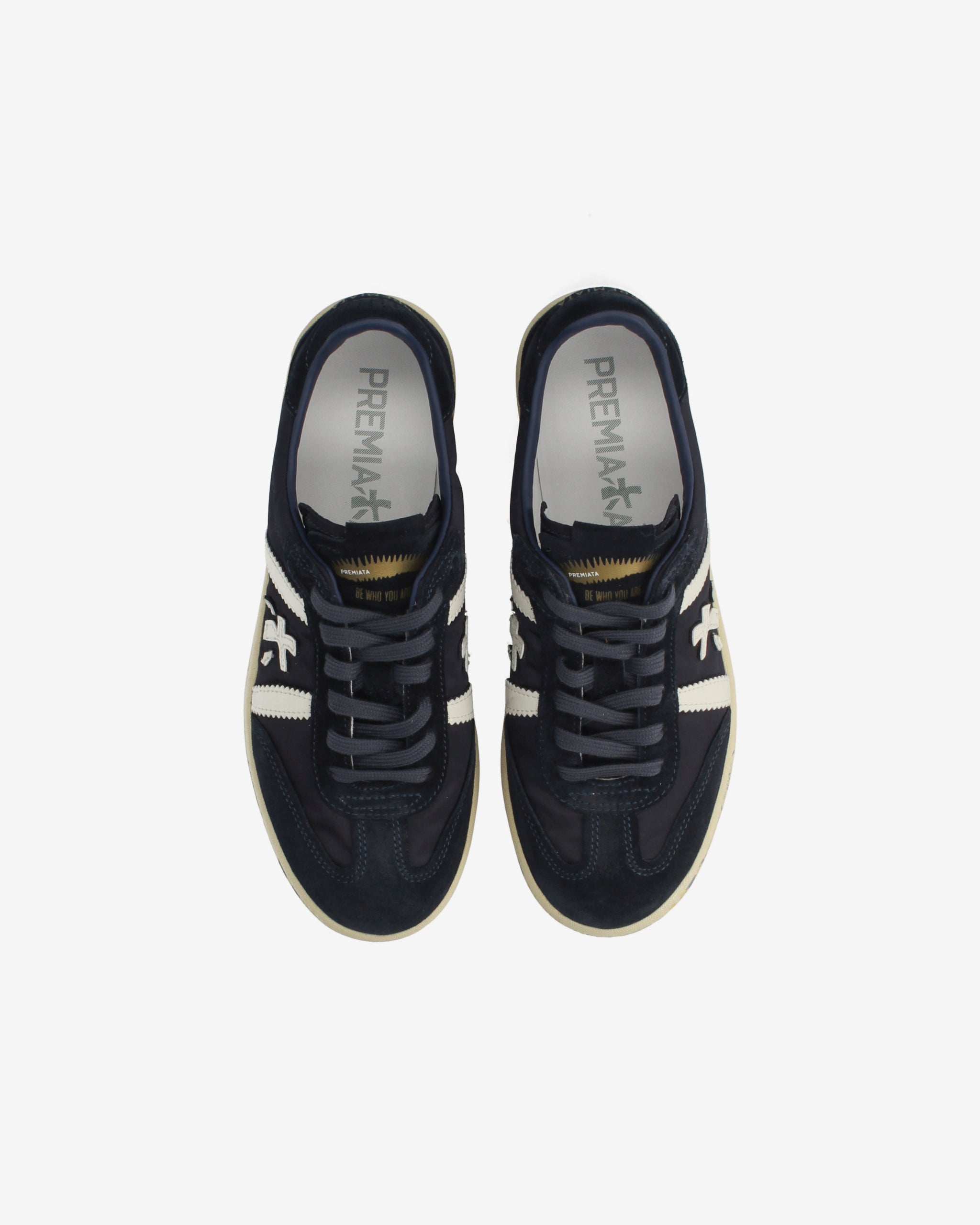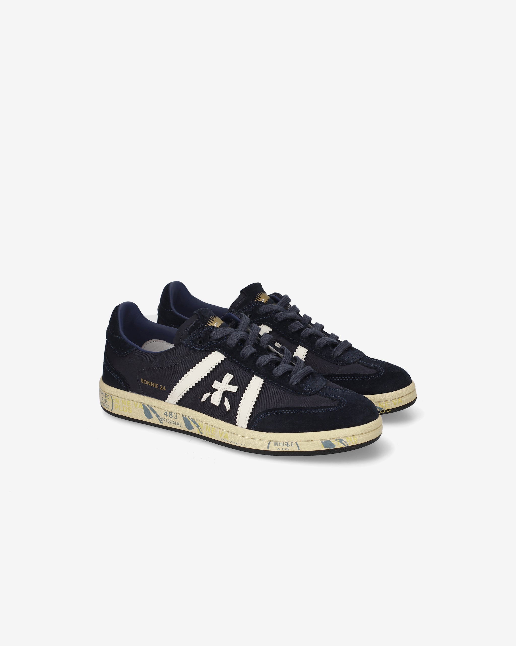 This sneaker with a sporty, contemporary look features a dark blue upper with white details and "BONNIE 24" lettering on the side. The sole, decorated with Premiata's distinctive stamps in vibrant hues, adds an original and dynamic touch.