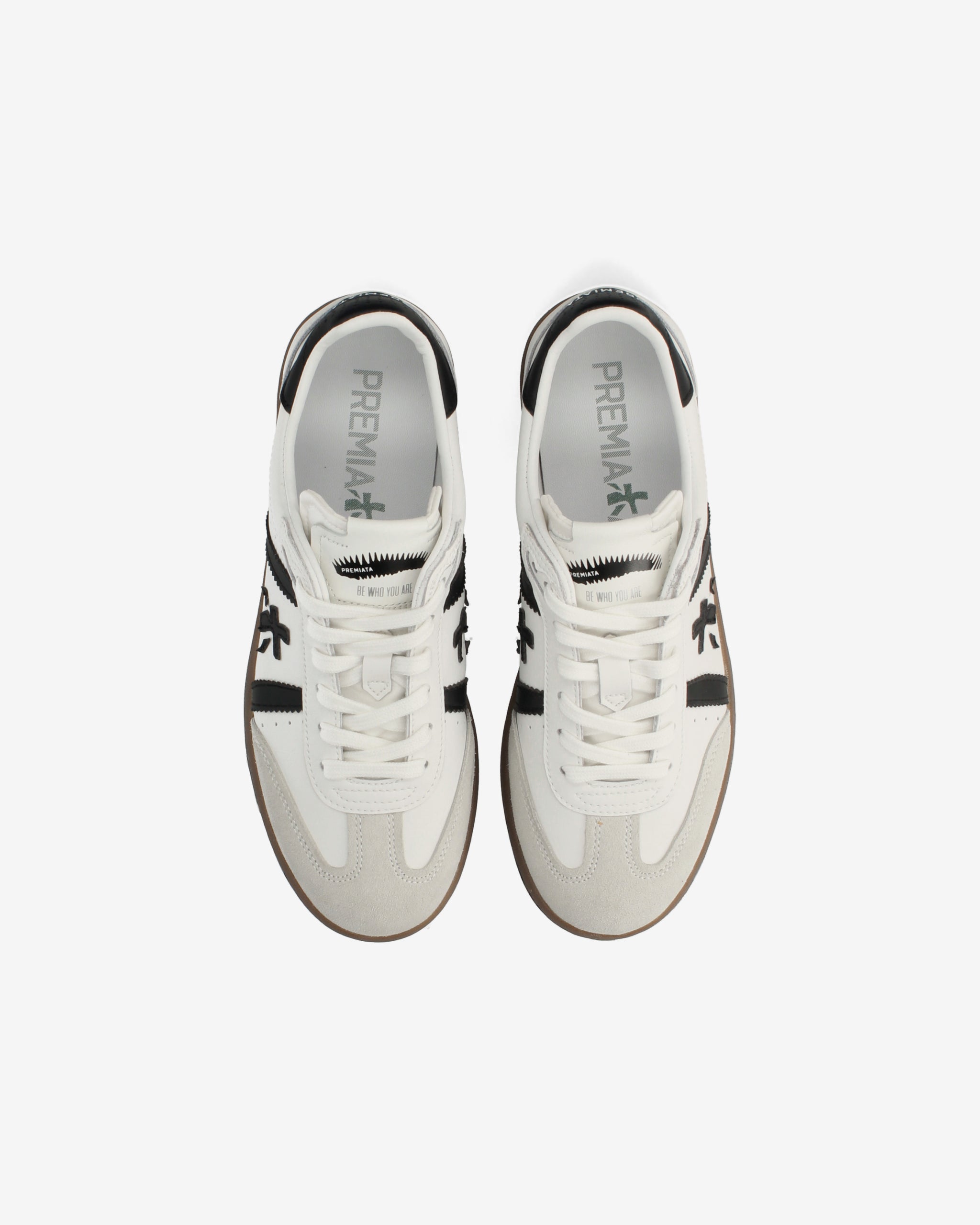 Modern sneaker design with white upper and contrasting black details. The sole decorated with distinctive stamps complete a sporty, urban look perfect for everyday wear.
