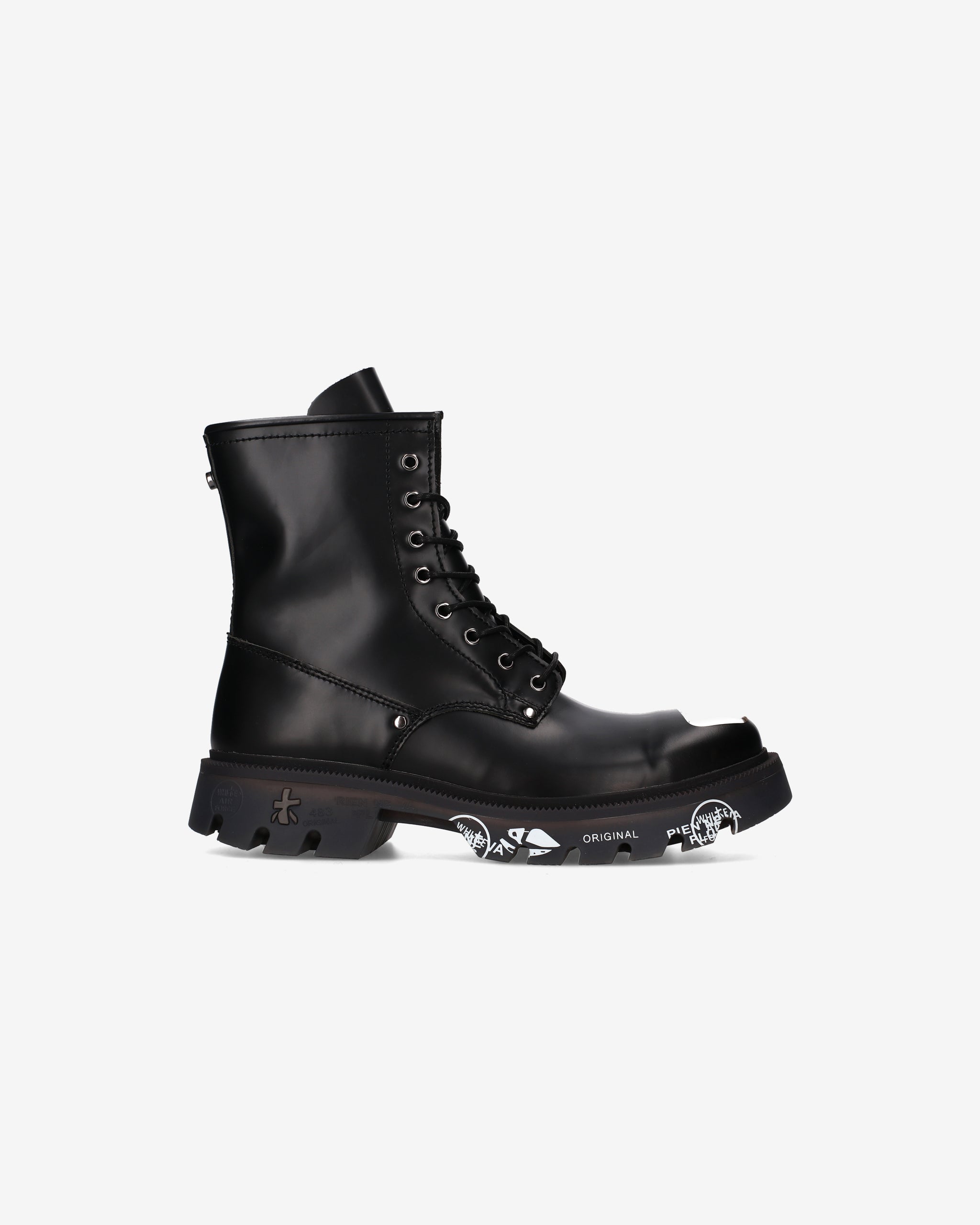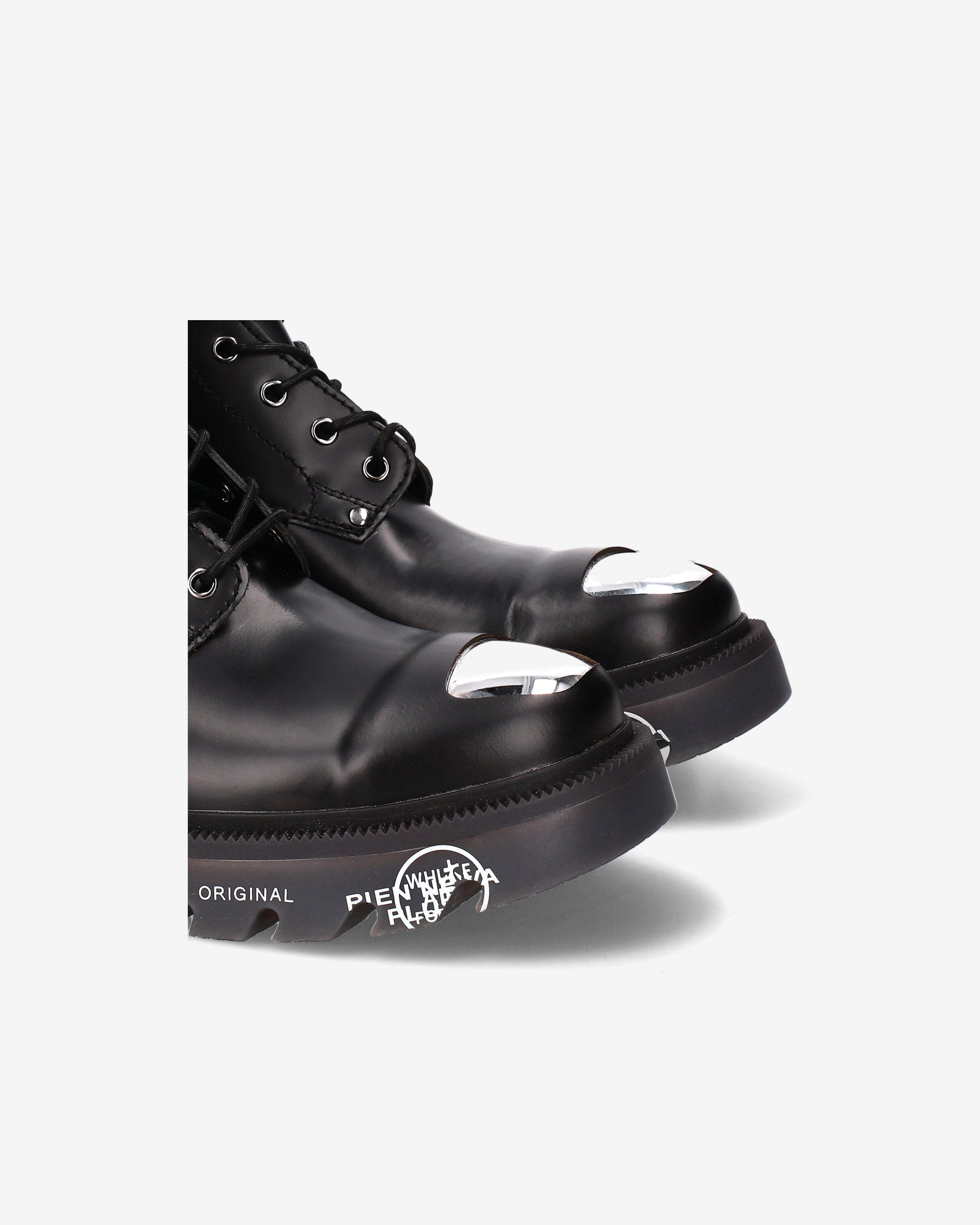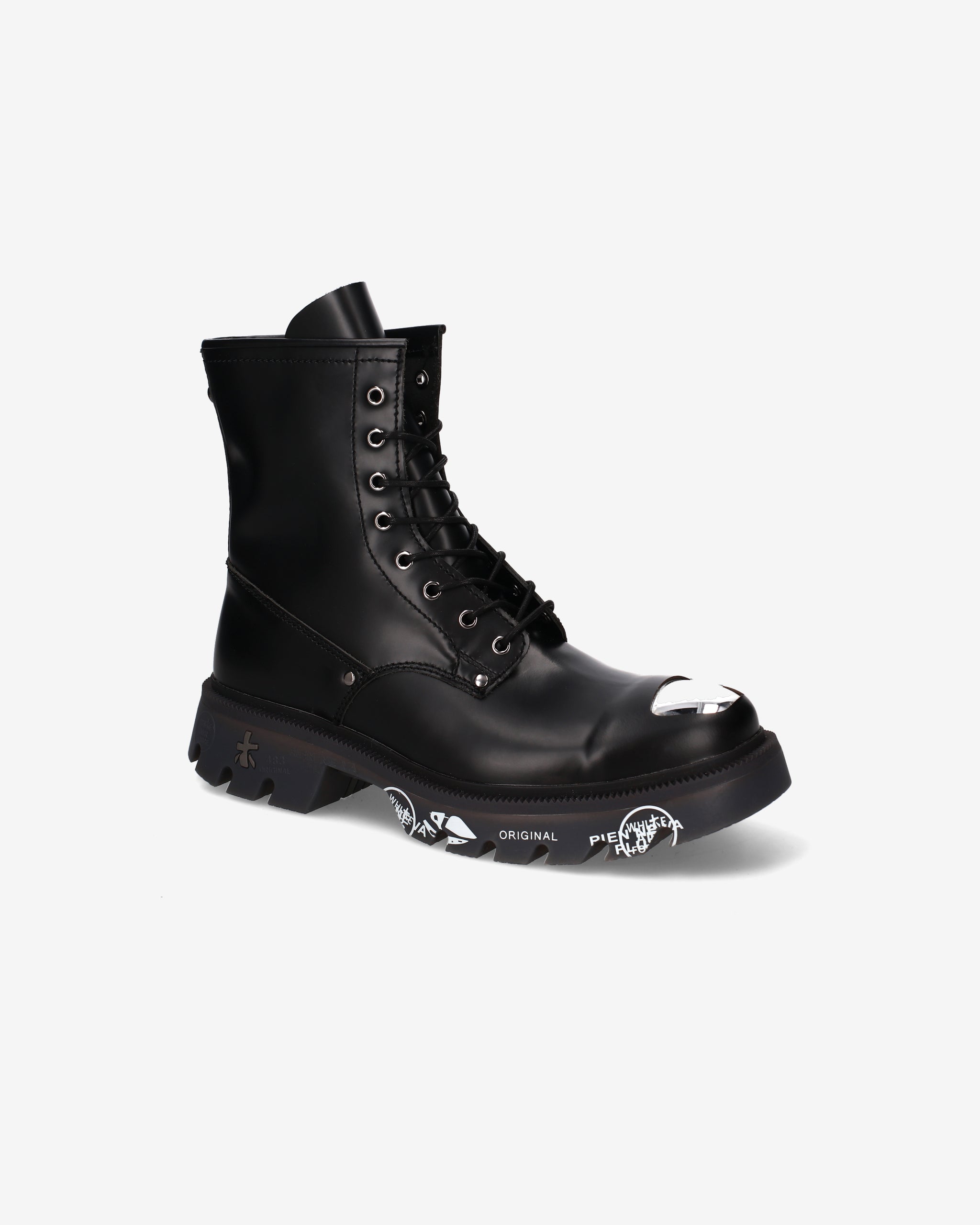 Black brushed calf leather amphibian with chrome nickel toe cap and accessories. A mix of polished elegance and metallic details for a bold look inspired by London's underground aesthetic.