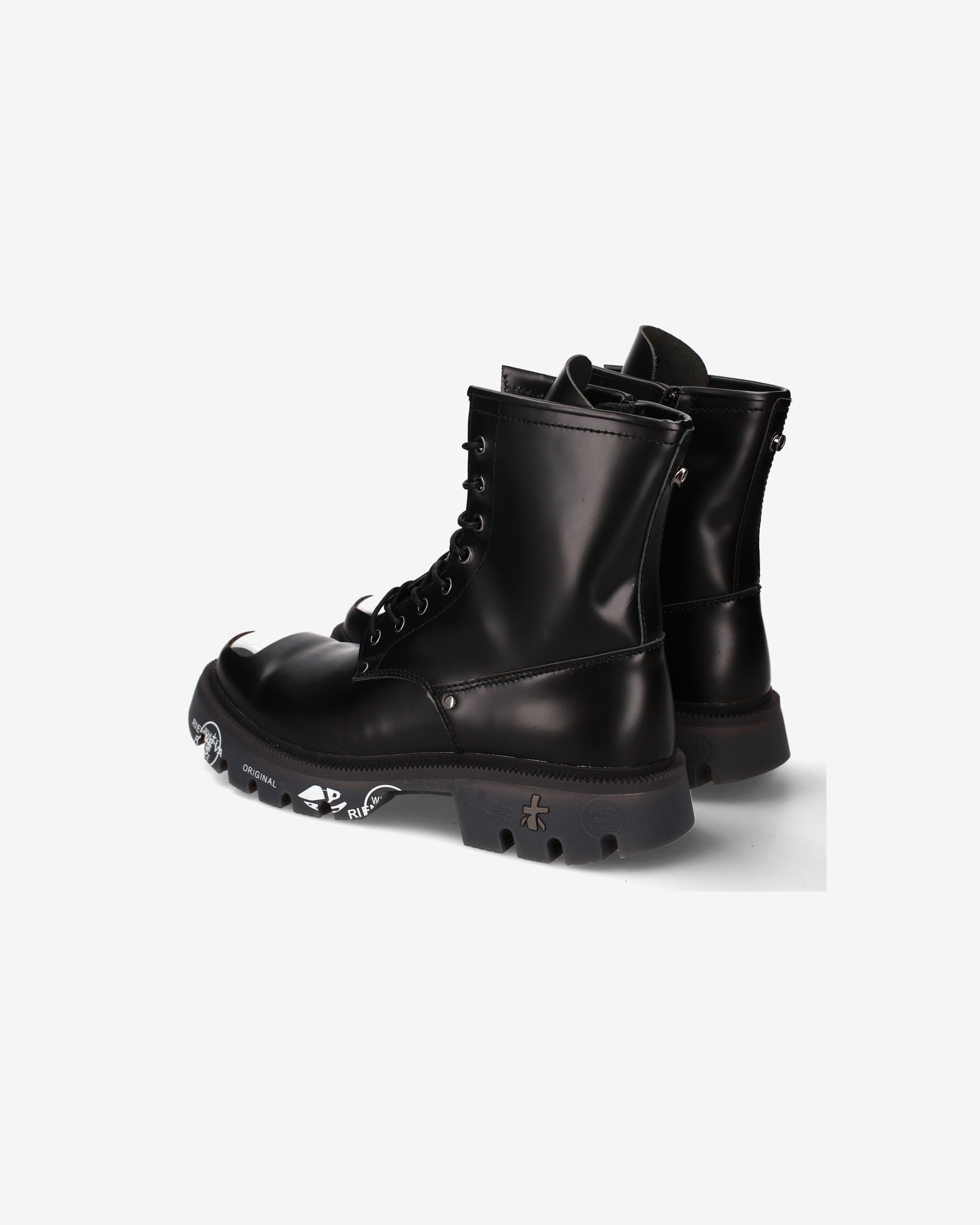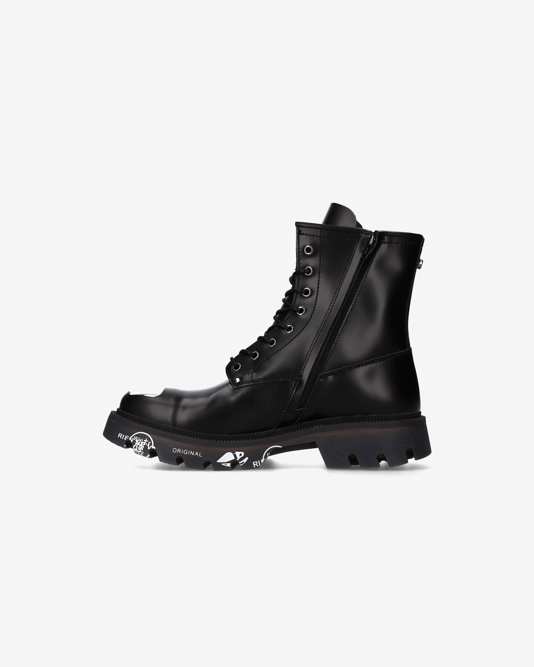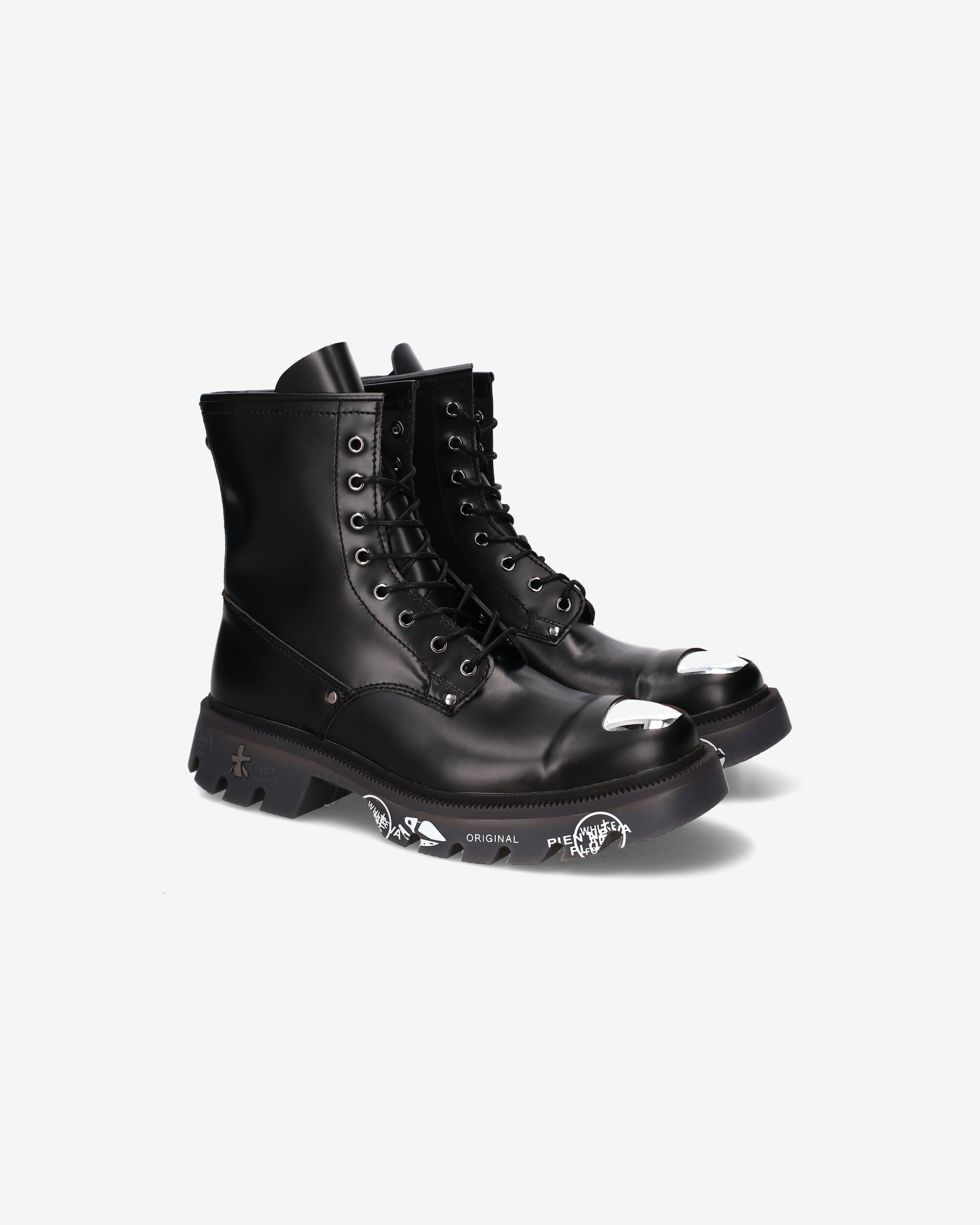 Black brushed calf leather amphibian with chrome nickel toe cap and accessories. A mix of polished elegance and metallic details for a bold look inspired by London's underground aesthetic.