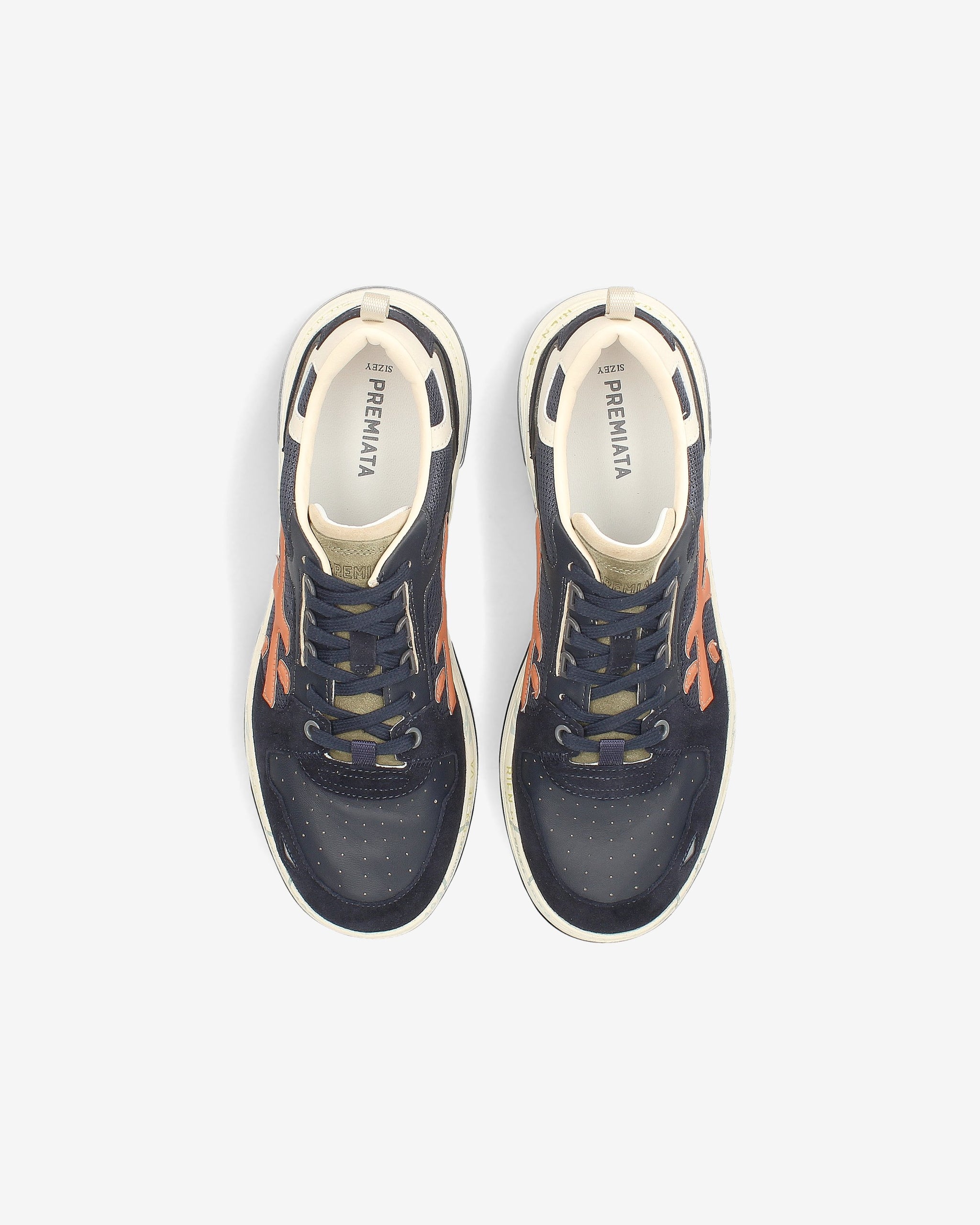 Una sneakers con un design unico nella tonalità del blu, arricchita da dettagli colorati. Realizzata con una combinazione attenta di pellami pregiati e tessuti, ad arricchire il tutto i diversi elementi che ne identificano il brand. Il fondo è un mix di vari componenti che regalano un estremo comfort.