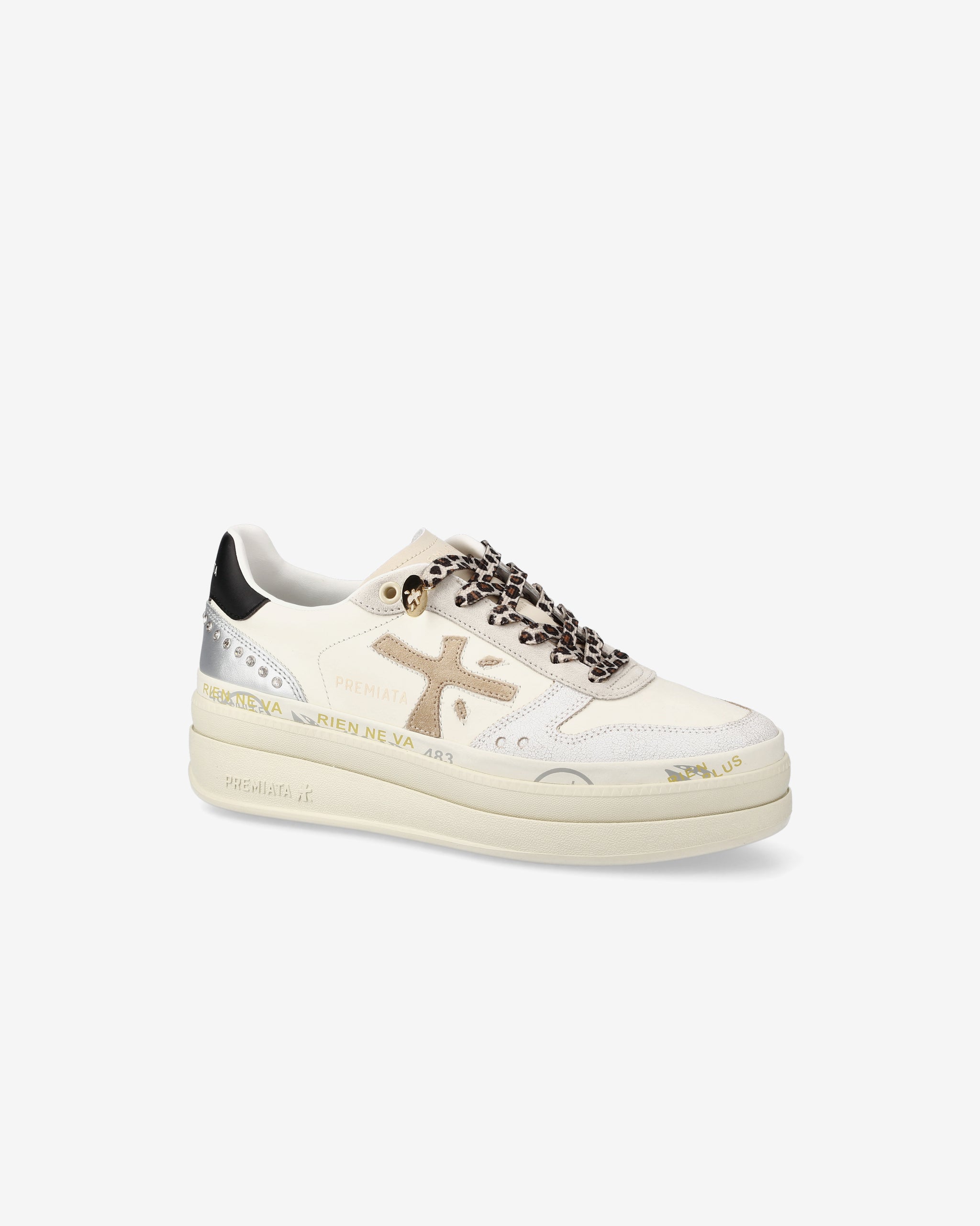 Among Premiata's new must-haves. Style reaches new heights, combining designs such as a double-layered platform sole with a midsole embellished with the brand's iconic stamps.