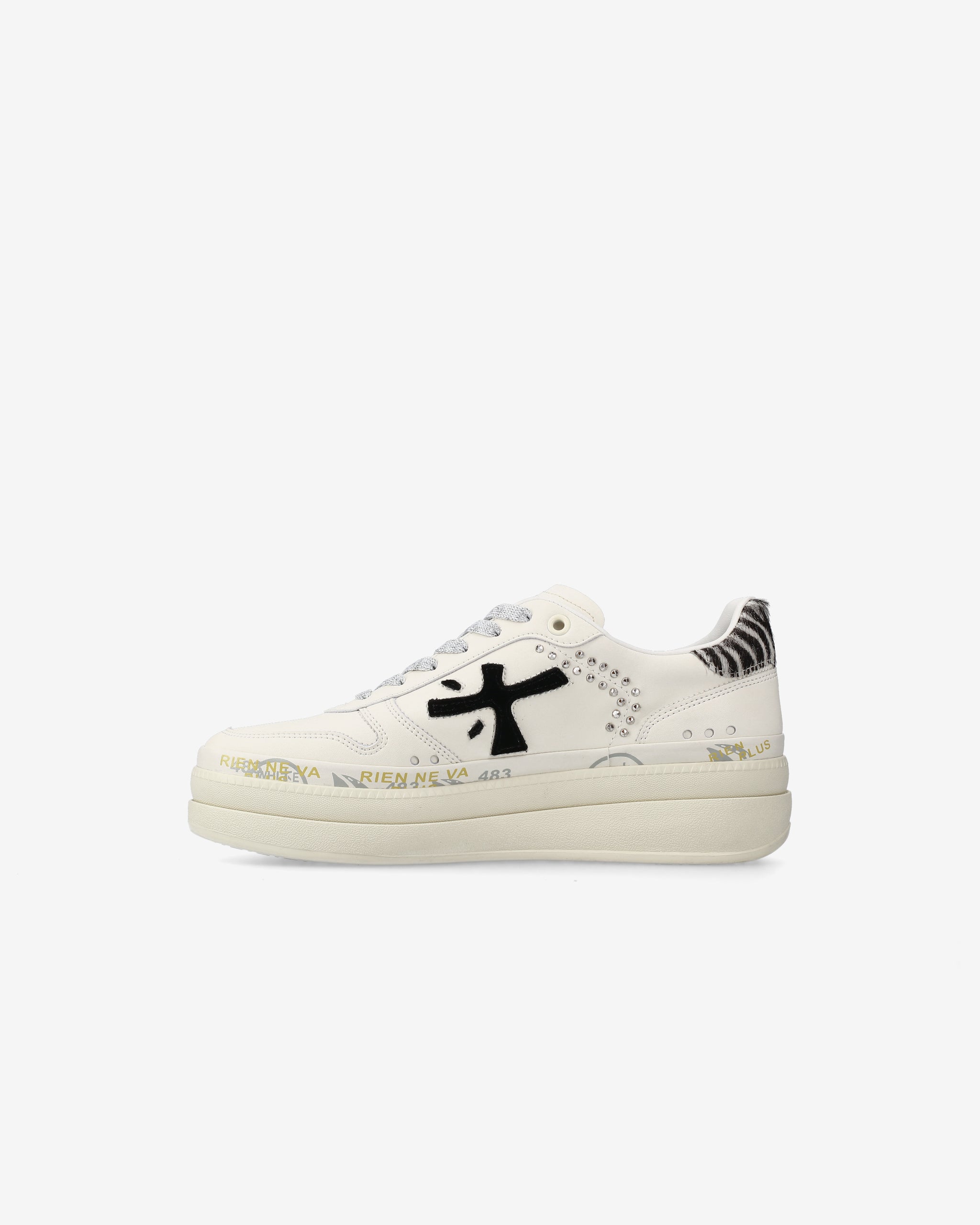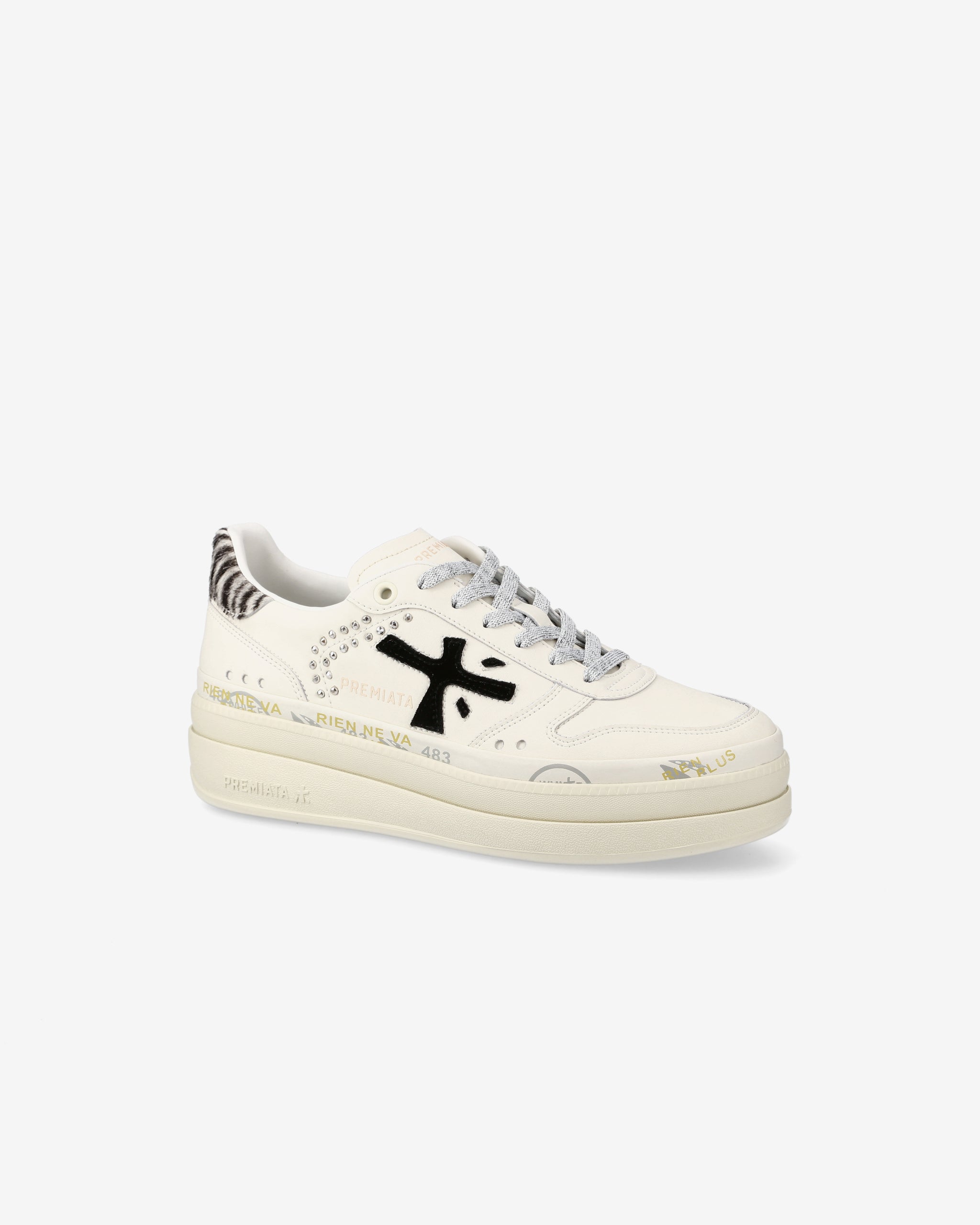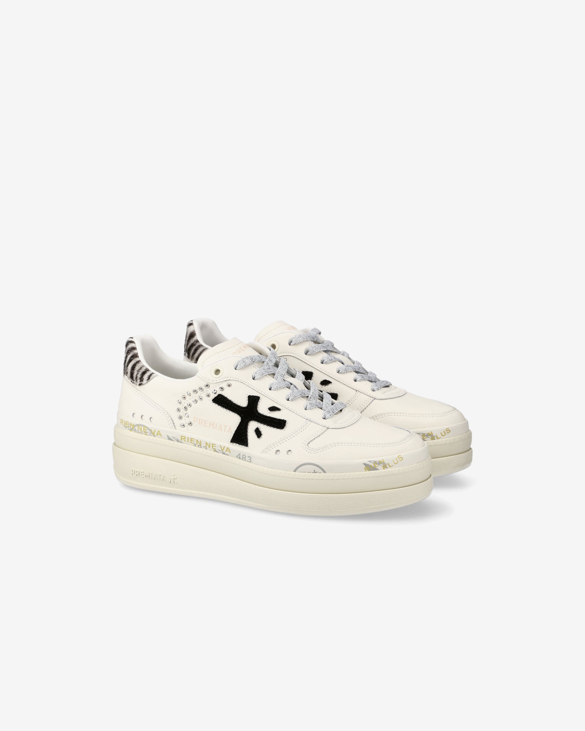 Among Premiata's new must-haves. Style reaches new heights, combining designs such as a double-layered platform sole with a midsole embellished with the brand's iconic stamps.