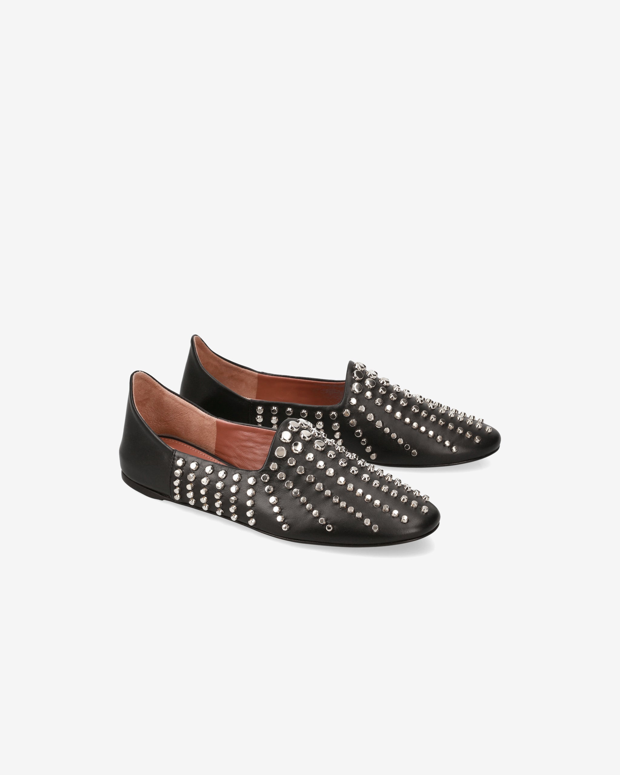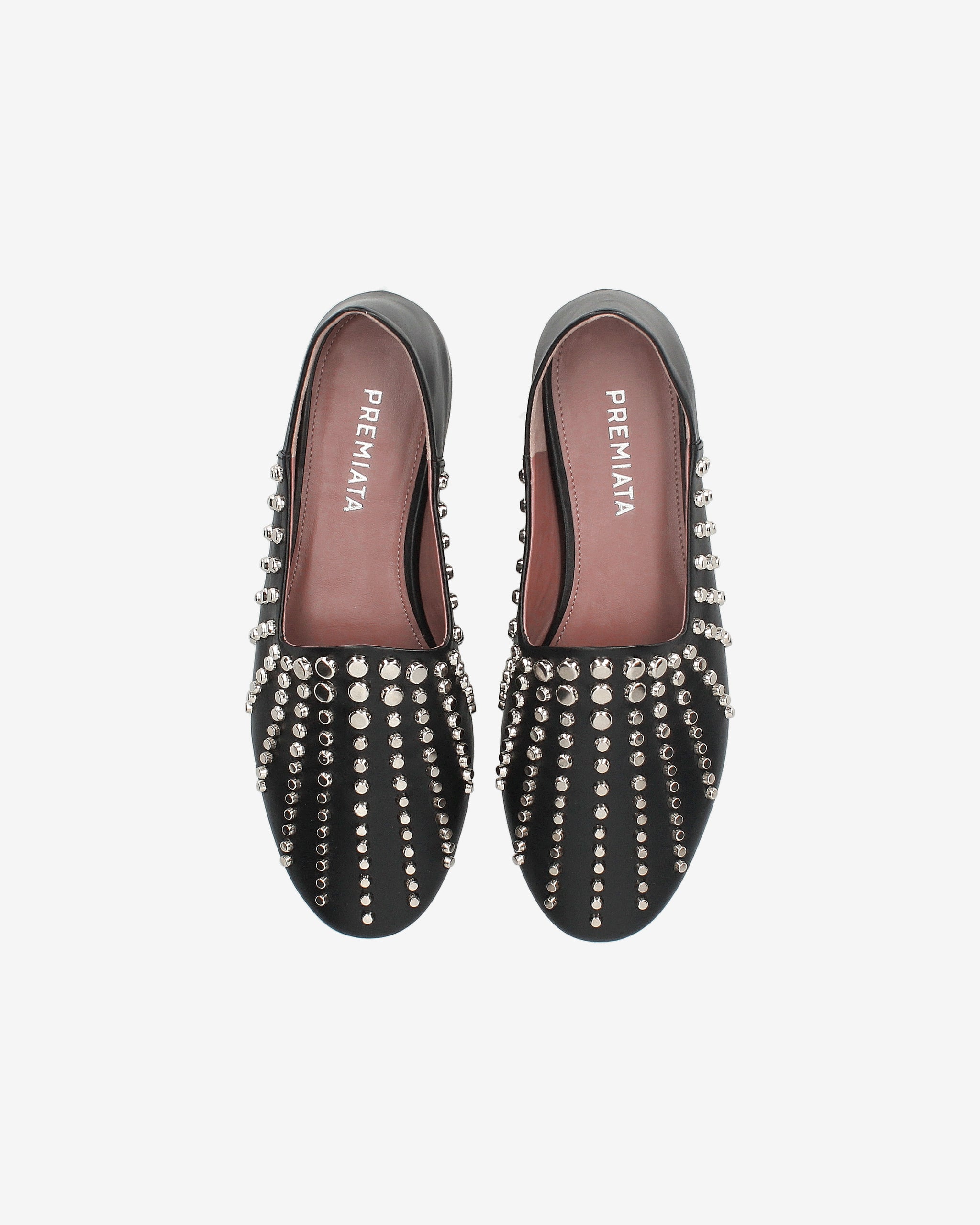 Boldly styled Moroccan made of black calfskin and embellished with nickel studs that give a rock and contemporary look.