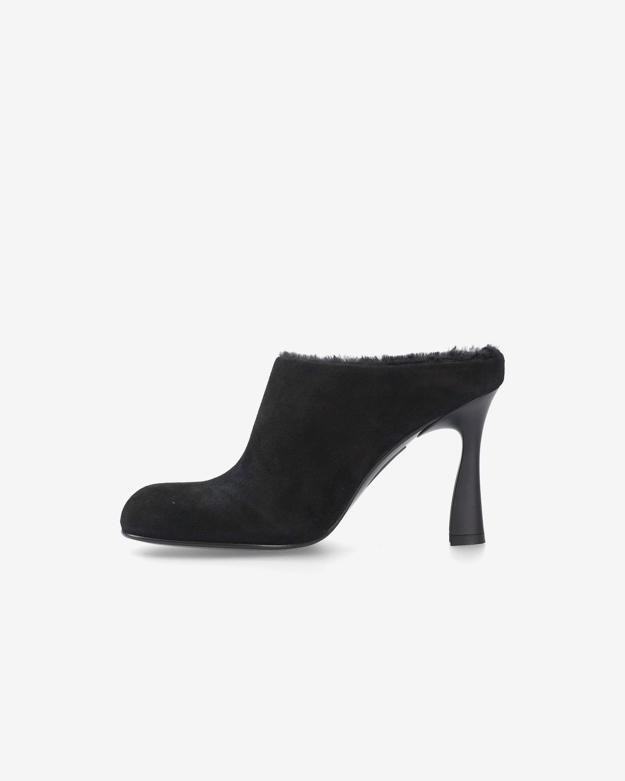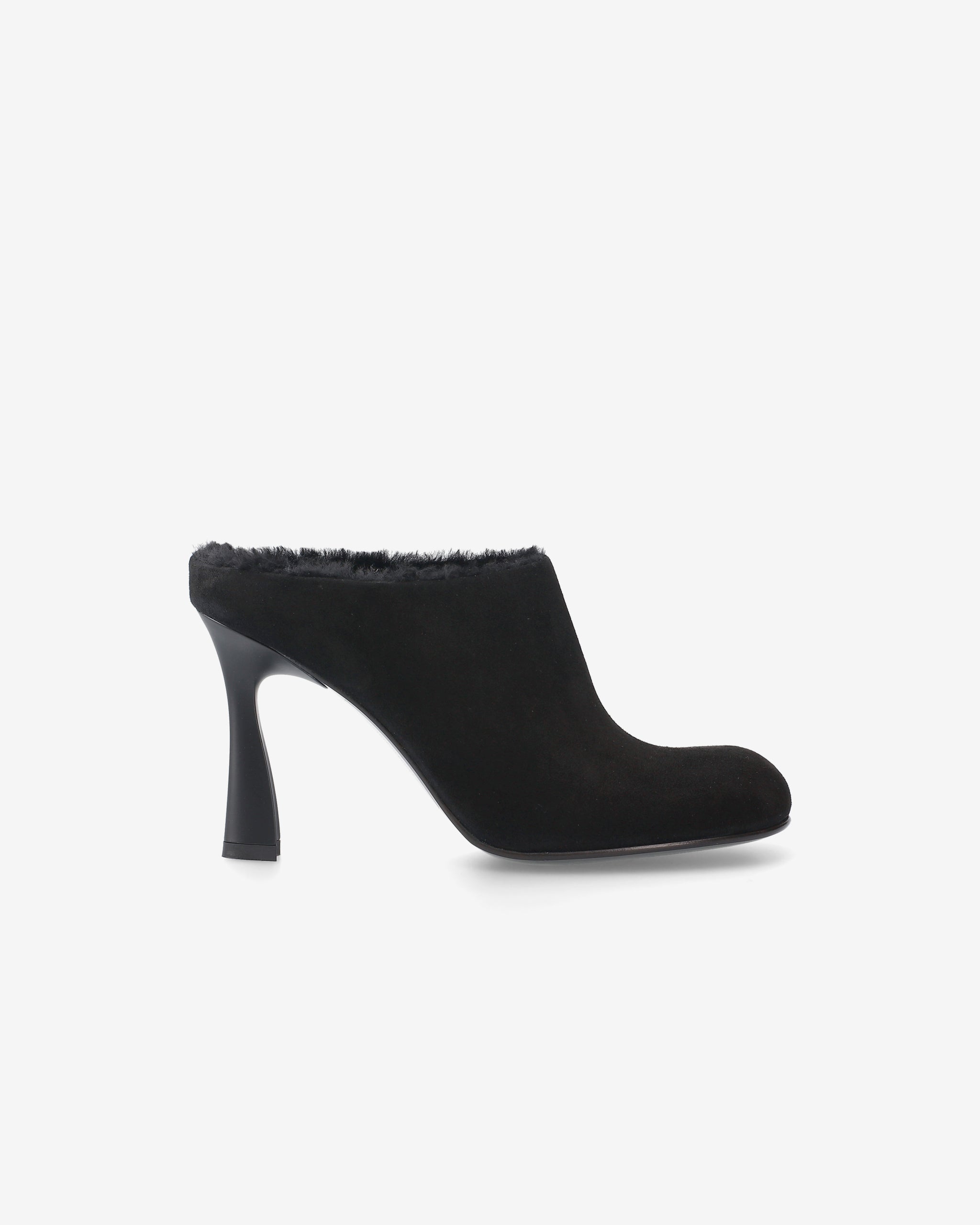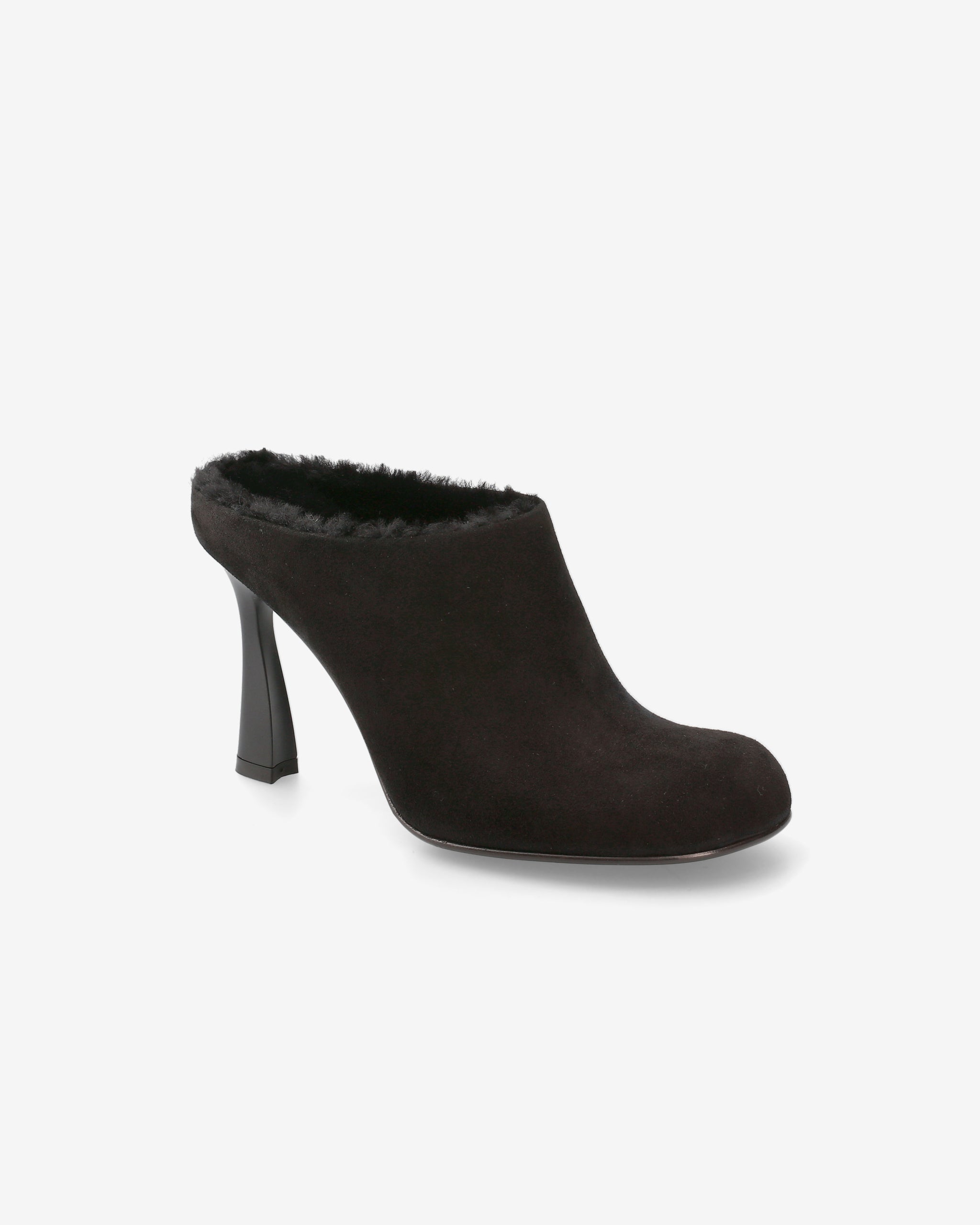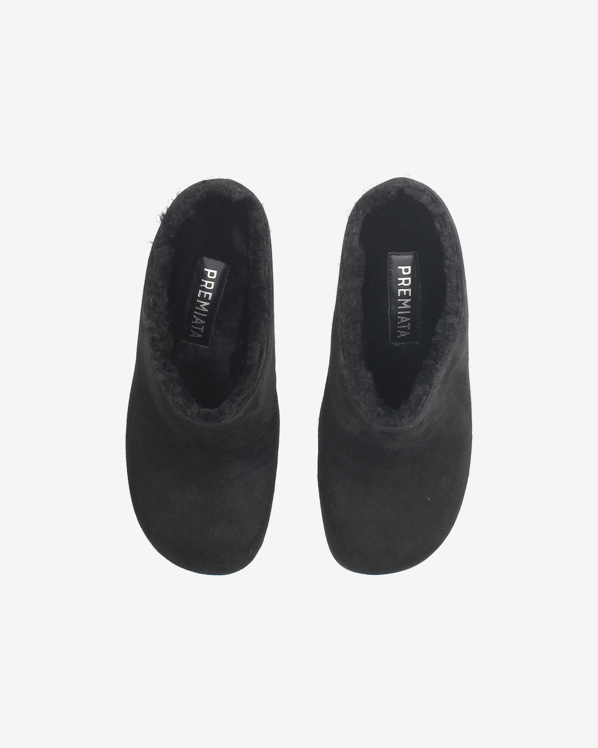 Women's Slippers with a warm and snug design, ideal for facing winter in style and comfort. Made of black suede, it is lined with soft natural sheepskin wool to provide a warm and cozy feel throughout the day.
