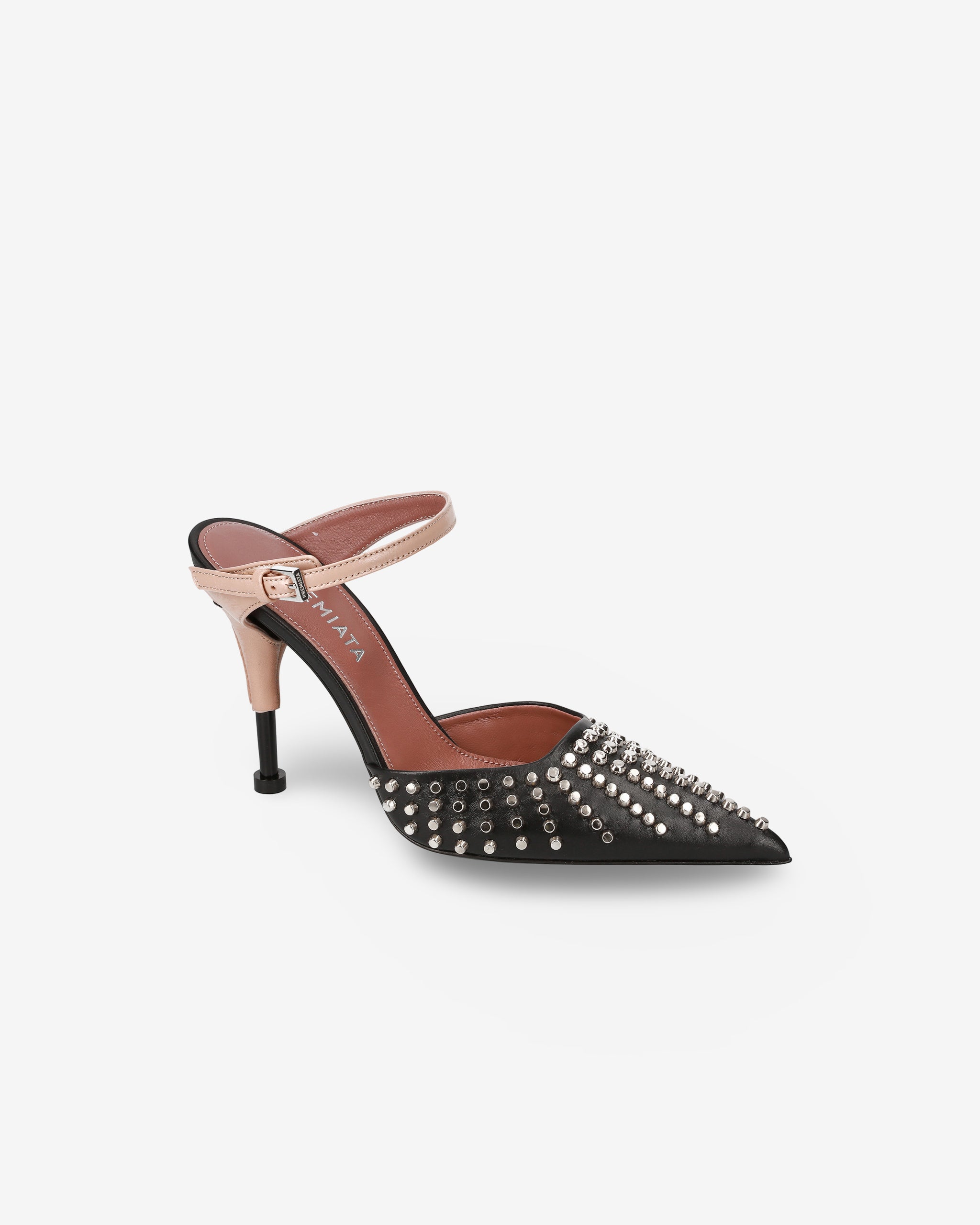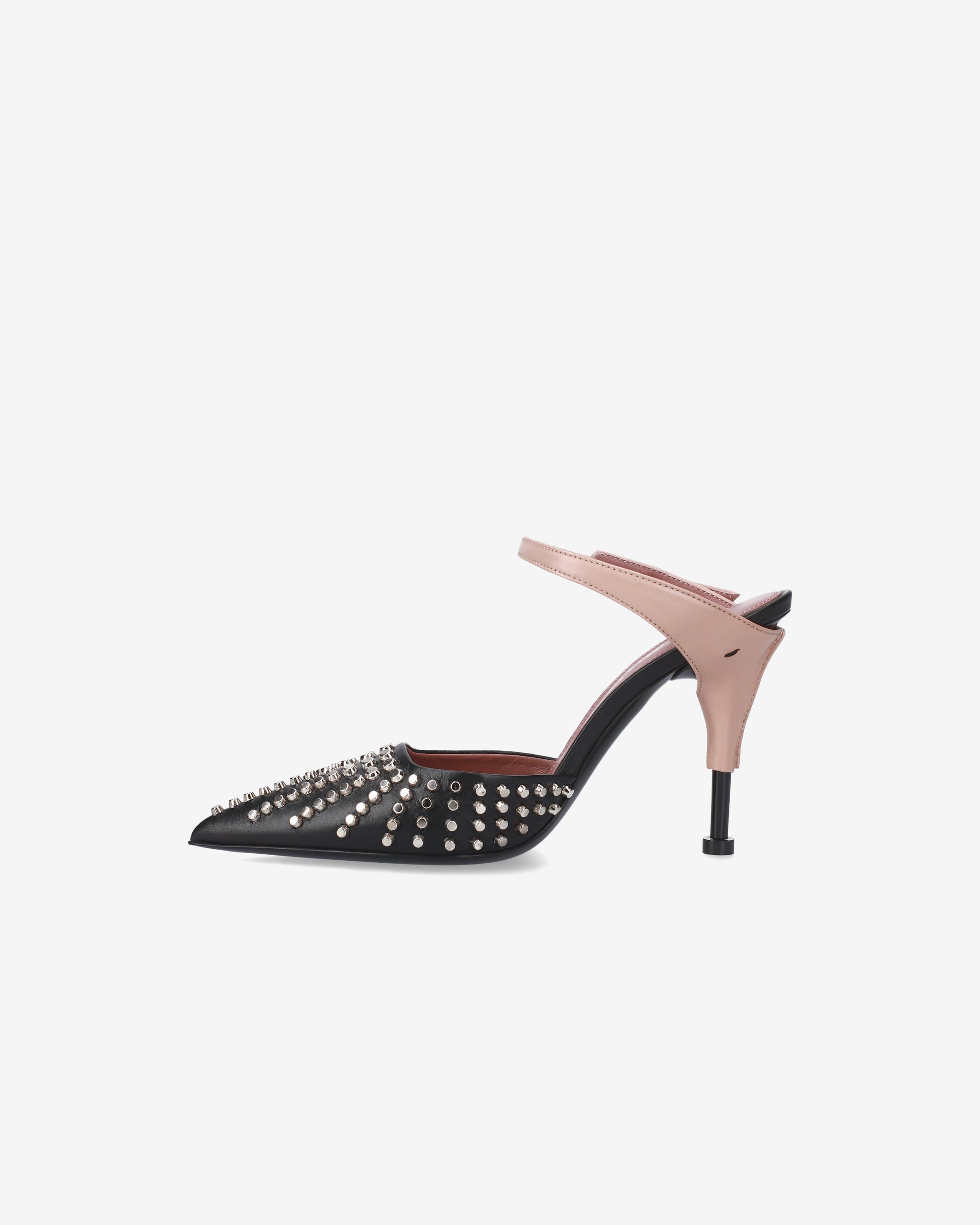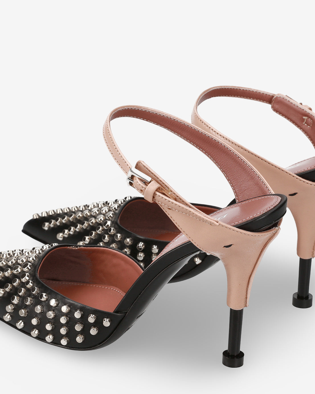 Mules Rock feature a black calfskin upper embellished with nickel studs, while the instep strap is made of powdery calfskin, creating an elegant and bold contrast. The black ABS heel, partially encased in the strap, completes the design, with a height of 100mm for a sophisticated and bold look.