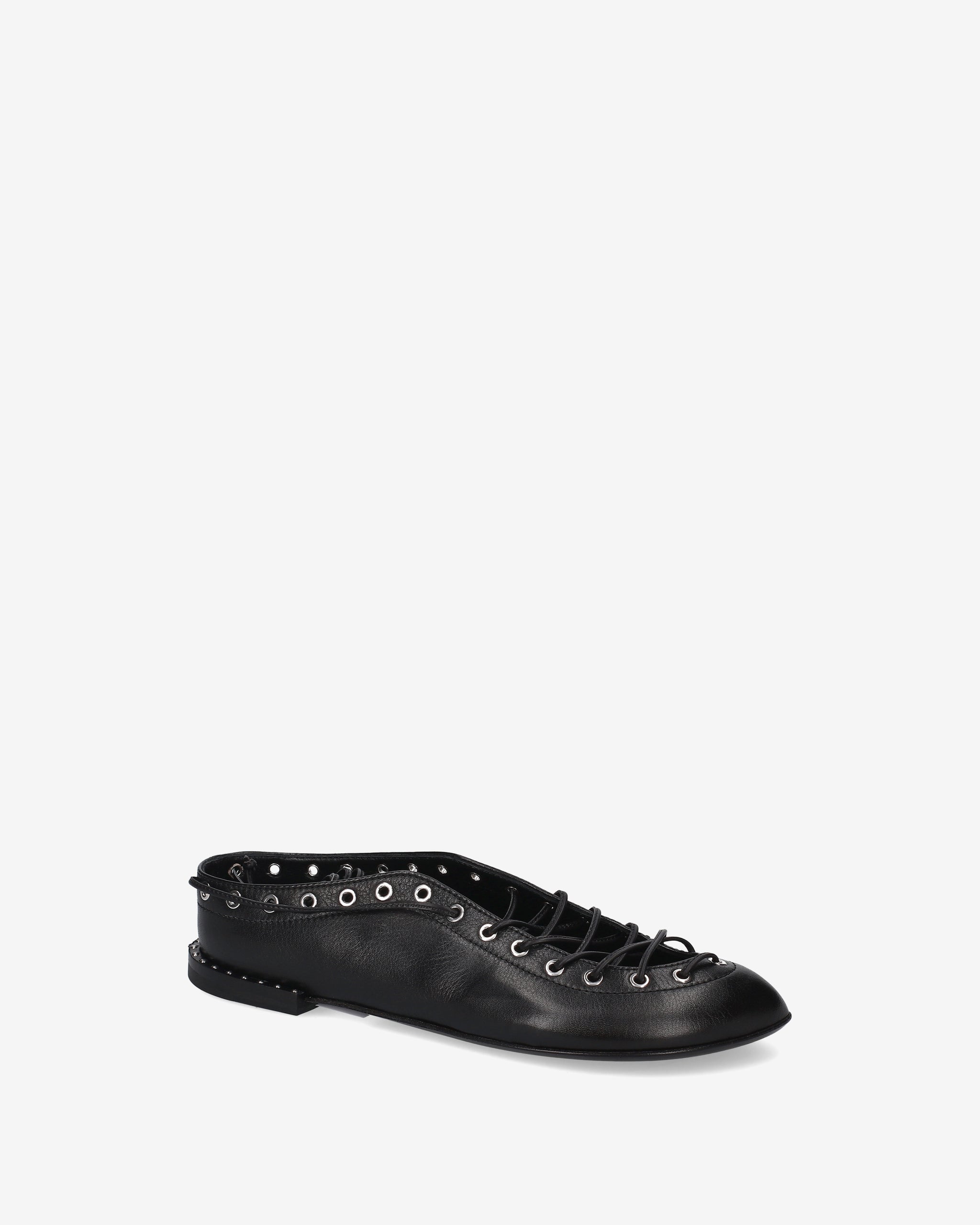A cutting-edge interpretation of the classic ballerina shoe, this lace-up combines minimalist elegance with industrial details. Crafted from black leather, it stands out for its extended lacing system that runs along the entire profile of the shoe, creating a unique and bold design.