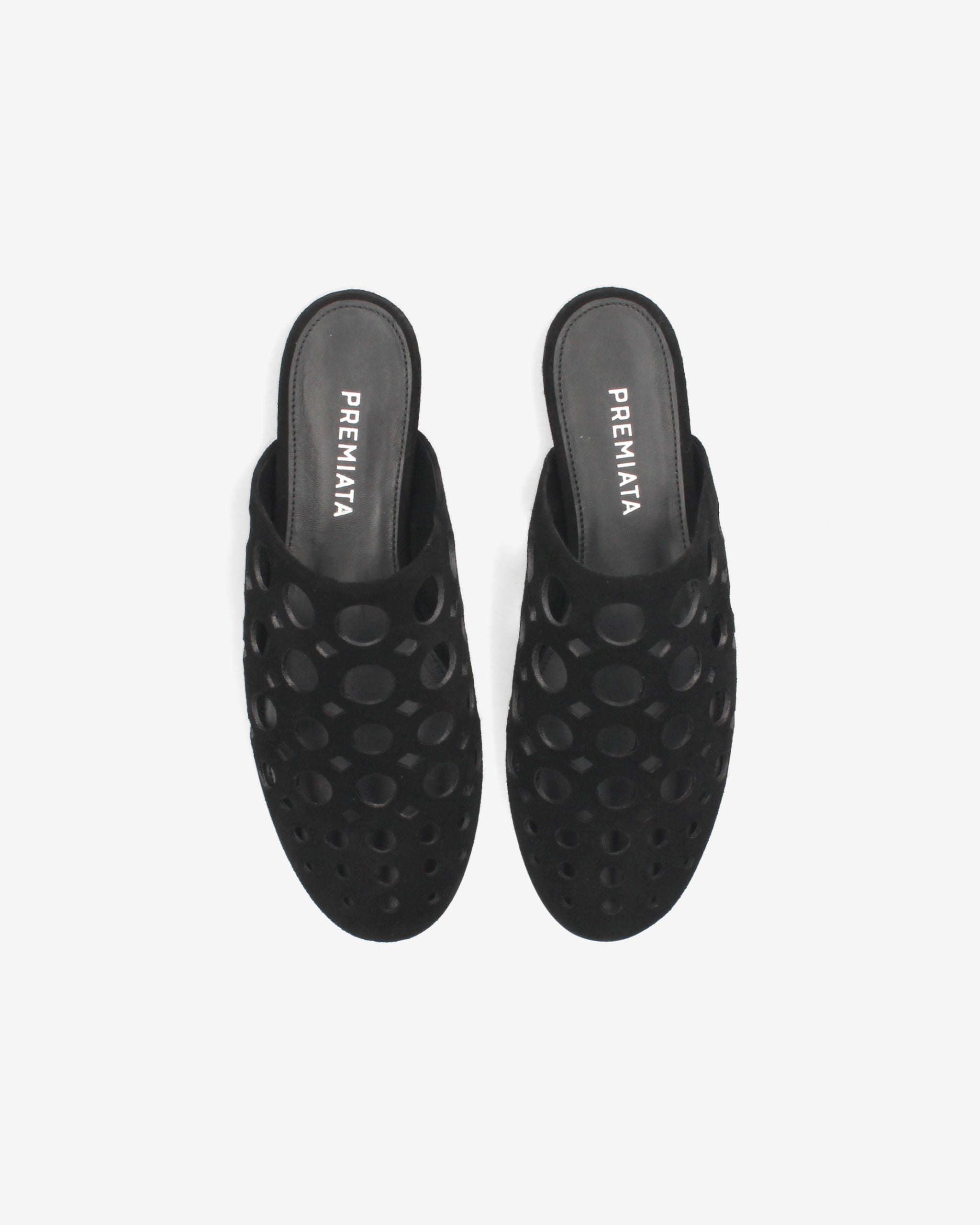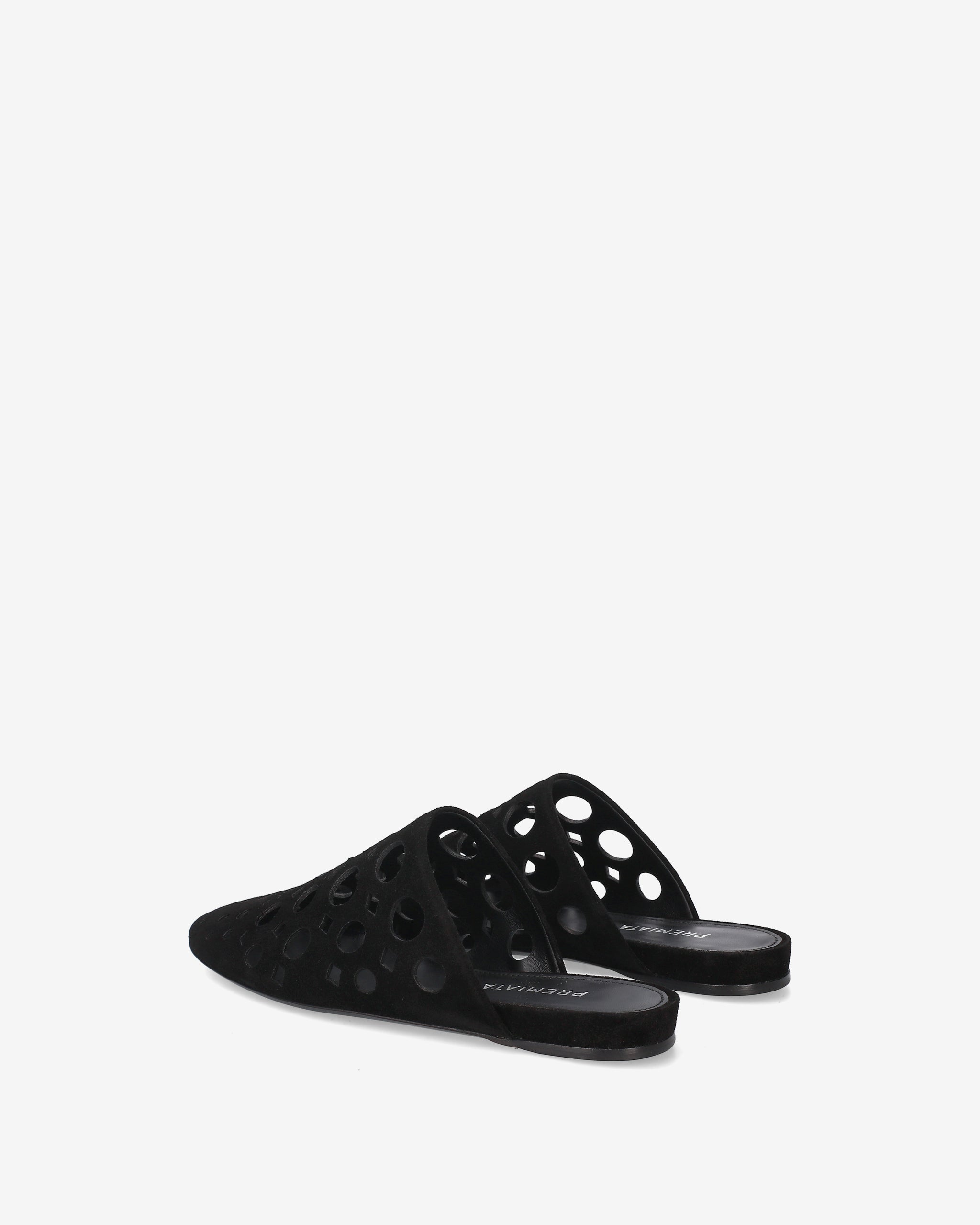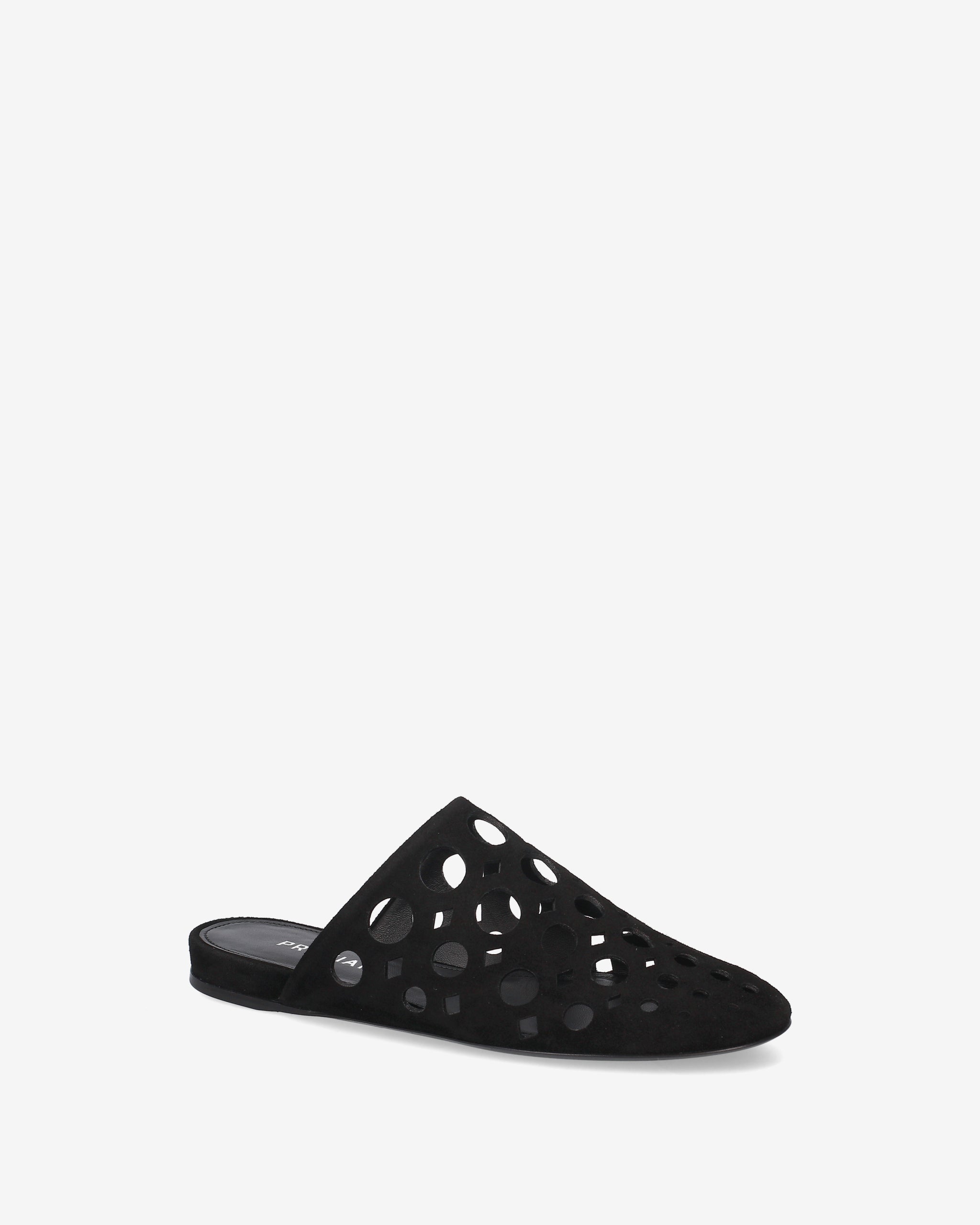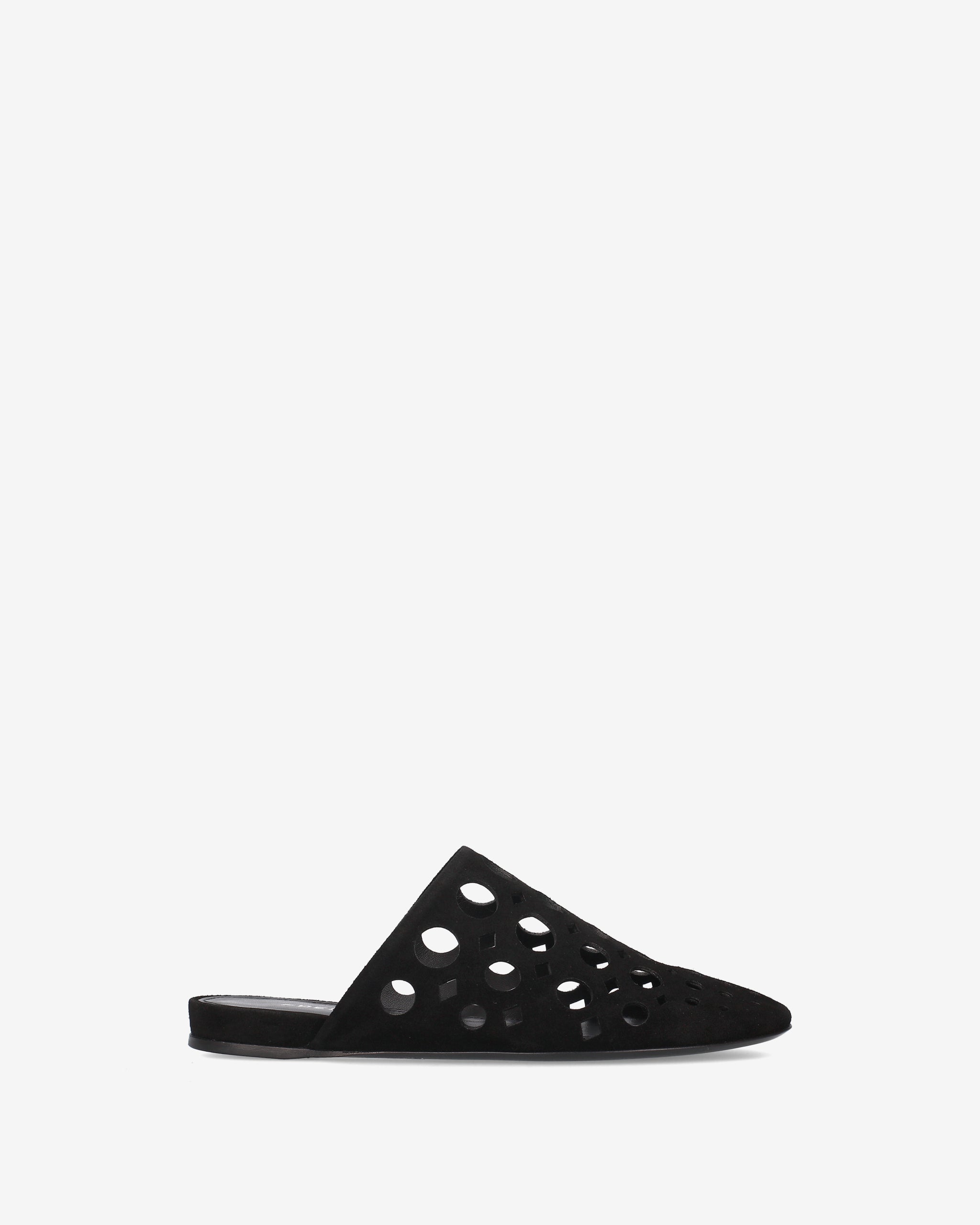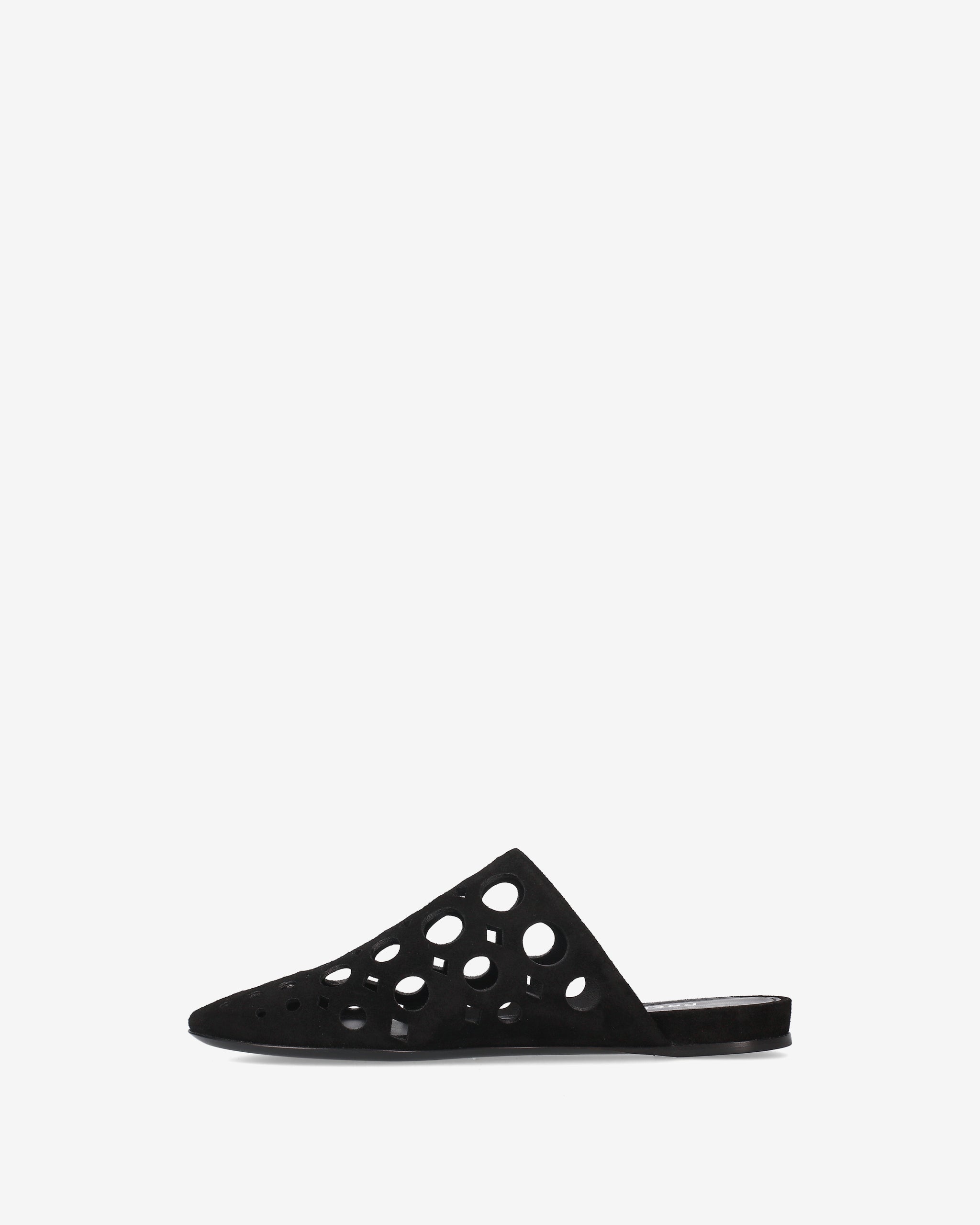 Essential and sophisticated, this sabot reinterprets the flat design with an architectural aesthetic. Made from soft black split leather, this model stands out for the interplay of solids and voids created by the geometric macro-perforations.