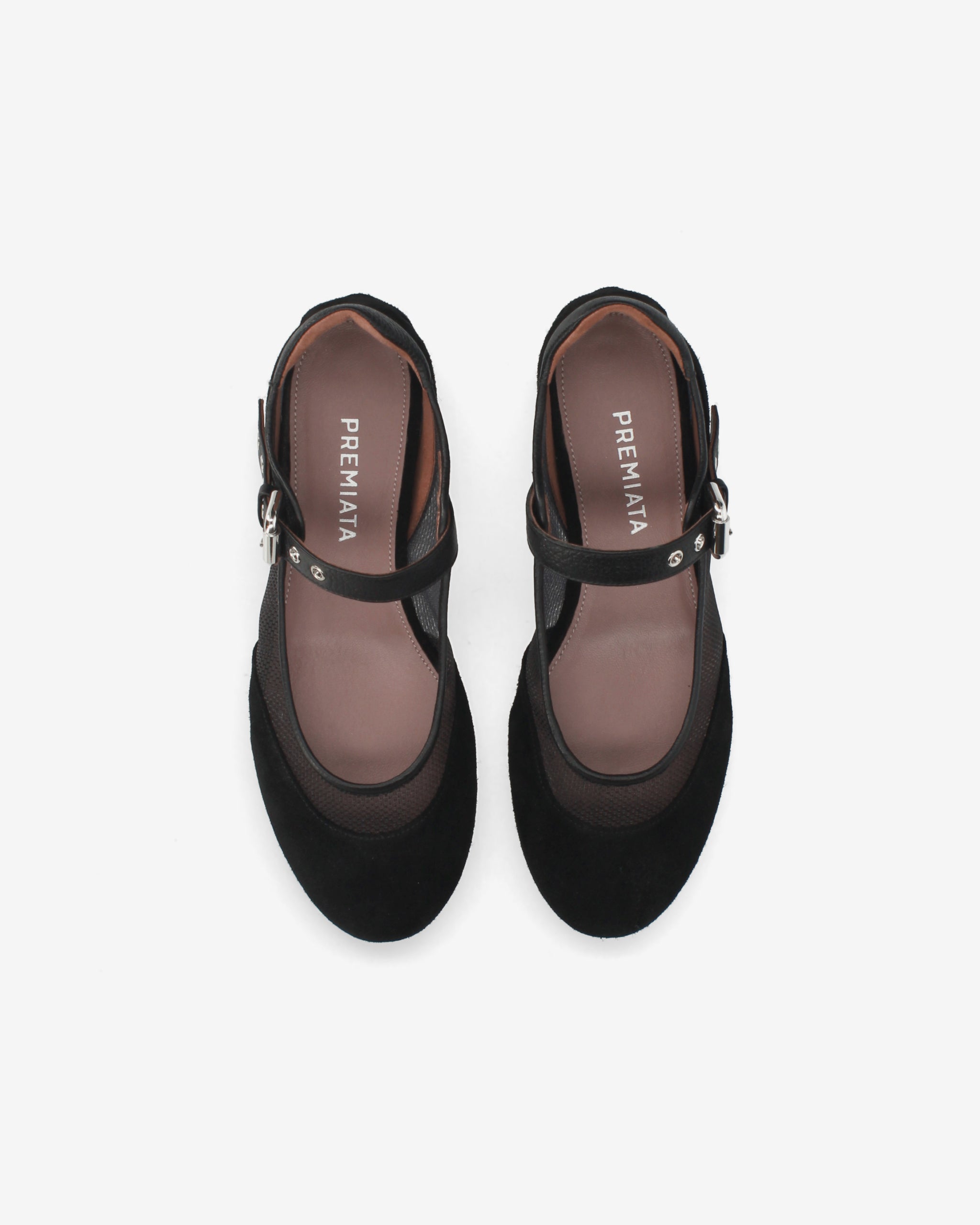 A flat shoe that combines the classic elegance of Mary Janes with a technical, futuristic aesthetic. The interplay of transparencies and the combination of different materials create a dynamic, ultra-lightweight design.