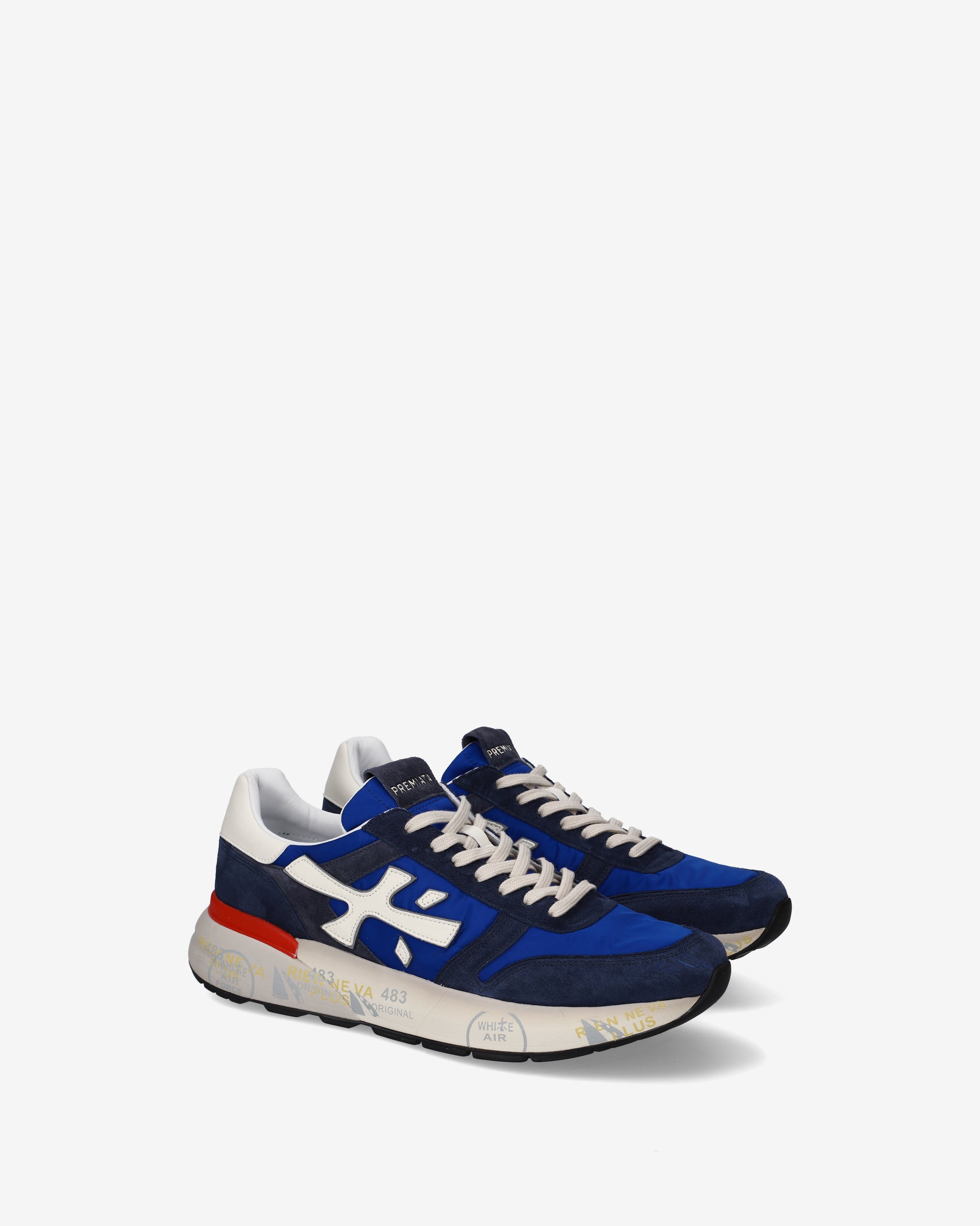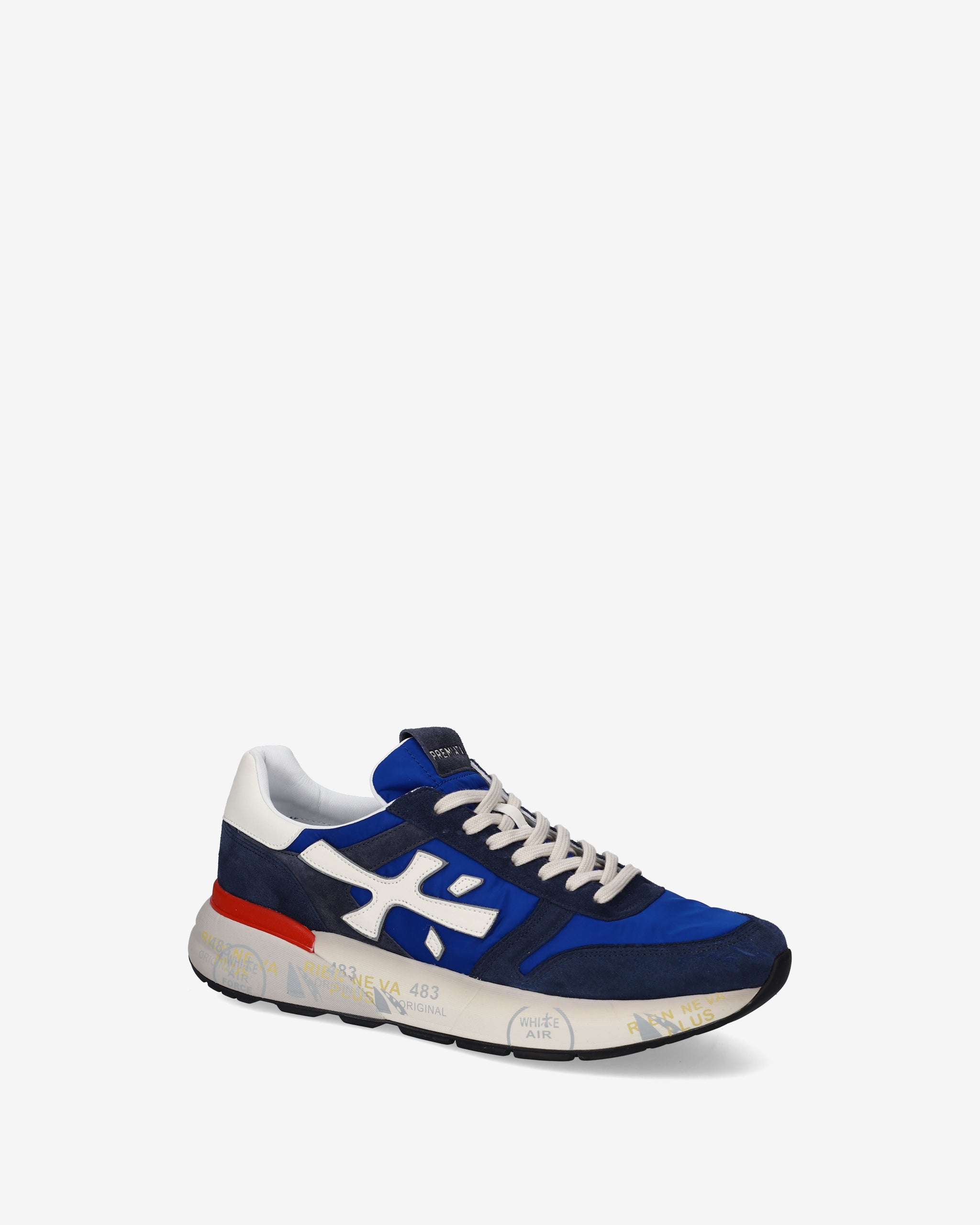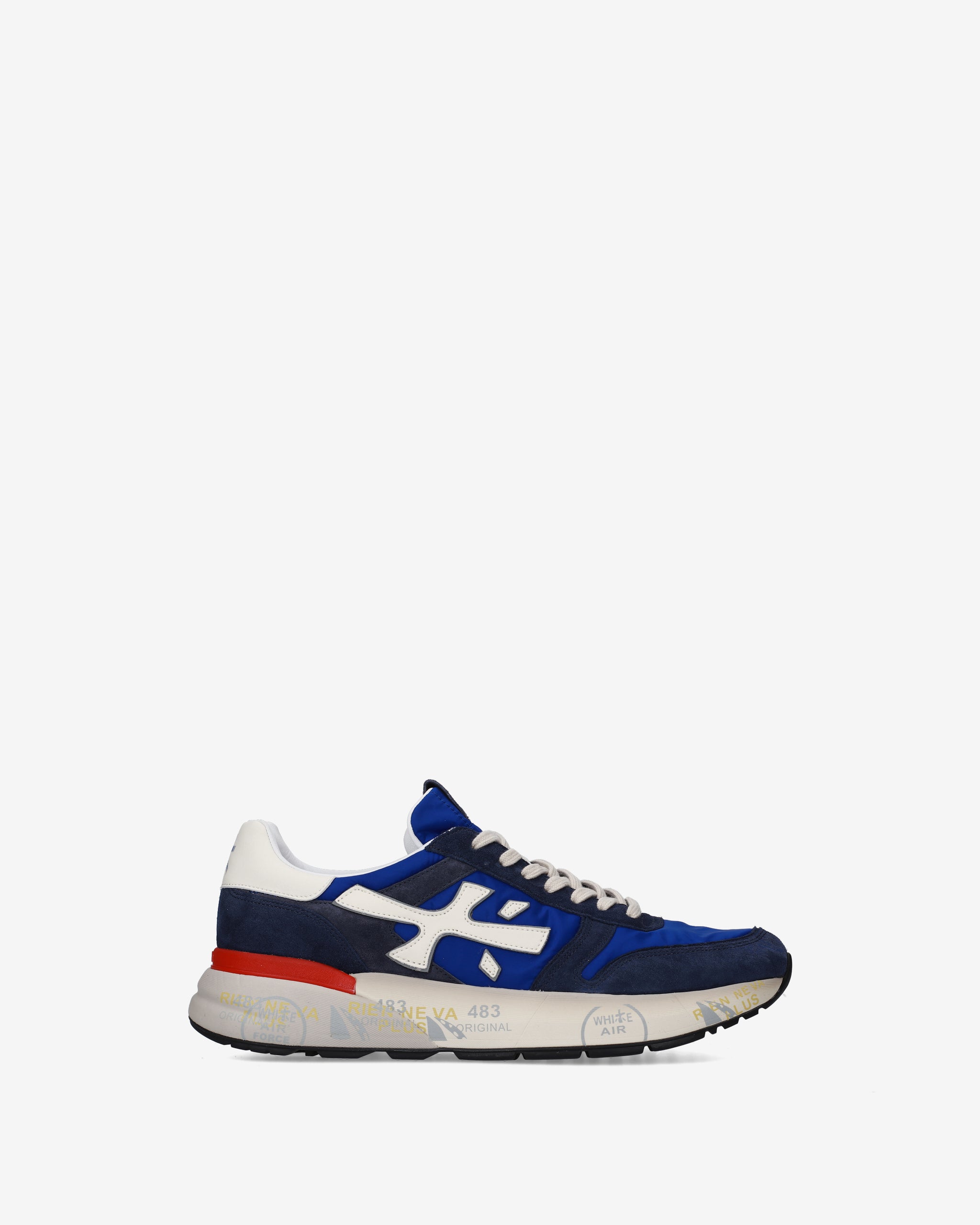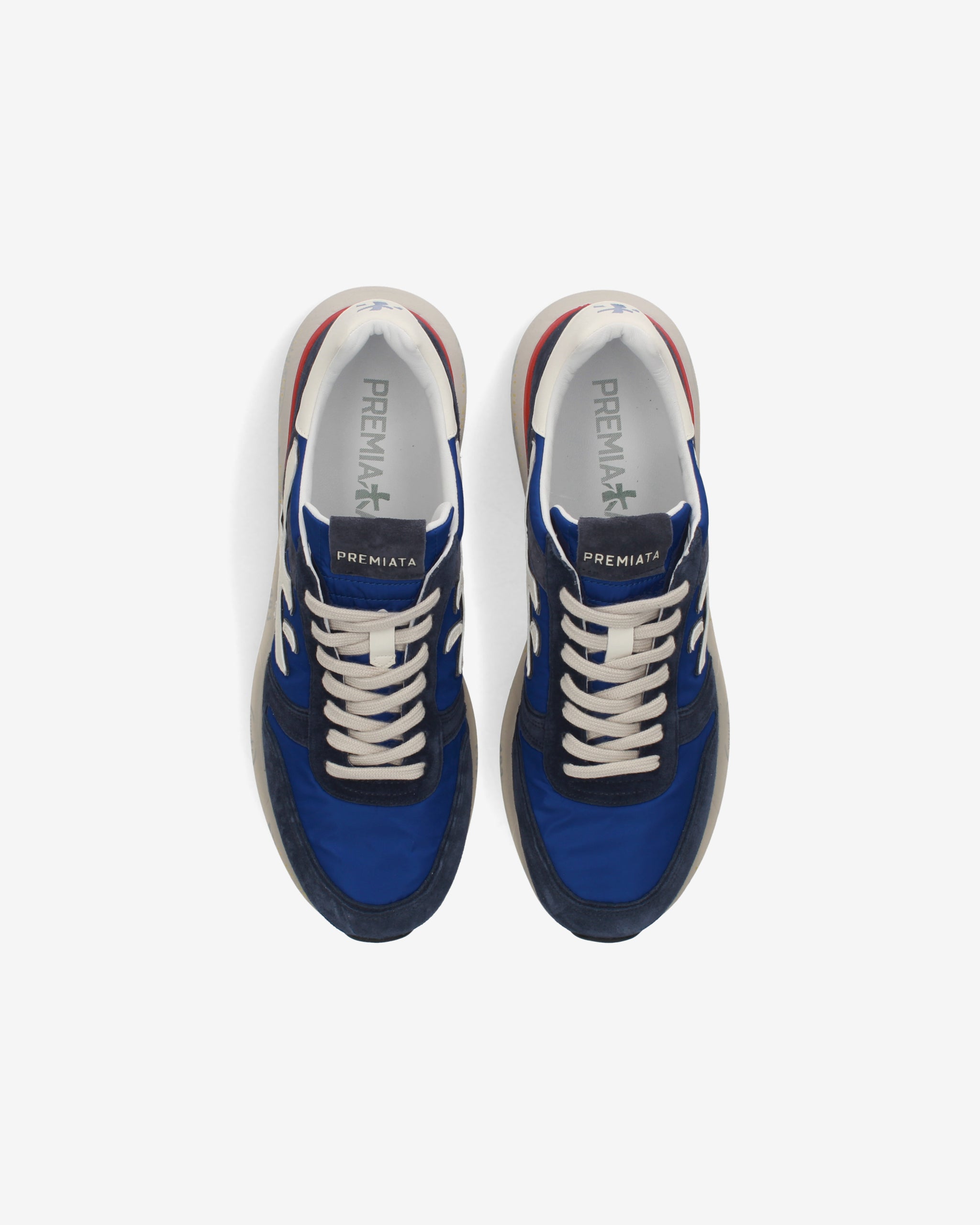 A mix of quality materials and leathers. The shoe is made in shades of blue for a casual style. The iconic silhouette is enhanced by the Premiata logo.