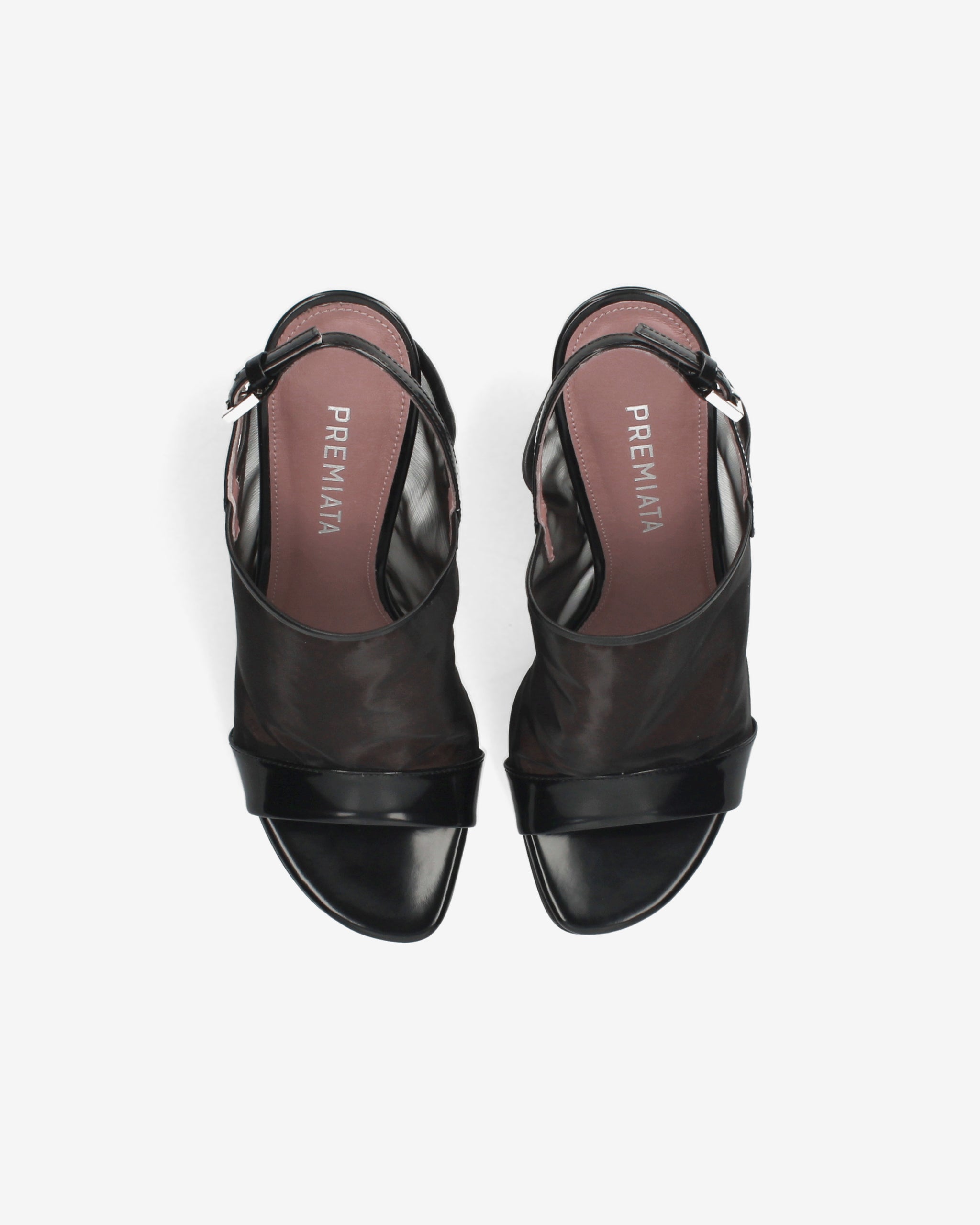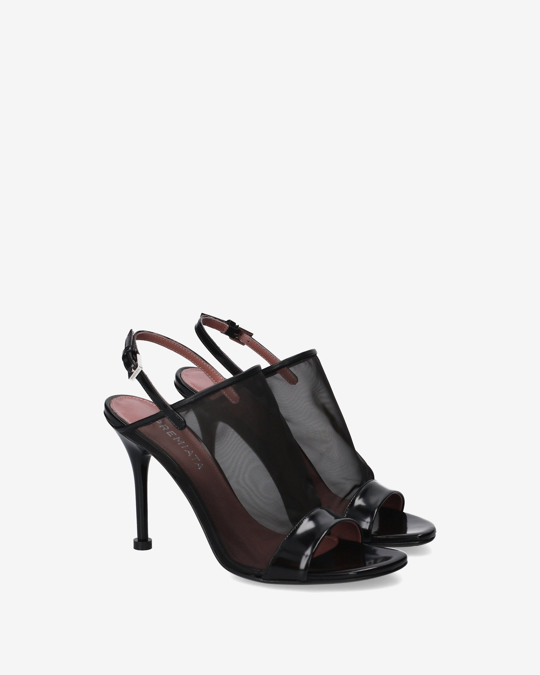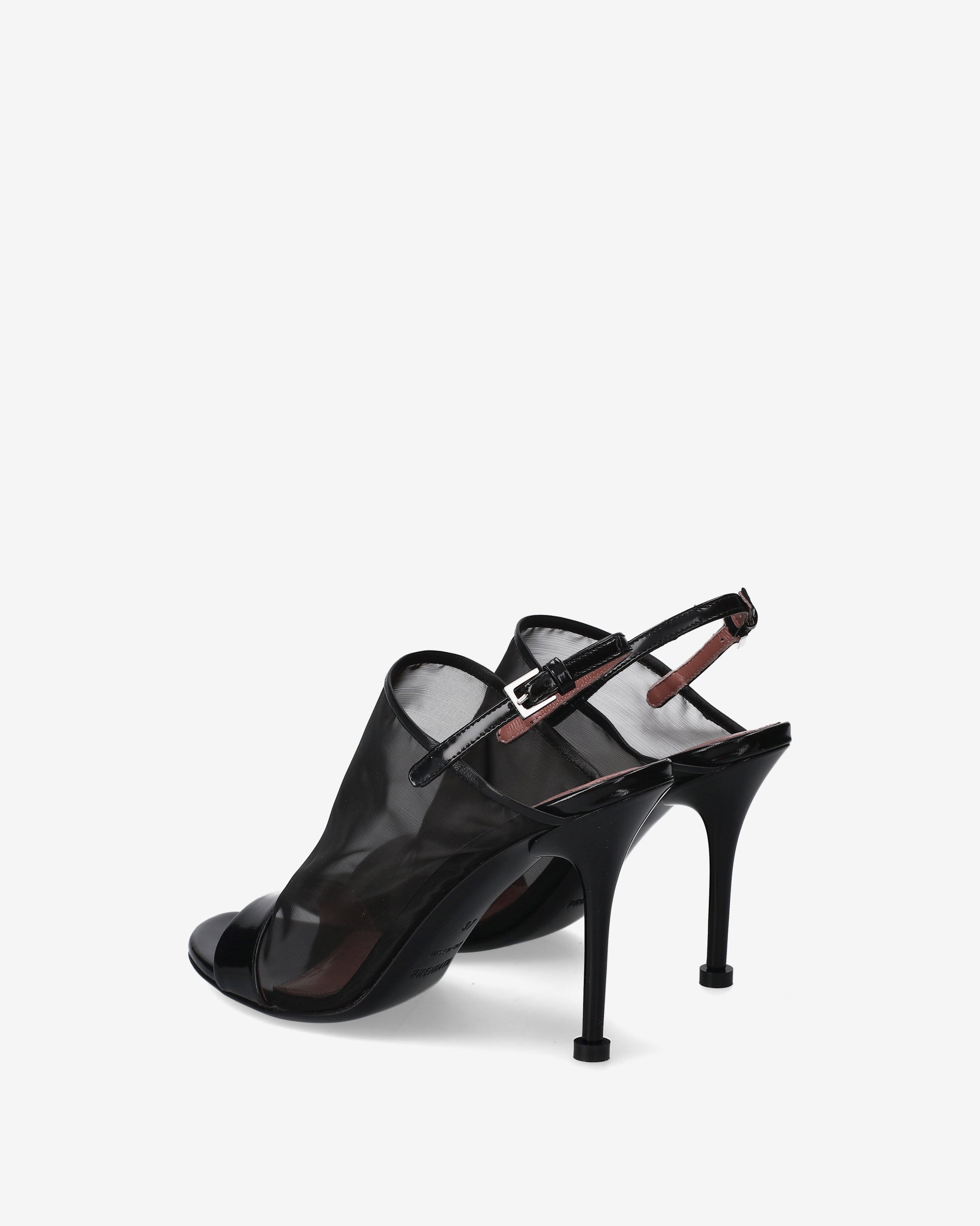 A sandal with a seductive, contemporary aesthetic that plays with transparency and contrasting materials. The combination of technical mesh and patent leather creates a refined, bold design, perfect for evening occasions or avant-garde formal looks.