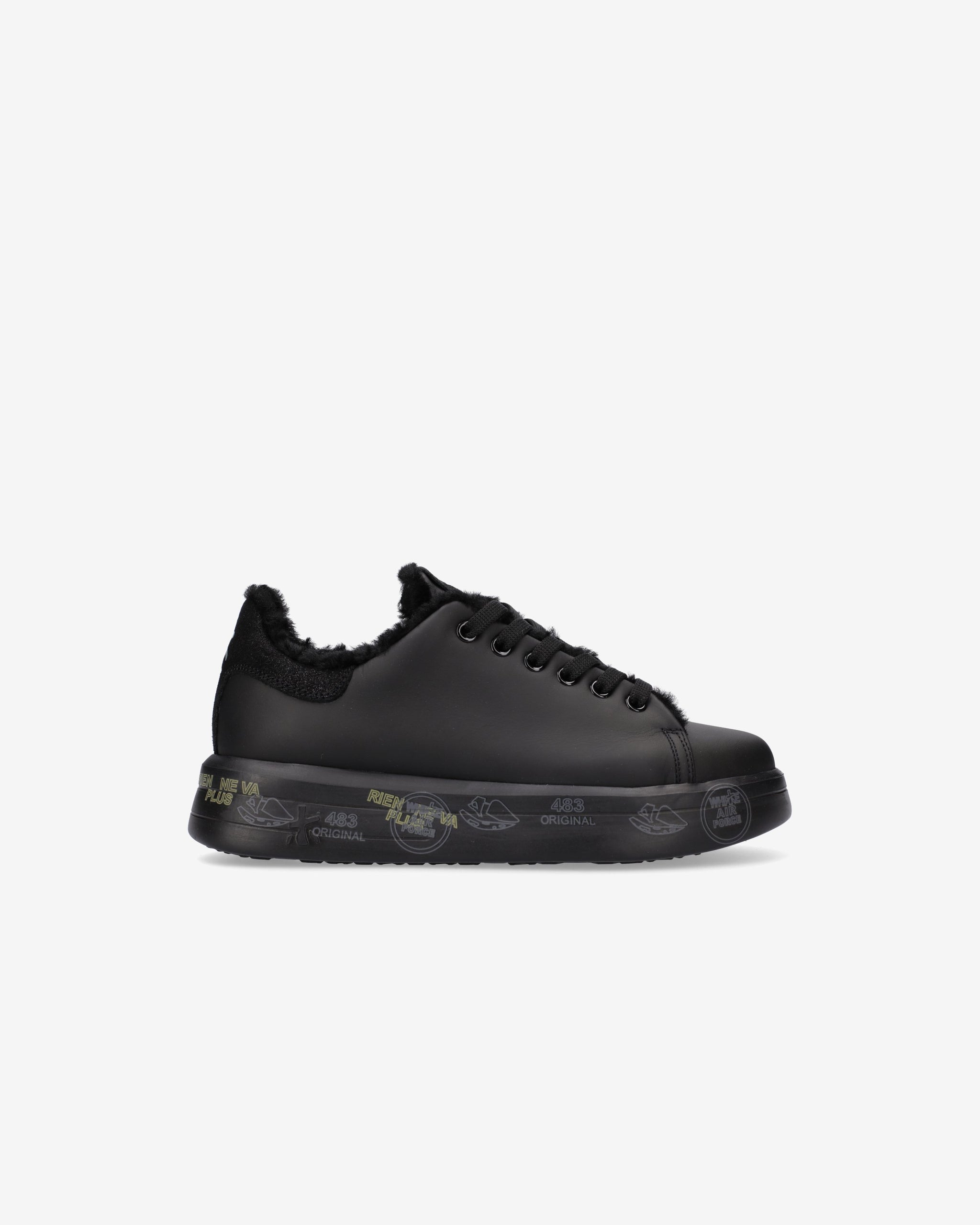 Sneakers in pelle nera foderate in montone con punta arrotondata e dettaglio ton sur ton. Logo Premiata sulla linguetta e sul tallone. Suola oversize in gomma caratterizzata dai leggendari timbri che contraddistinguono l'unicità del Brand.