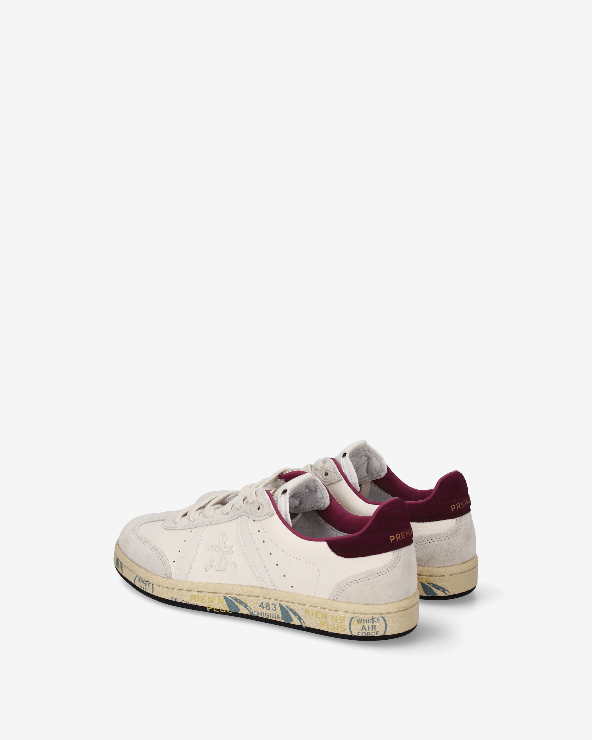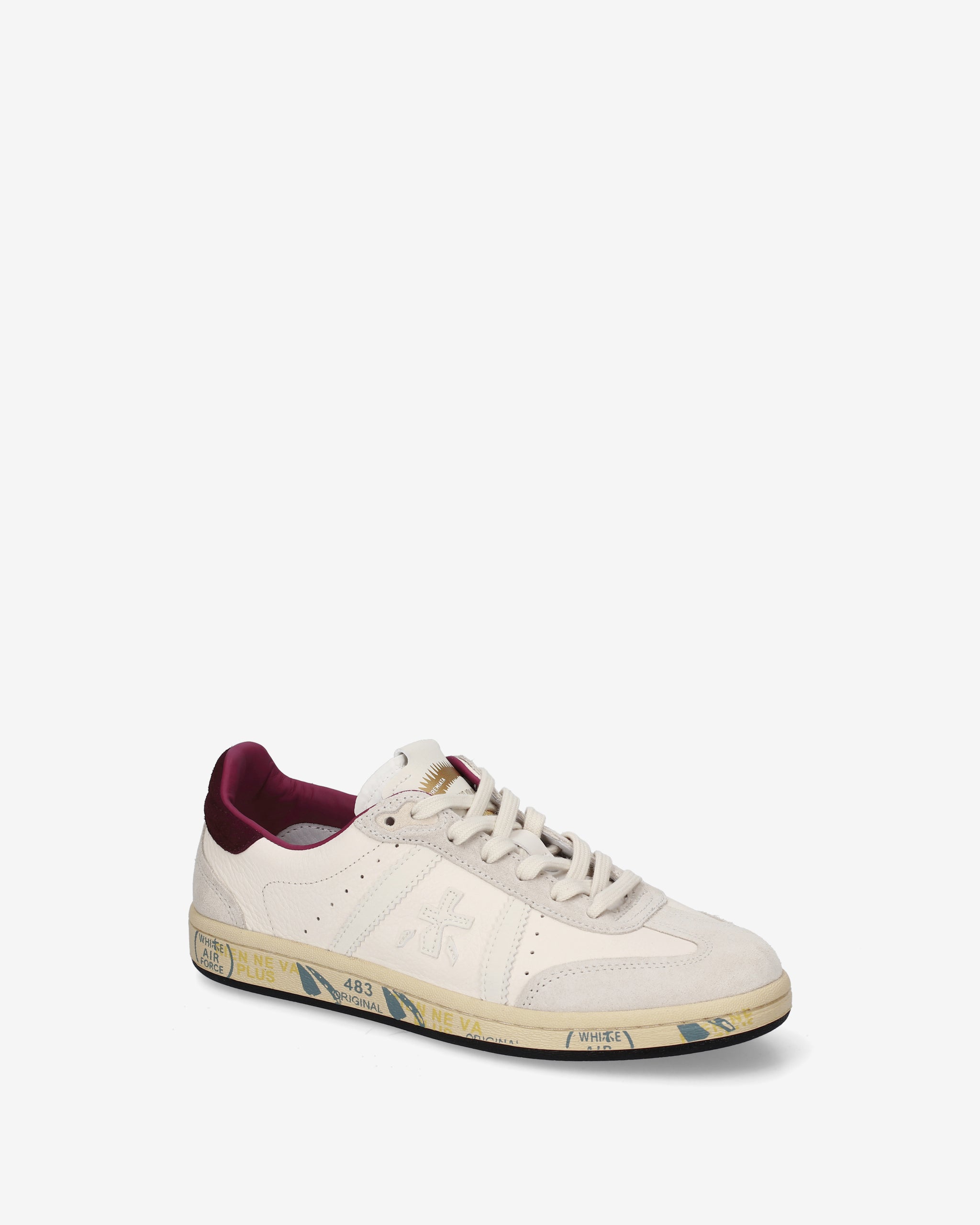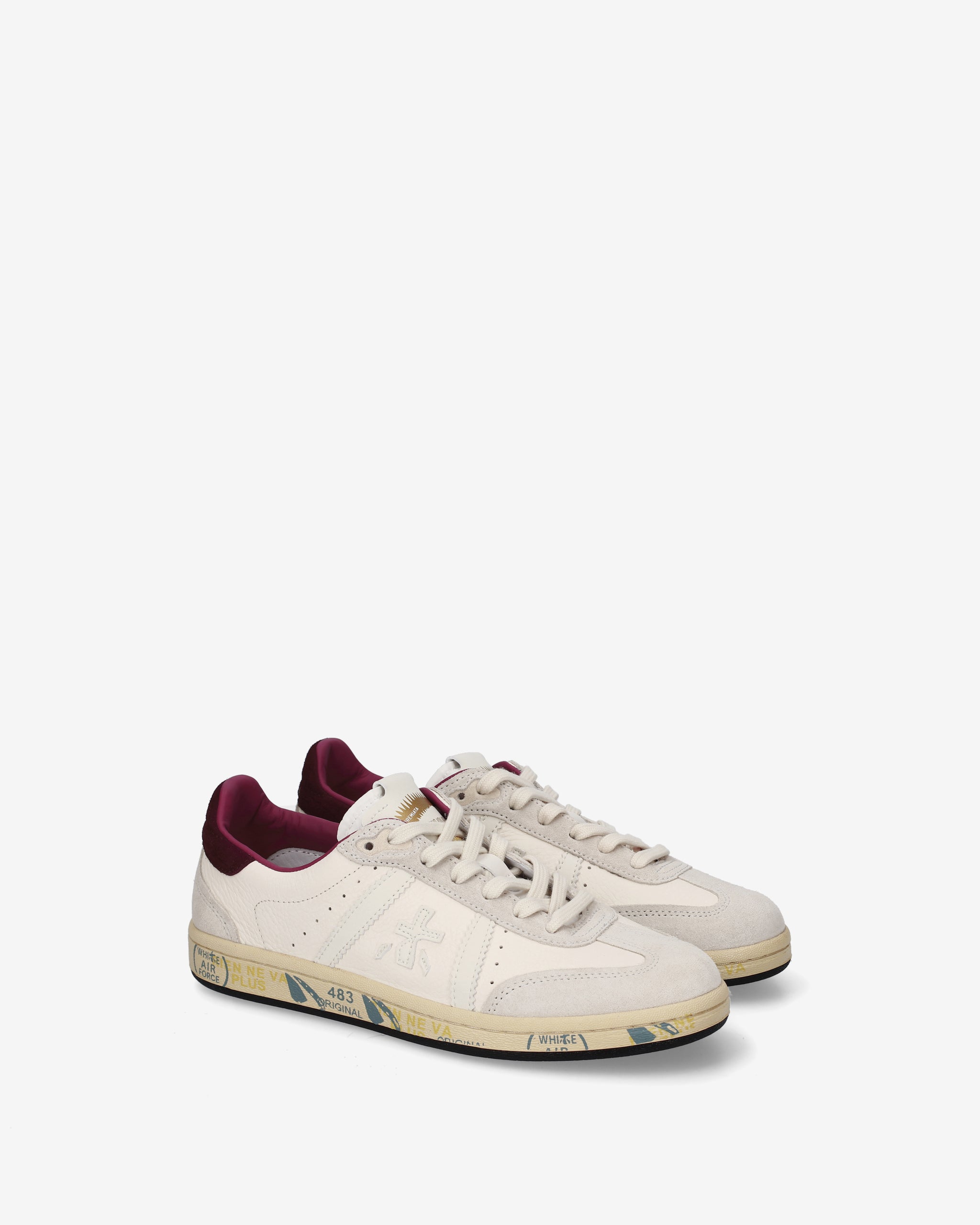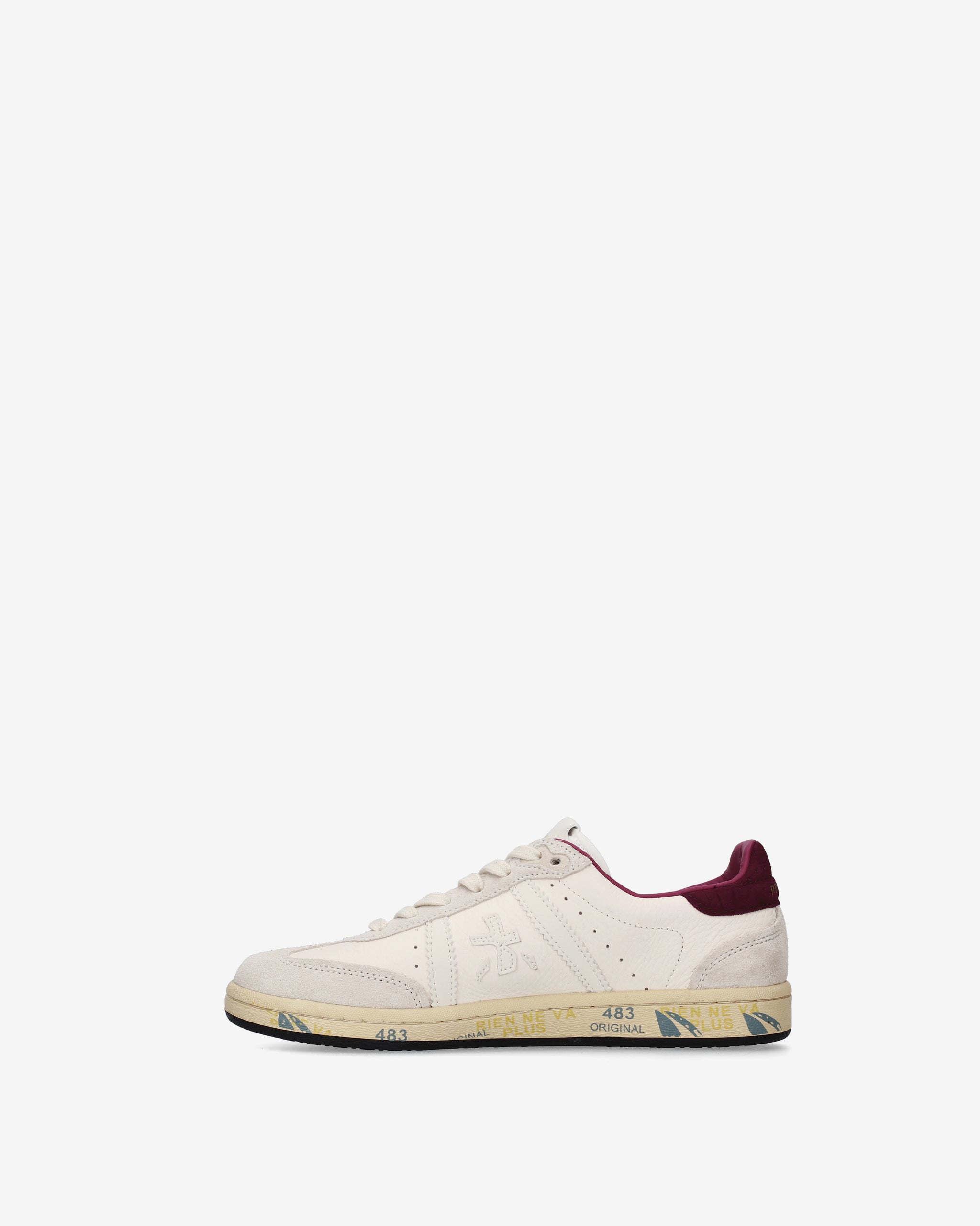 Sneaker casual dal look fresco e dinamico, con tomaia bianca e inserti beige e rossi a contrasto. La suola, decorata con i distintivi timbri del brand, aggiunge un tocco grafico e riconoscibile, perfetta per uno stile urbano e versatile.