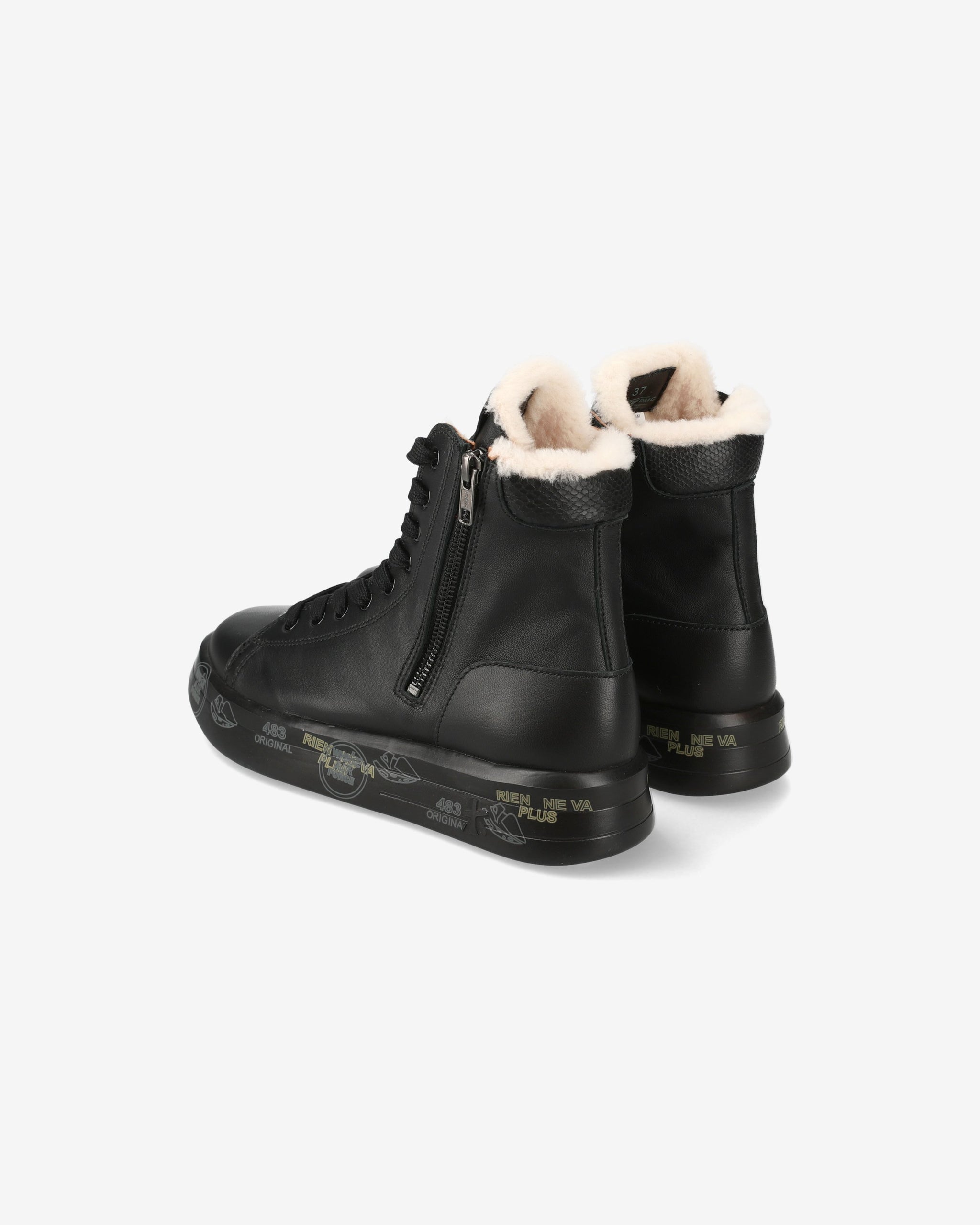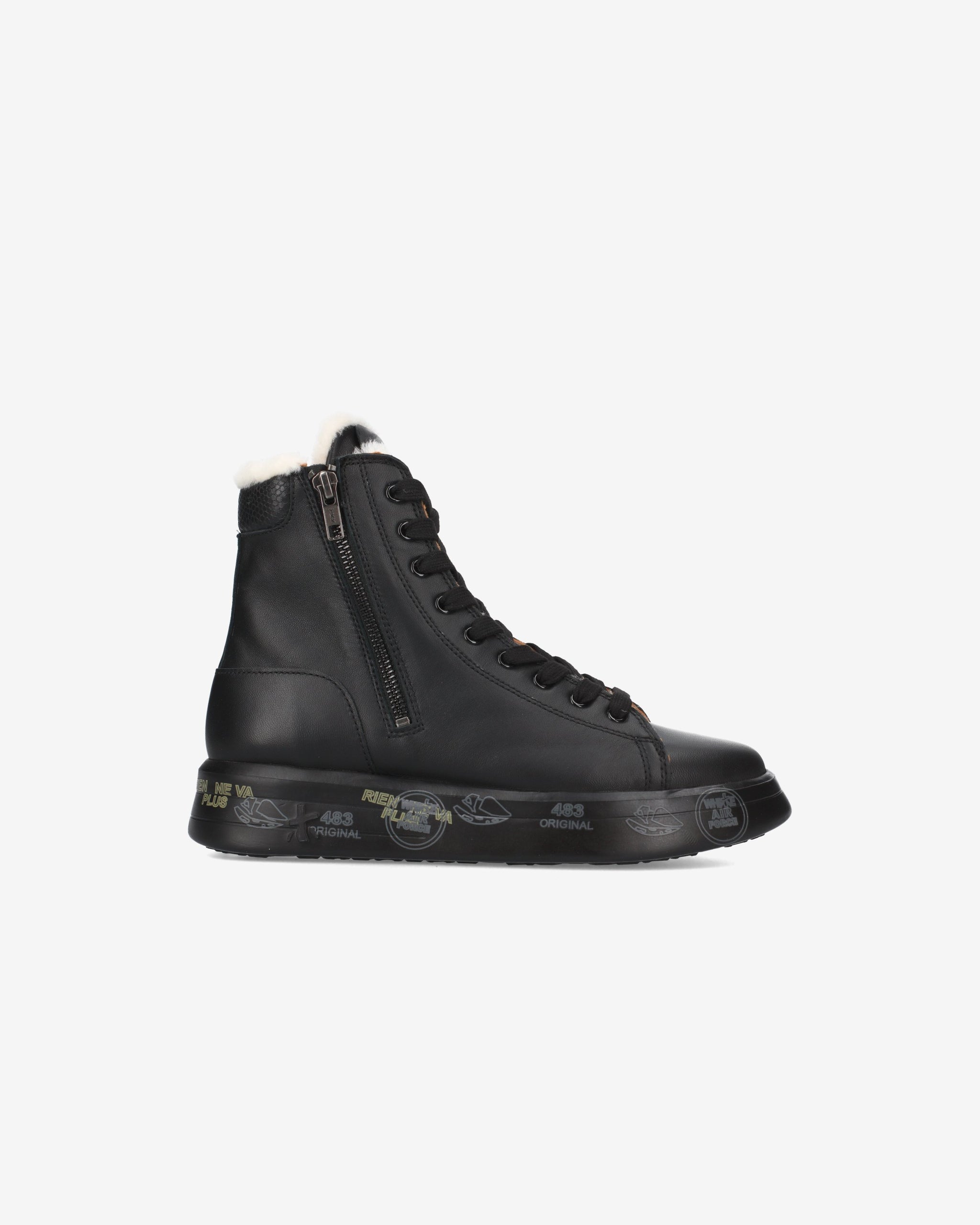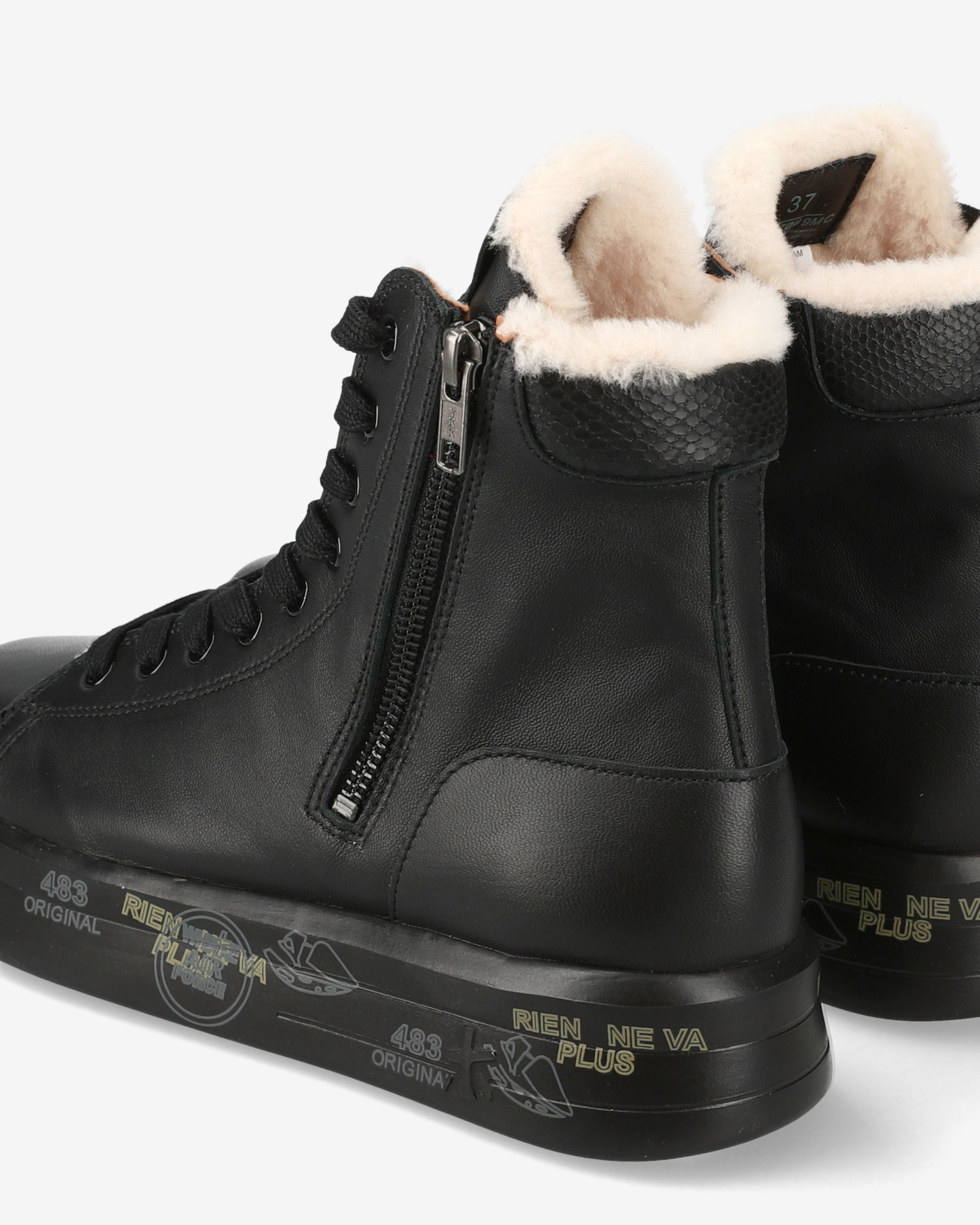 Sneakers in pelle nera con punta arrotondata e dettaglio in pelle stampata. Logo Premiata sulla linguetta e sul tallone. Cerniera sul laterale e fodera in montone. Suola oversize in gomma caratterizzata dai leggendari timbri che contraddistinguono l'unicità del Brand.