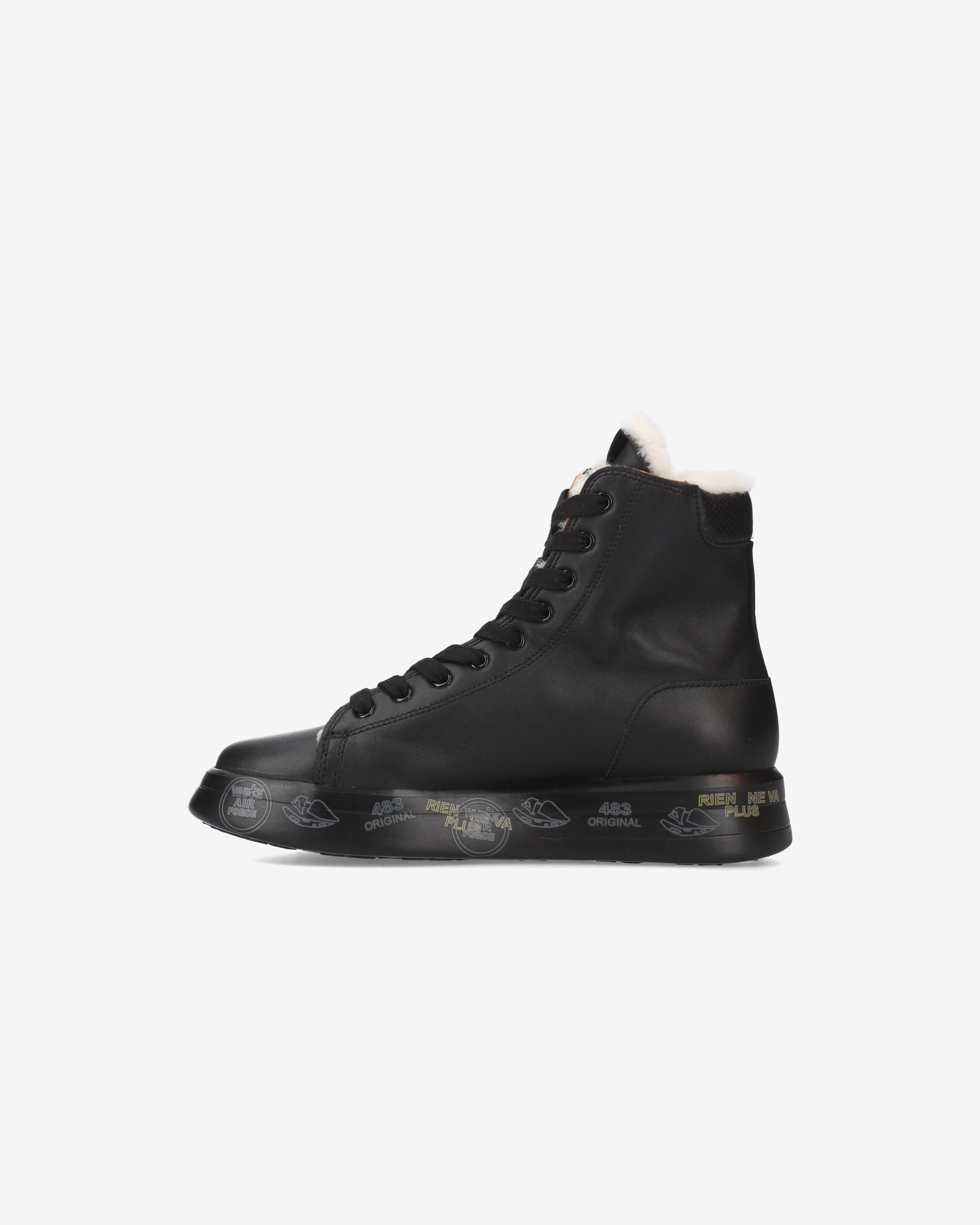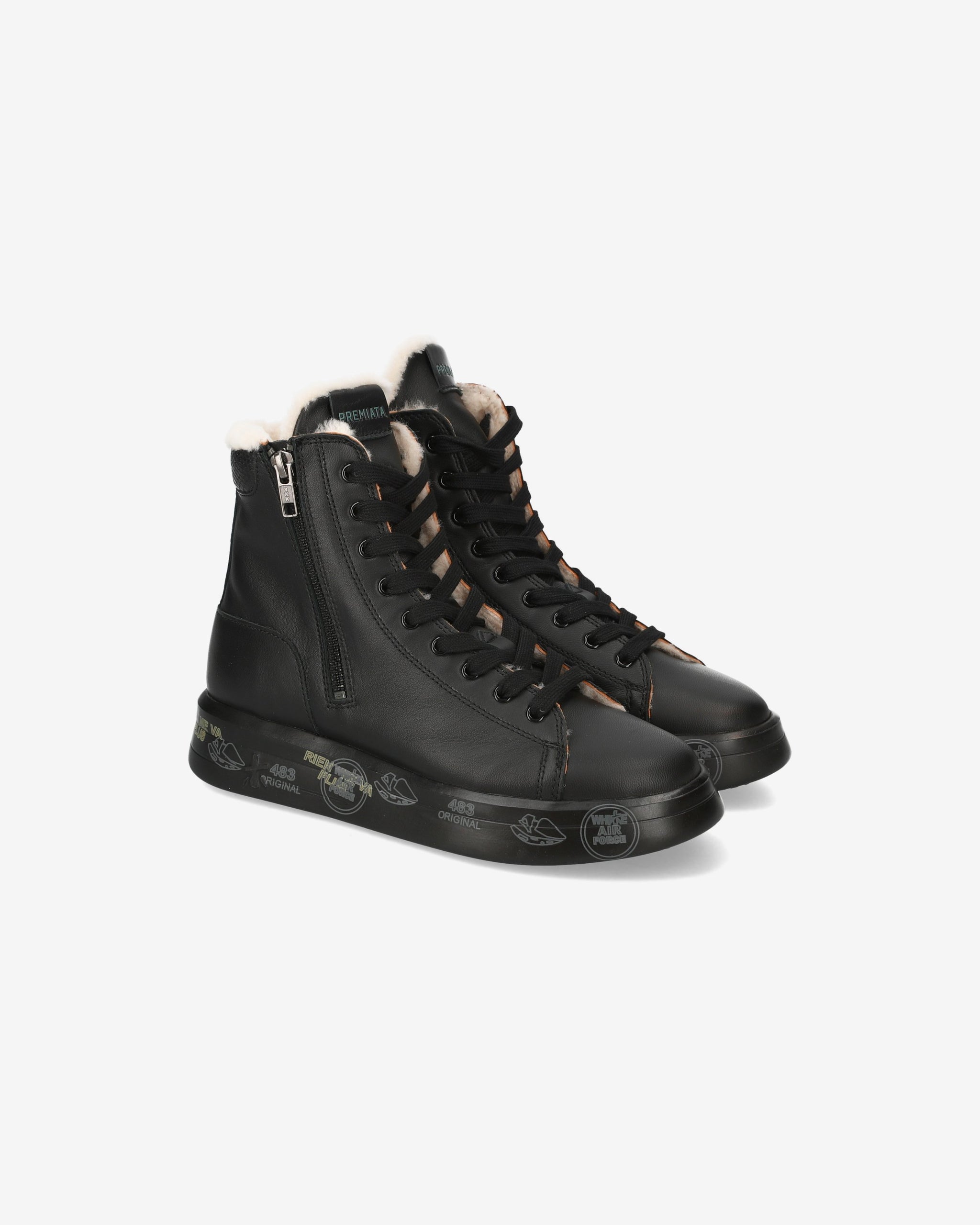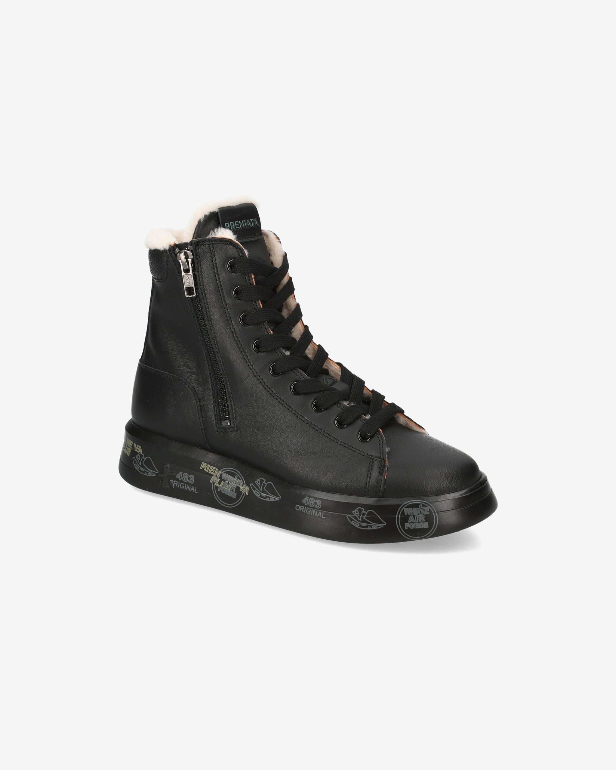 Sneakers in pelle nera con punta arrotondata e dettaglio in pelle stampata. Logo Premiata sulla linguetta e sul tallone. Cerniera sul laterale e fodera in montone. Suola oversize in gomma caratterizzata dai leggendari timbri che contraddistinguono l'unicità del Brand.