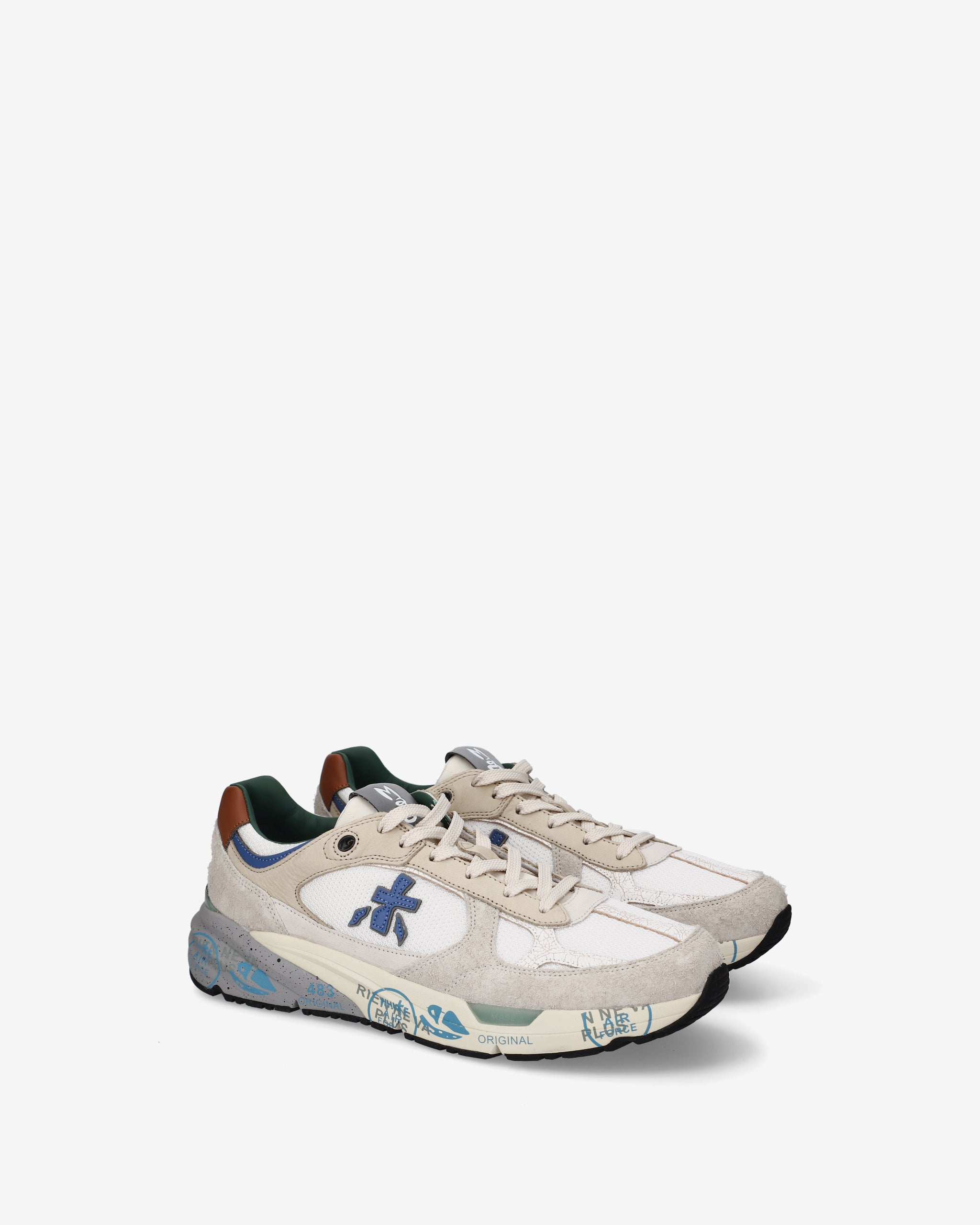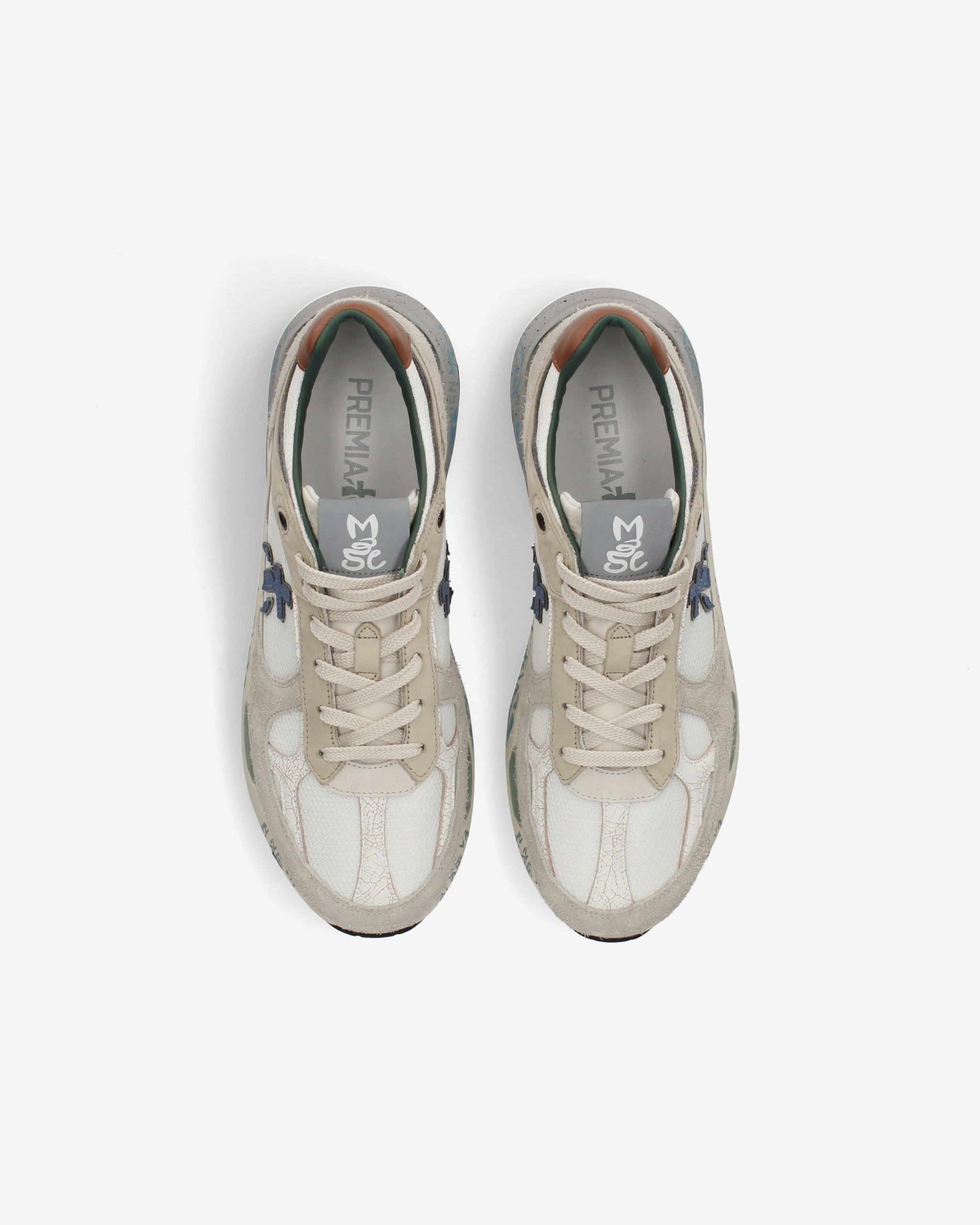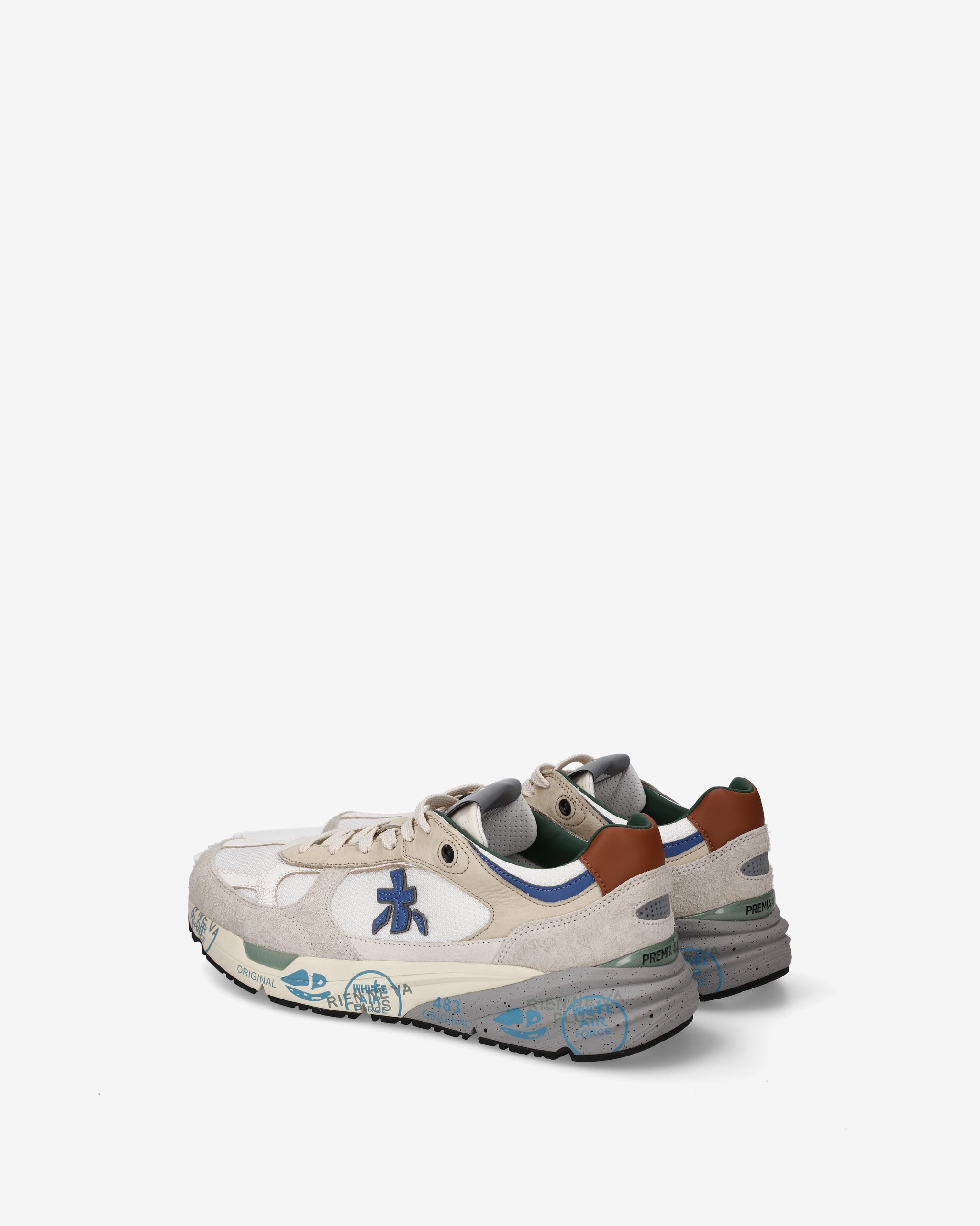 Risentono del mood nineties, combinano una silhouette moderna con materiali pregiati e dettagli vivaci. Fedeli al design Premiata, ne conservano tutti gli elementi chiave: il logo che decora i laterali, la scritta MASE che si evince sull’etichetta, trattamenti e dettagli a contrasto che ne risaltano la visibilità.