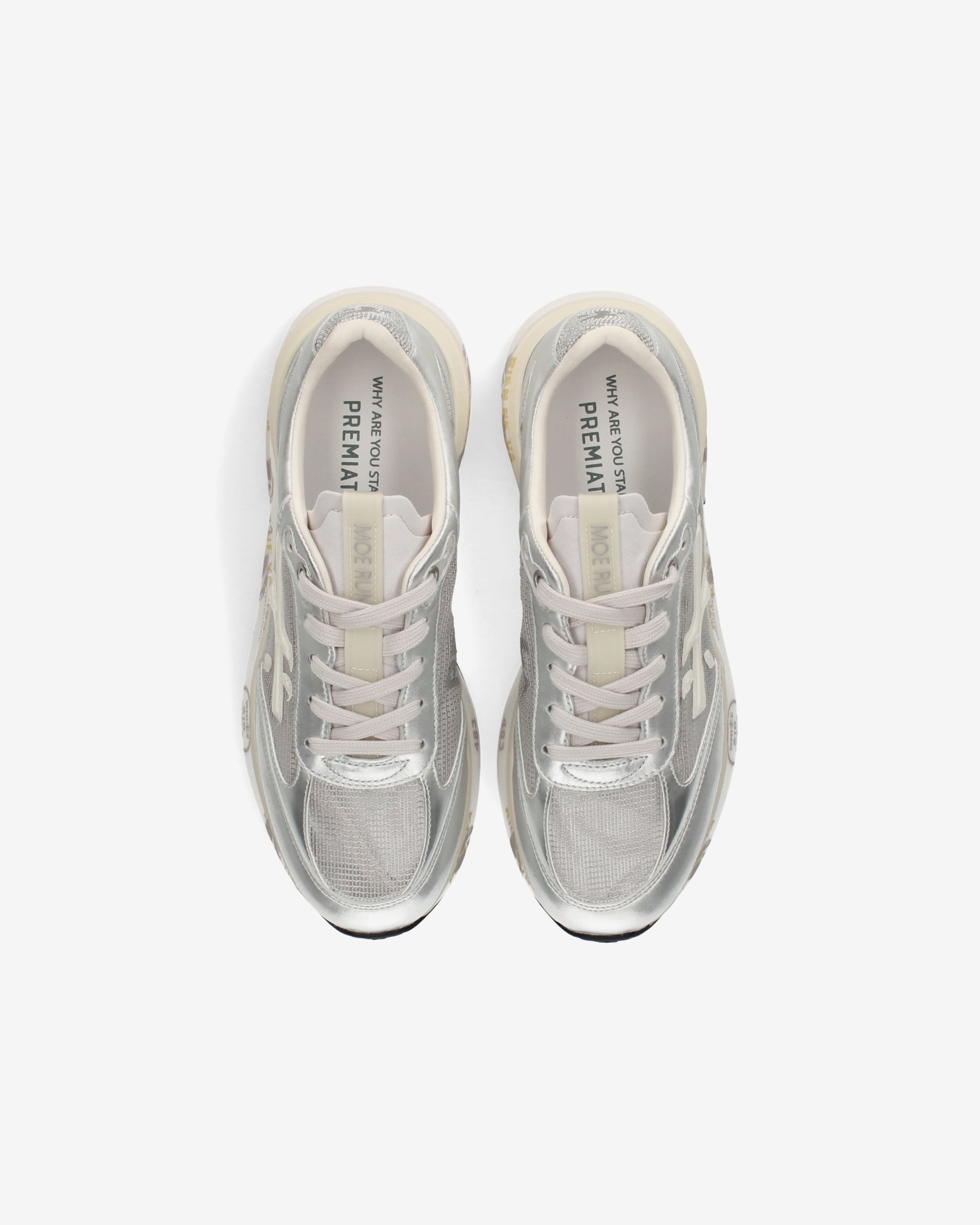 Ideate per stupire. La Moerun si basa sulla leggerezza del movimento, la stabilità e la sensazione ammortizzante data dall'innovazione del fondo. La nuova silhouette è ricca di dettagli: logo sul laterale esterno, scritta PREMIATA sul laterale interno e nome del modello sull'etichetta.